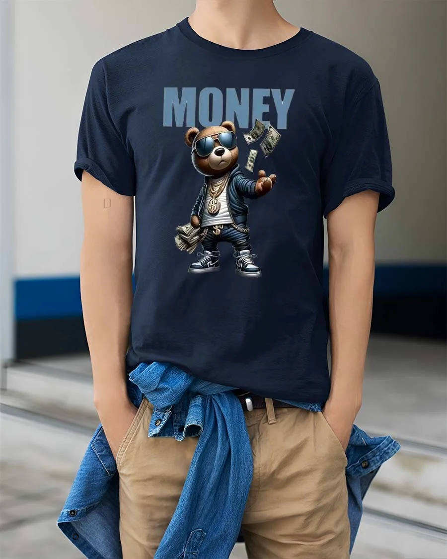 Made with comfort and everyday wear in mind, this money bear graphic t shirt offers a soft feel and vibrant print that keeps the artwork sharp and lively.
