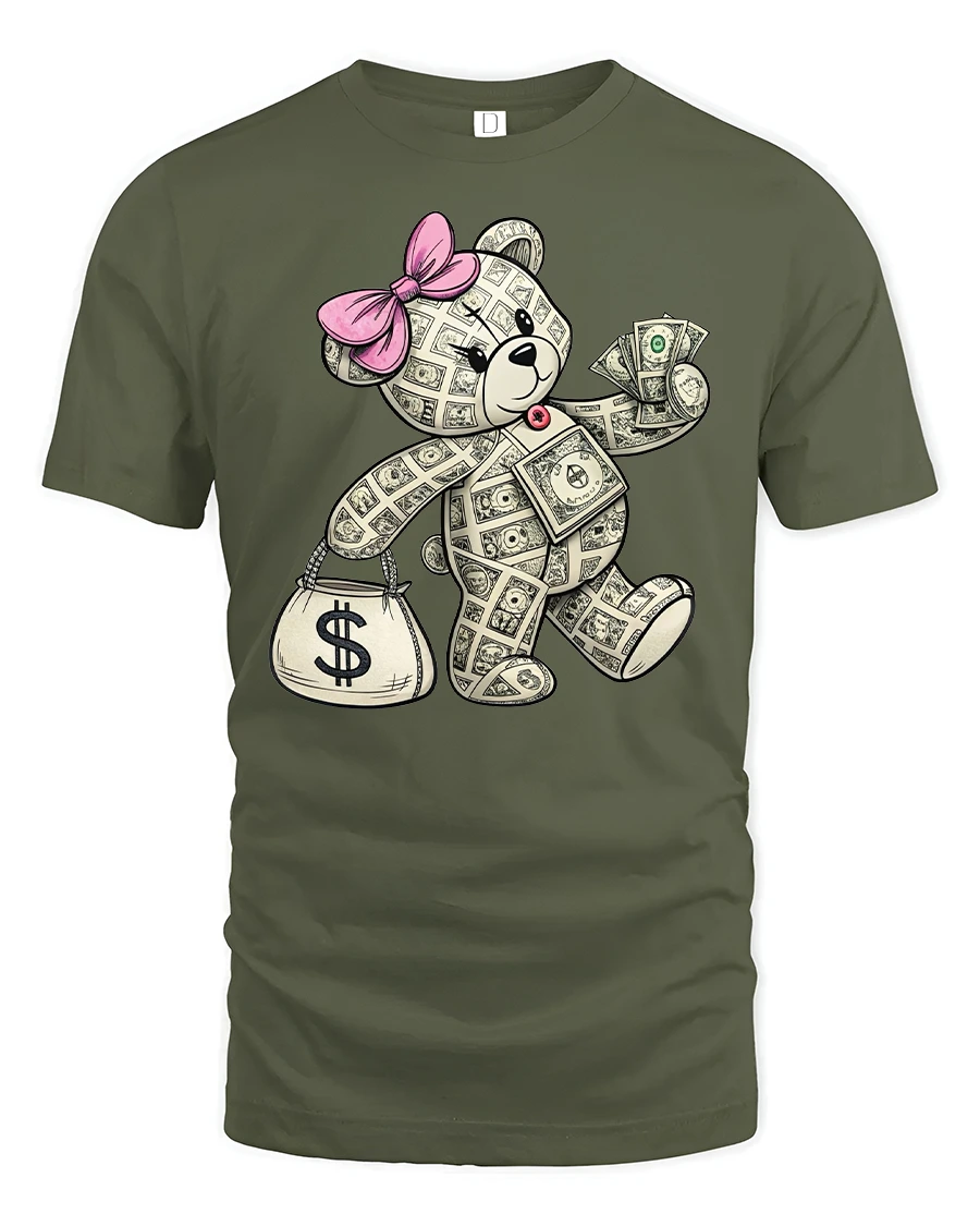 Show off your playful side with the Funny Money Teddy Bear Graphic Tee with Dollar Art. This design features a charming teddy bear made of dollar bills, holding a money bag and rocking a cute pink bow. It’s a bold mix of humor and style, perfect for those who love to combine fun with fashion.