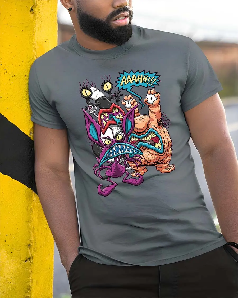 Funny Monster Battle Graphic T Shirt Cartoon Fight Art Tee - model wearing grey tee, leaning on column