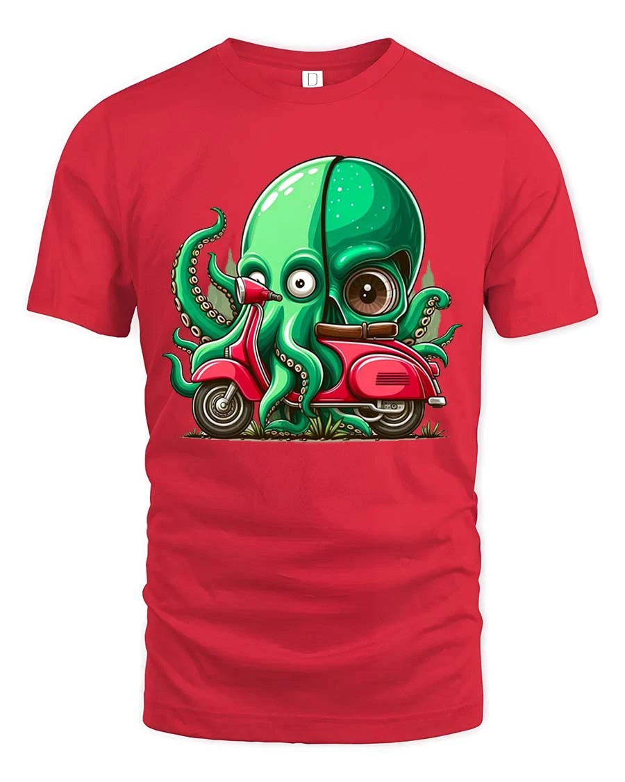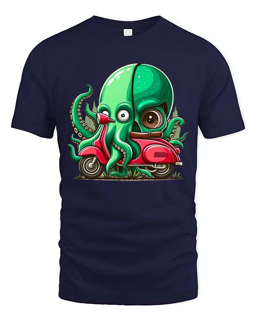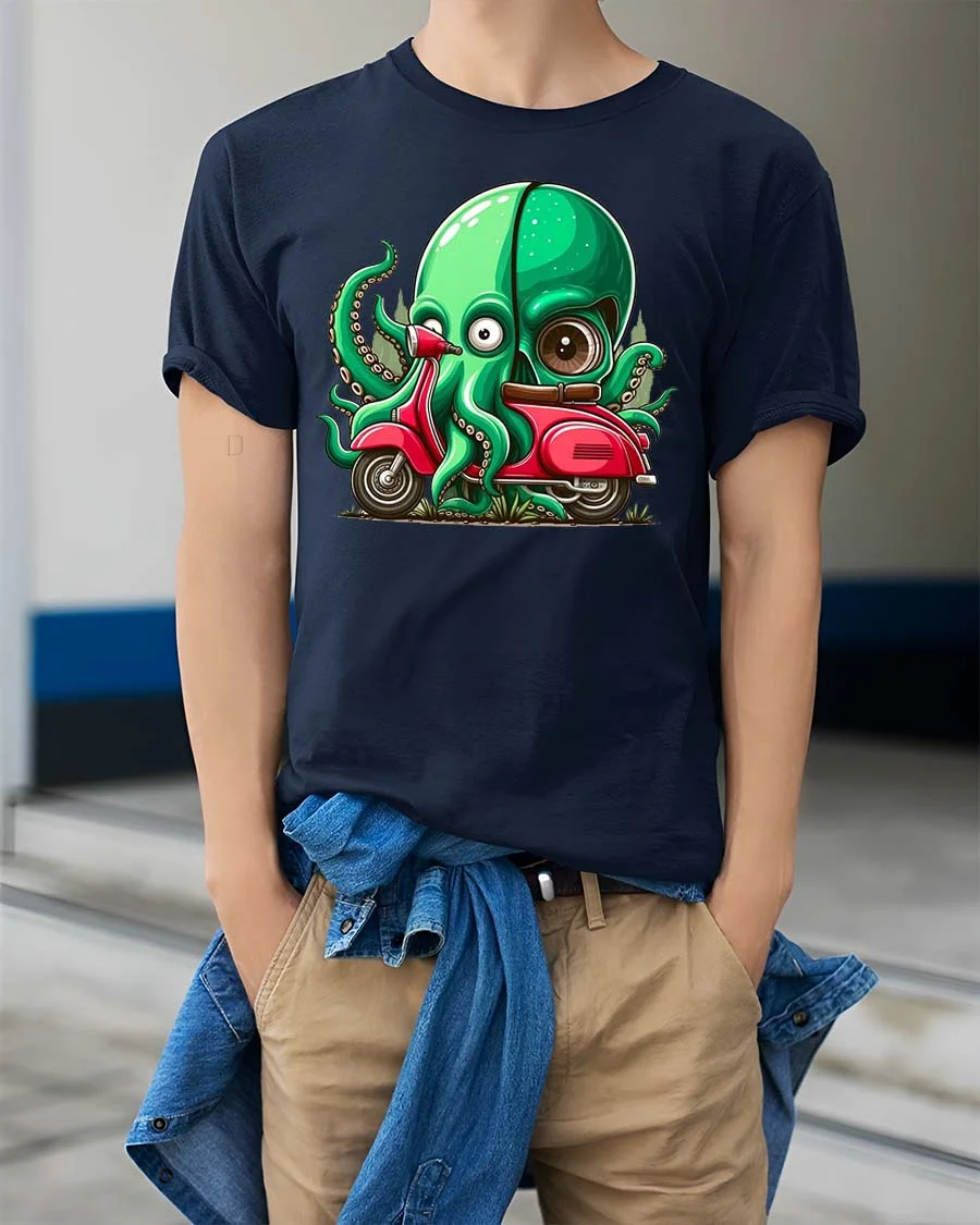 Featuring a quirky octopus cruising on a scooter, this graphic tshirt combines humor and creativity in a way that instantly catches attention.