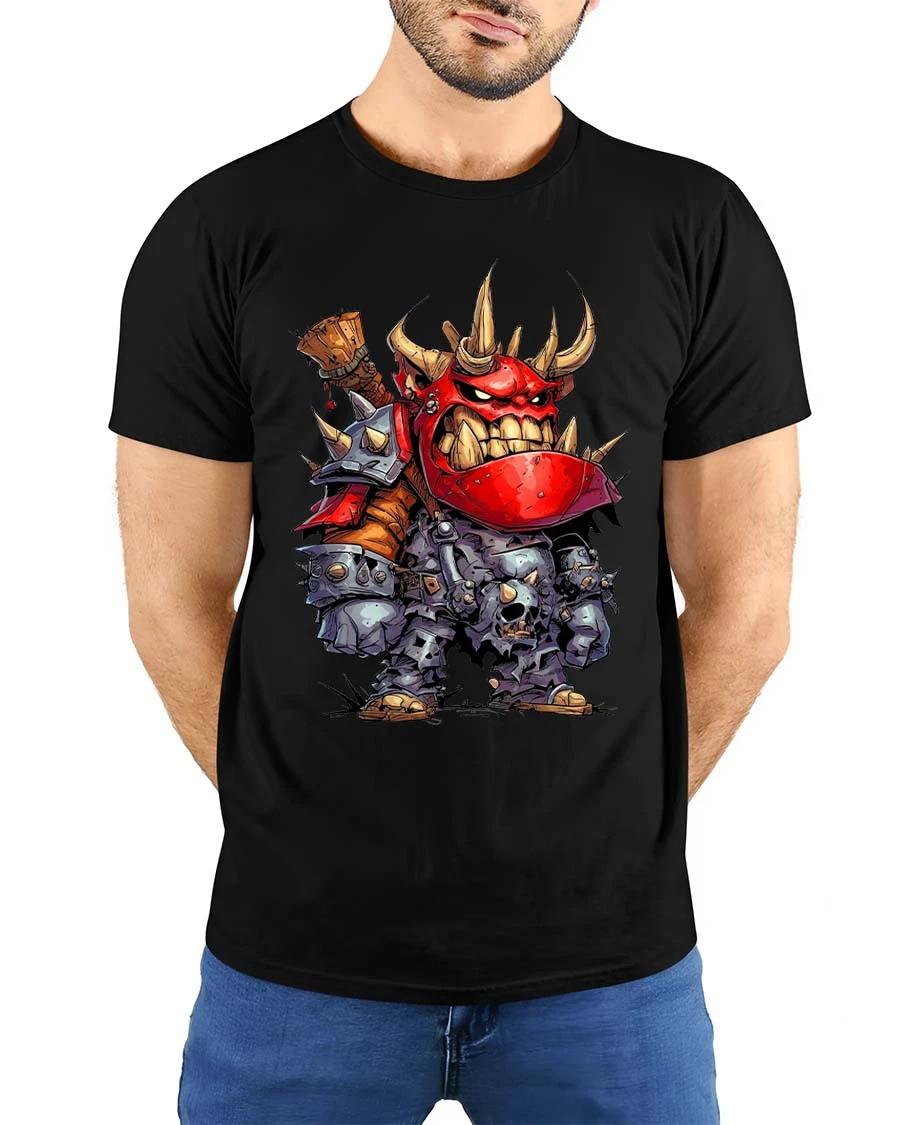Featuring a fierce yet playful orc warrior in heavy armor with exaggerated cartoon details, this graphic brings a fun twist to classic fantasy battle themes.