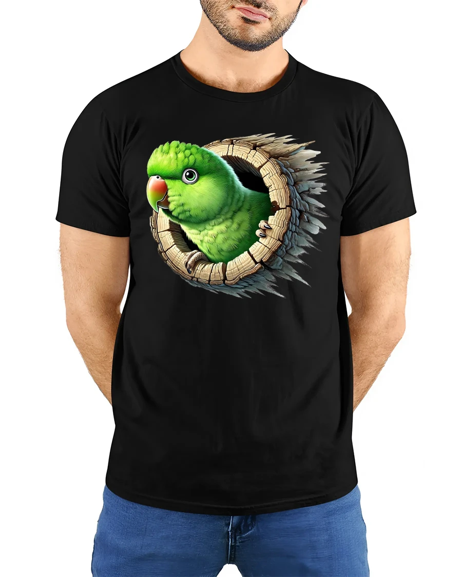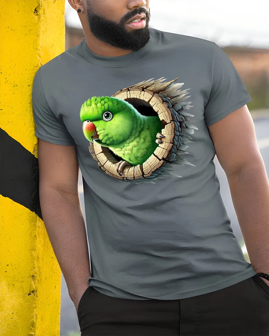 The Funny Parrot Peek Out 3D Hole Graphic Printed Tee is not only stylish but also versatile. Pair it with jeans, shorts, or casual wear for a relaxed yet bold look. Whether you’re headed to a tropical getaway, a bird show, or just want a unique conversation starter, this parrot shirt delivers in both comfort and charm.