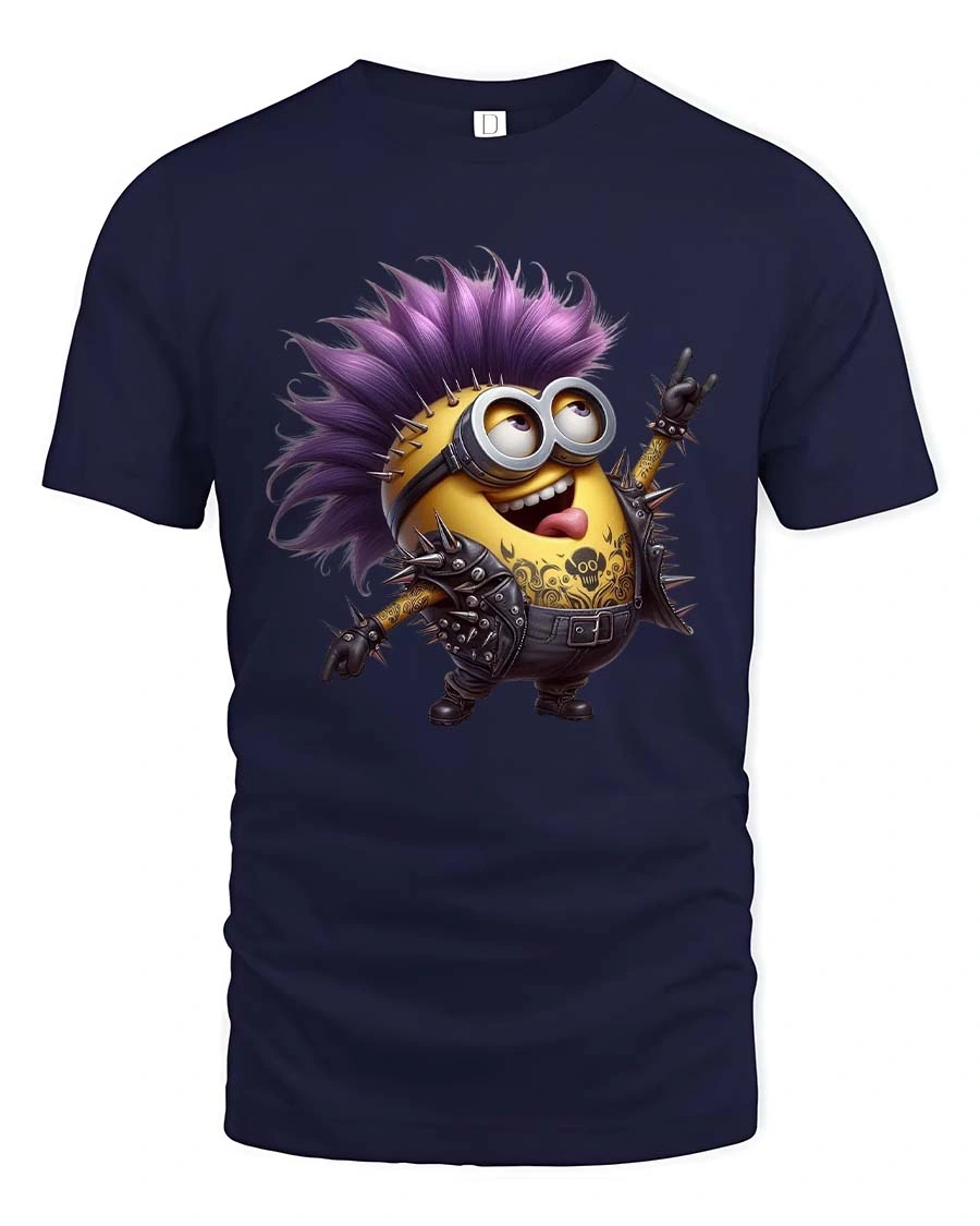 This design features a mischievous cartoon character with wild spiky hair, studded punk jacket, and rock hand gesture, creating a fun and rebellious vibe inspired by classic punk rock culture.
