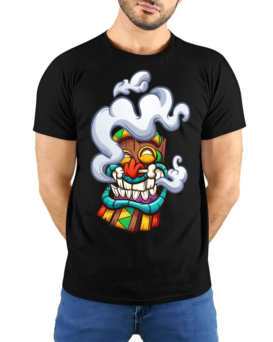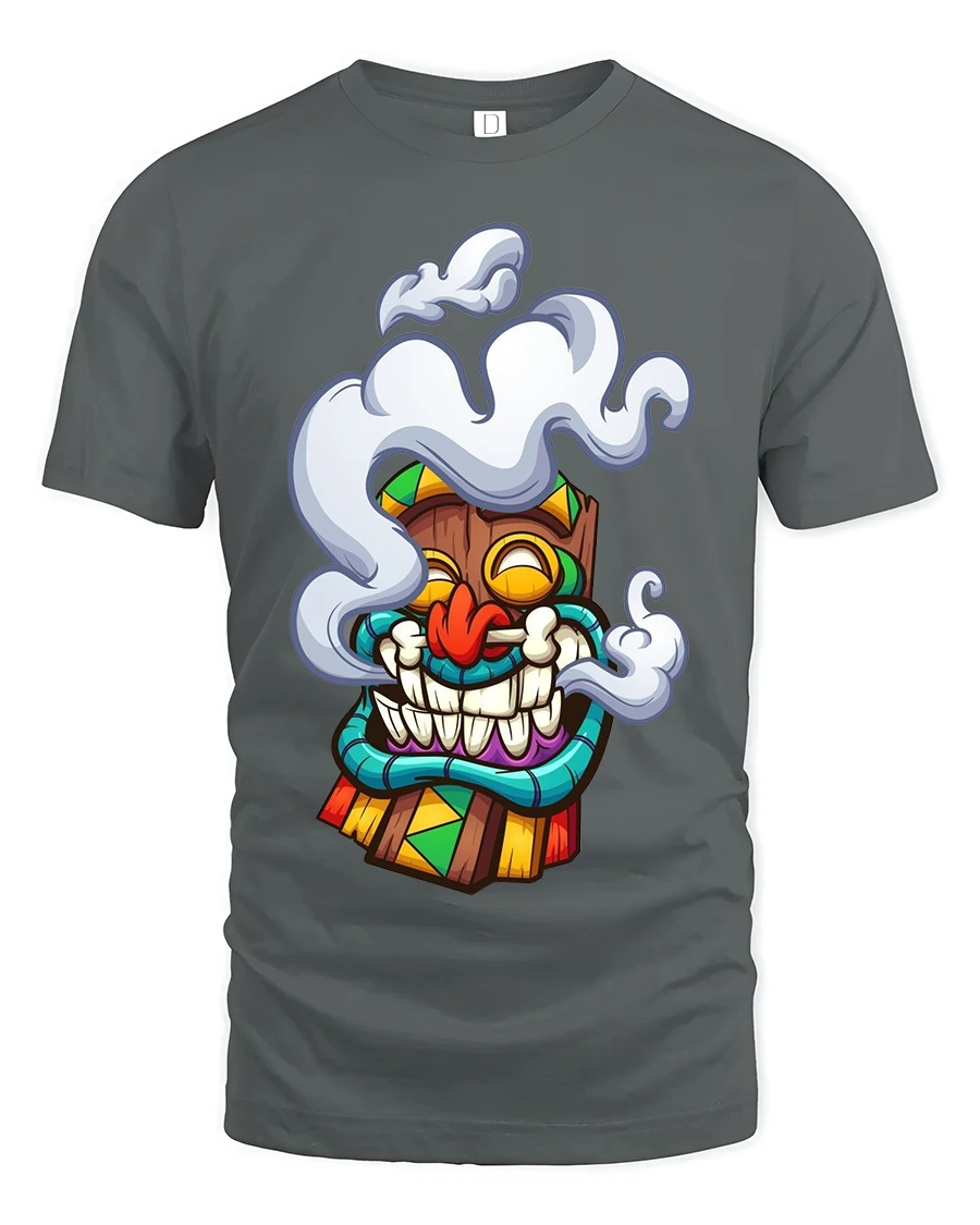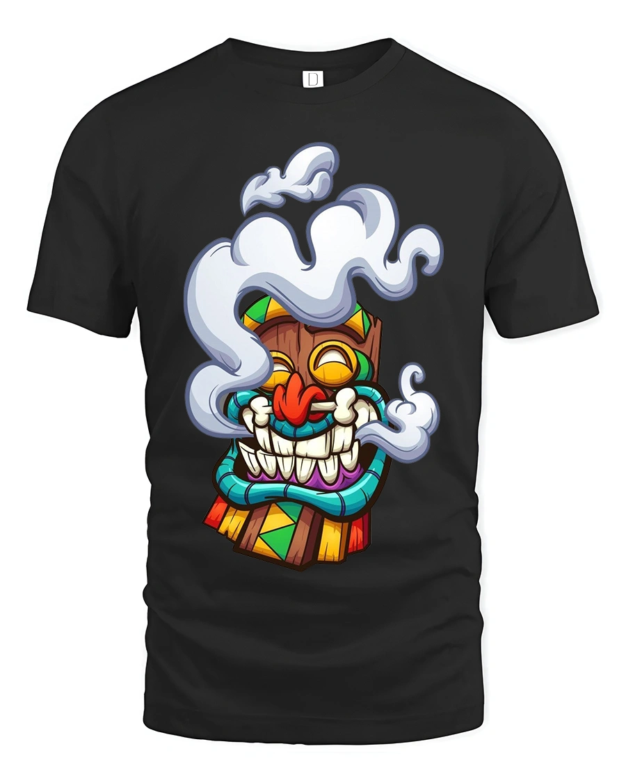 The Funny Smoking Tiki Mask Cartoon Tribal Art Graphic T Shirt is perfect for expressing a laid back attitude and love for playful art.