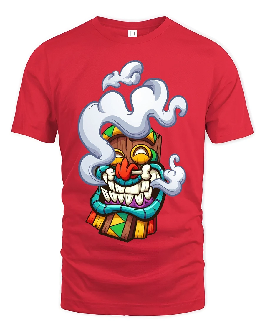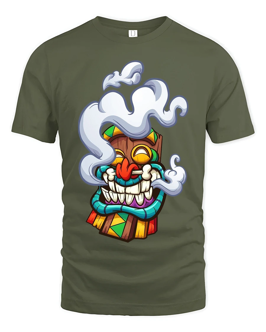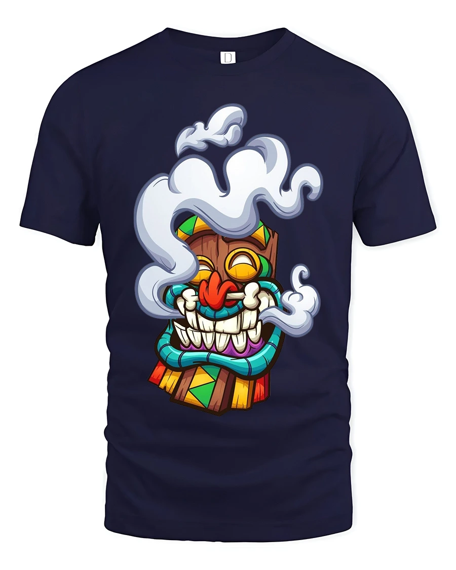 The Funny Smoking Tiki Mask Cartoon Tribal Art Graphic T Shirt brings island vibes and playful humor together in one eye catching design.