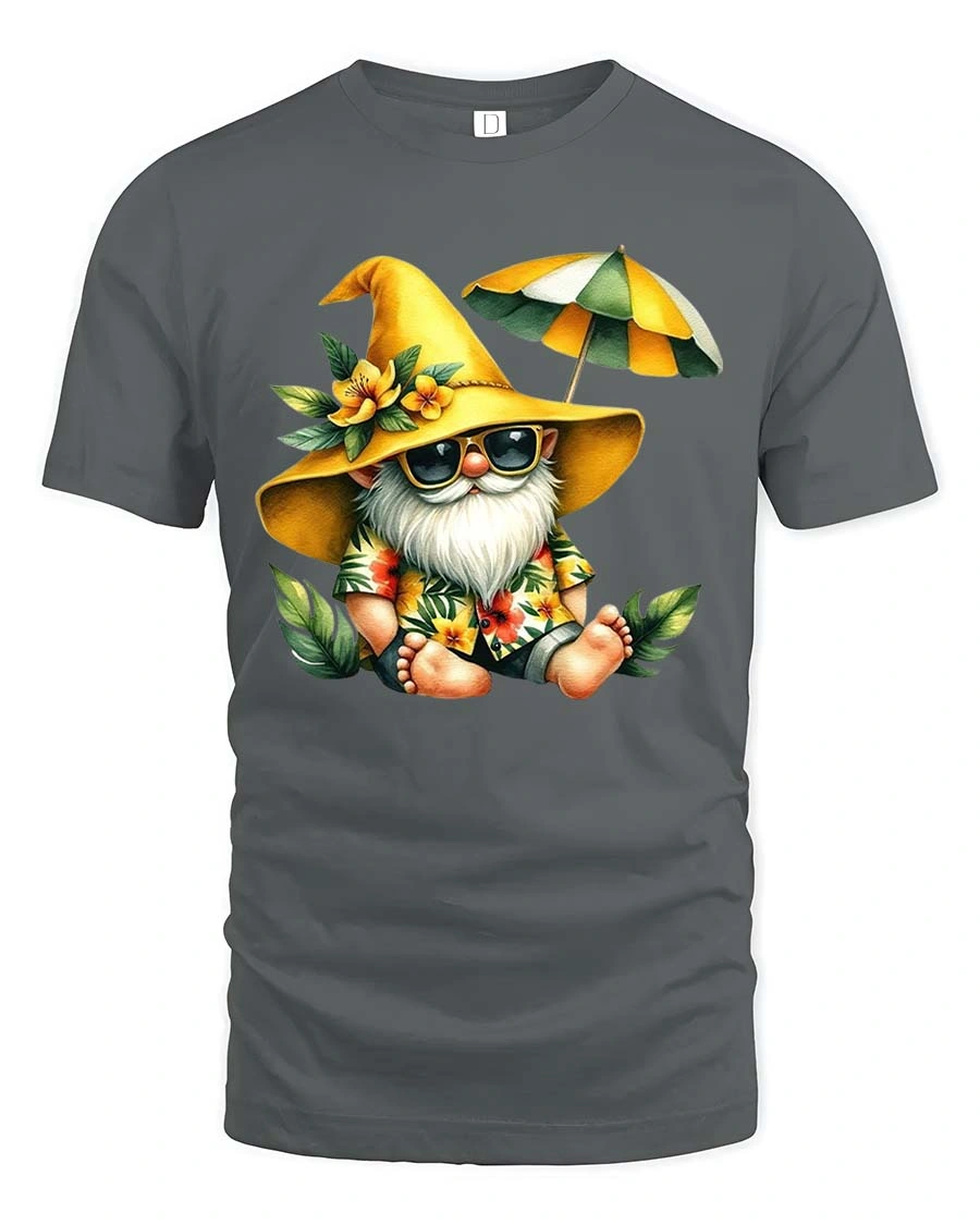 Funny Summer Gnome Beach Graphic T Shirt Cute Vacation Gnome Tee features a charming and relaxed gnome enjoying a sunny beach vibe with sunglasses, a floral shirt, and a wide hat.