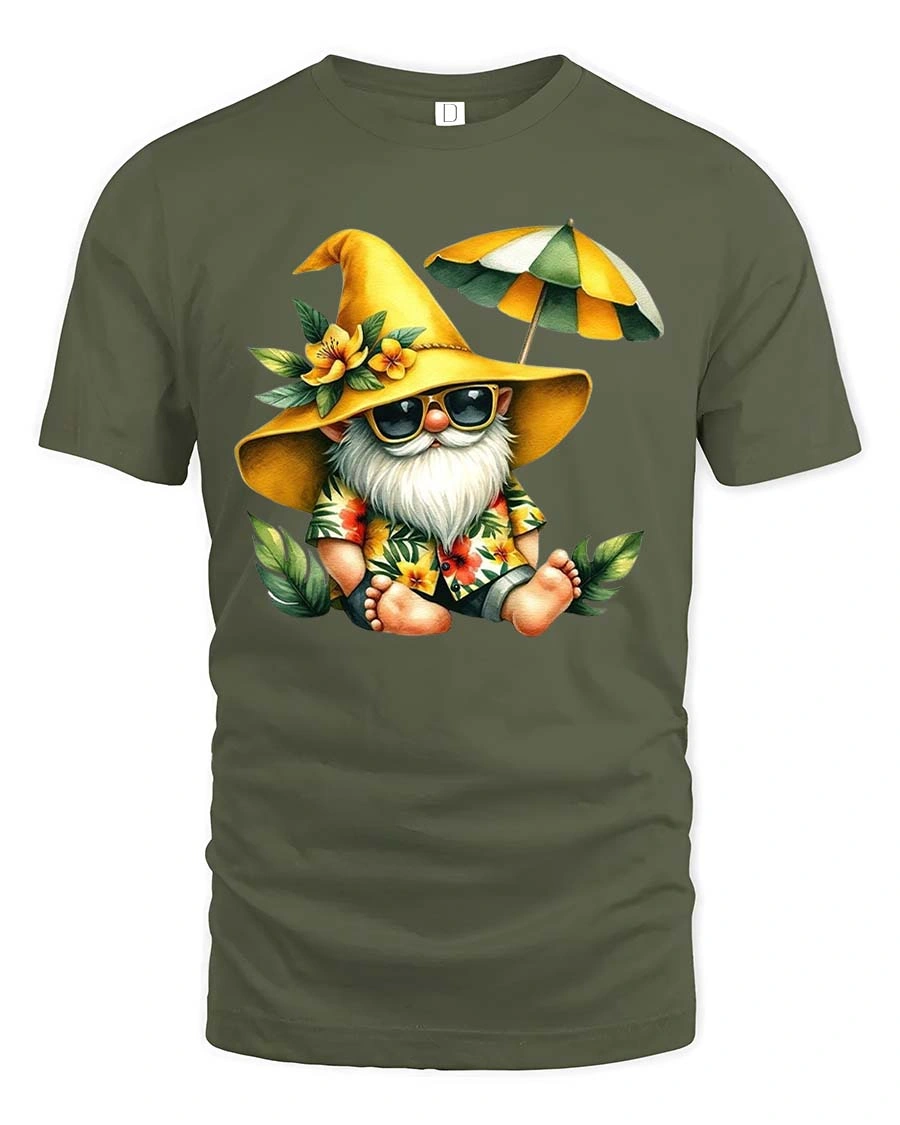 Funny Summer Gnome Beach Graphic T Shirt Cute Vacation Gnome Tee - military green t-shirt on white background