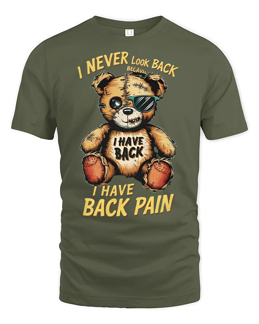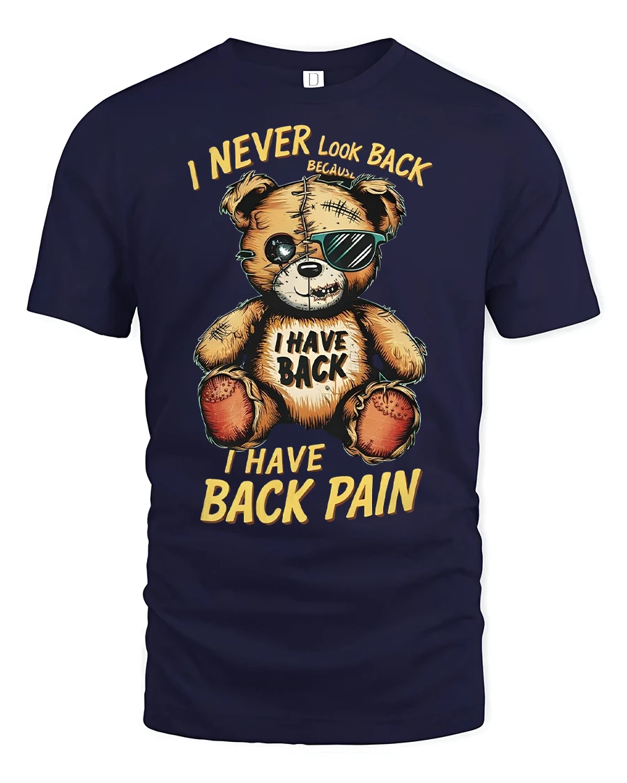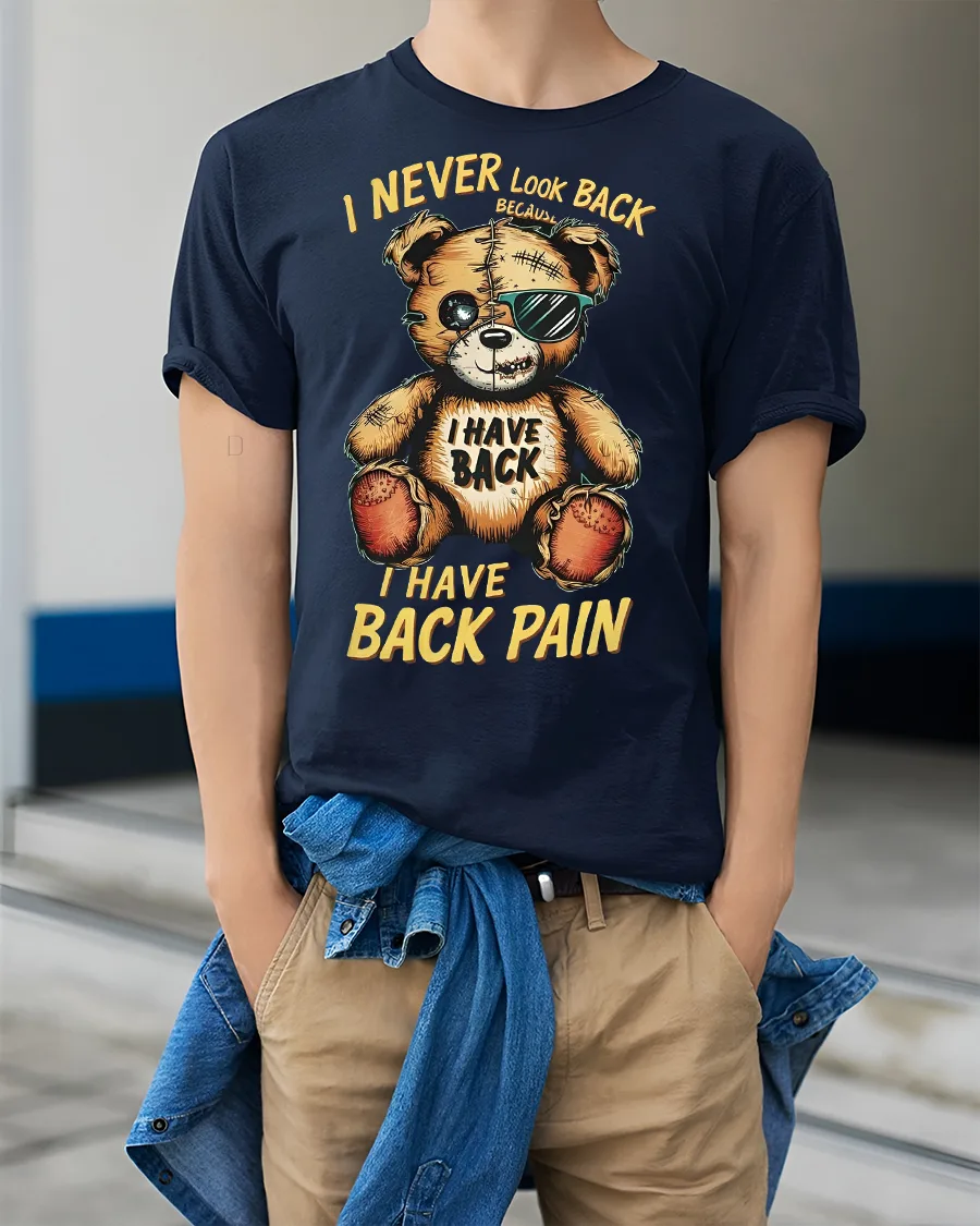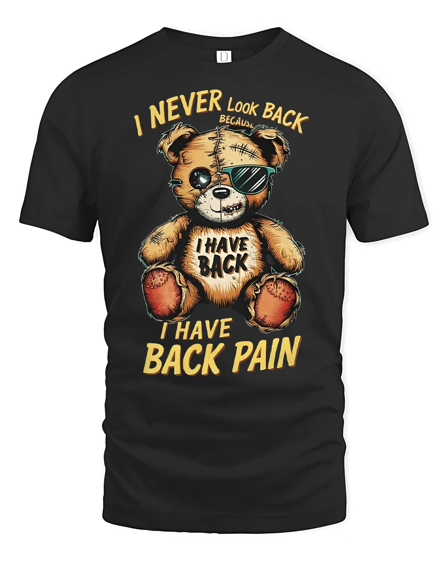 Add a touch of humor to your wardrobe with the Funny Teddy Bear Back Pain Quote Printed T-Shirt. This unique tee features a rugged teddy bear wearing shades and stitched-up details, alongside the hilarious quote “I Never Look Back Because I Have Back Pain.” It’s the perfect shirt for anyone who appreciates sarcastic humor, funny novelty graphics, and playful fashion.