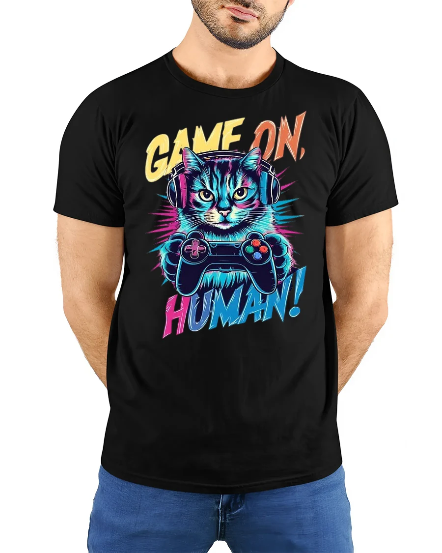 Show off your playful side and geeky vibe with the Game On Human Funny Cat Gamer Graphic T-Shirt. It also makes a fantastic gift for friends who can’t get enough of video games and cats. Pair it with jeans, hoodies, or joggers for a casual, cool, and fun look.
