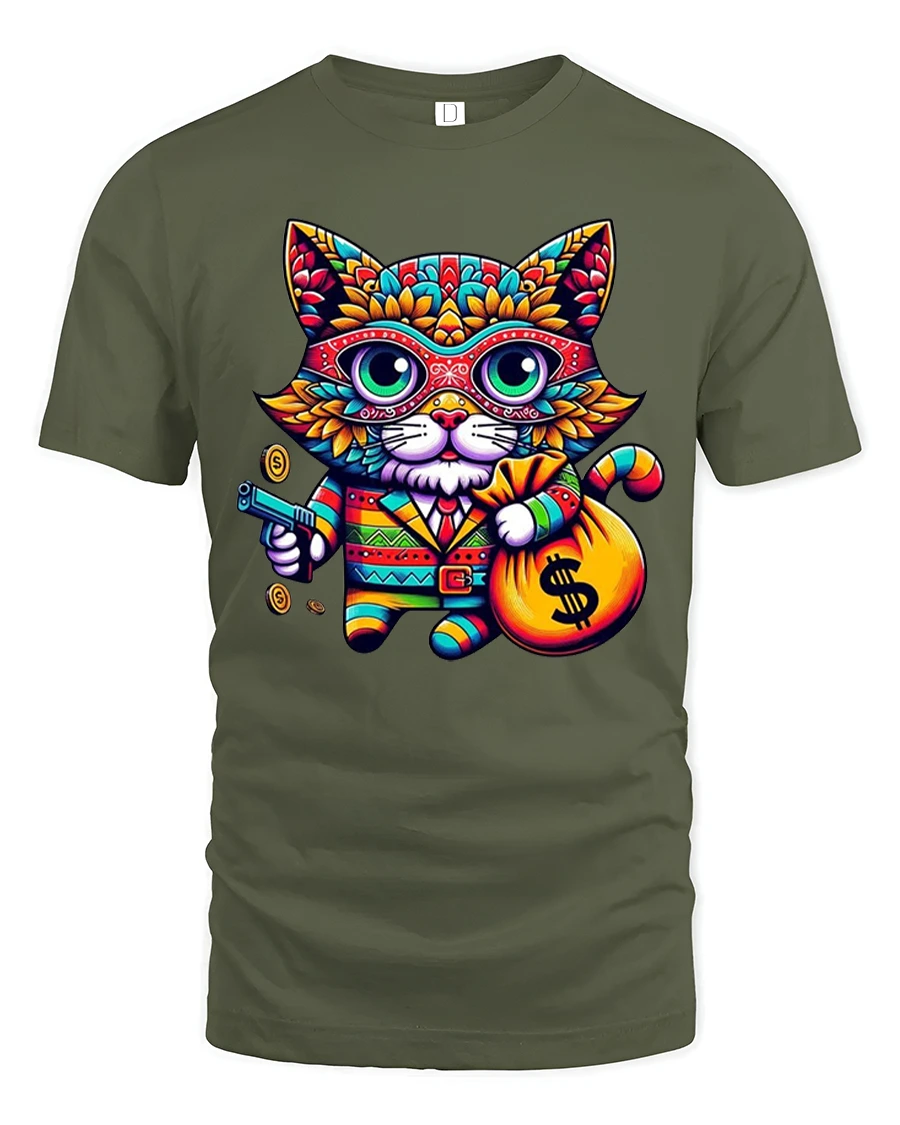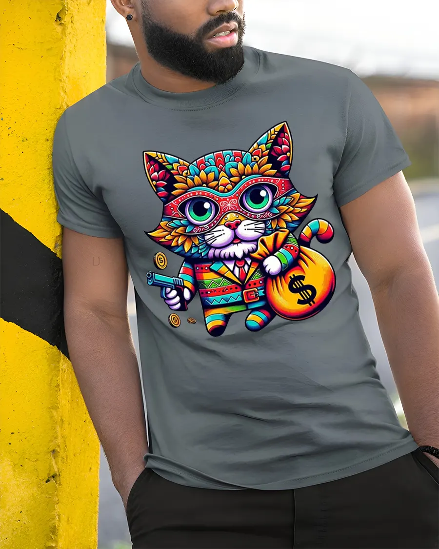 This Gangster Money Cat Tee Colorful Cool Kitty Graphic Tshirt brings a fun, bold, and vibrant twist to your wardrobe. Featuring a neon-bright cat dressed in a gangster outfit, holding a cash bag and cartoon-style money, this tee blends adorable charm with playful mischief. The detailed patterns and electrifying colors make the design pop, creating a standout look that turns heads everywhere you go.