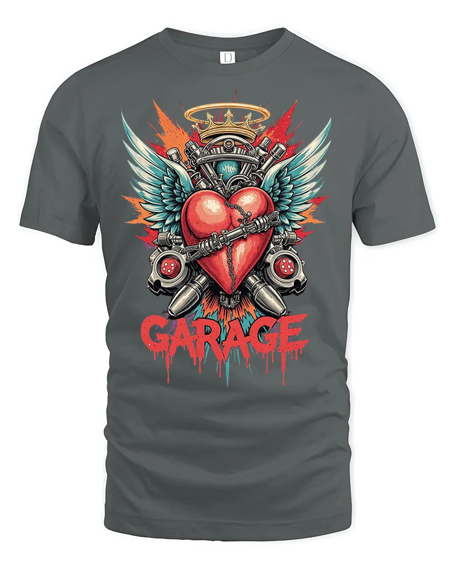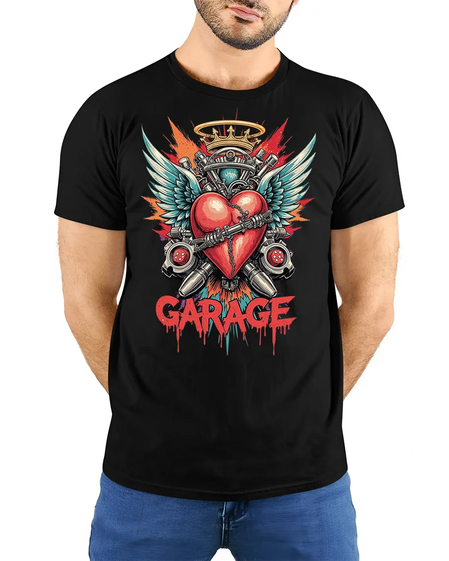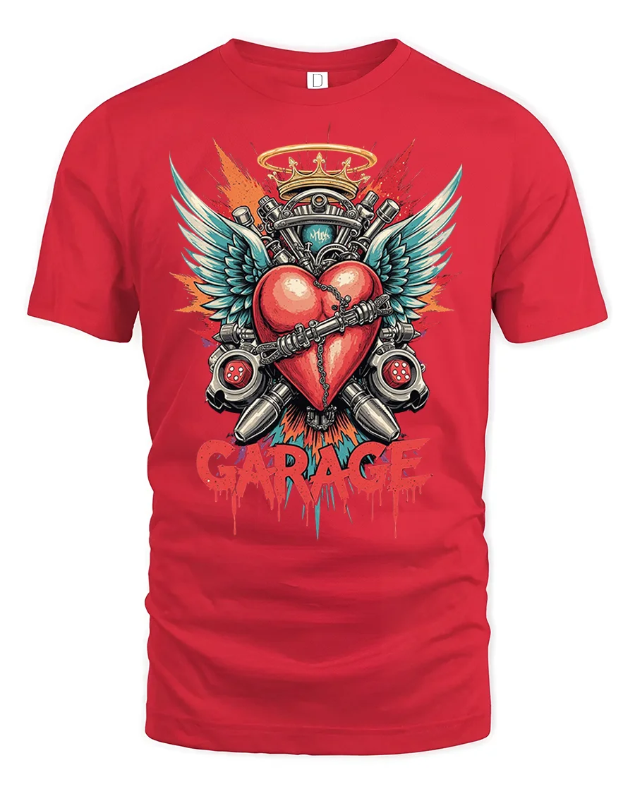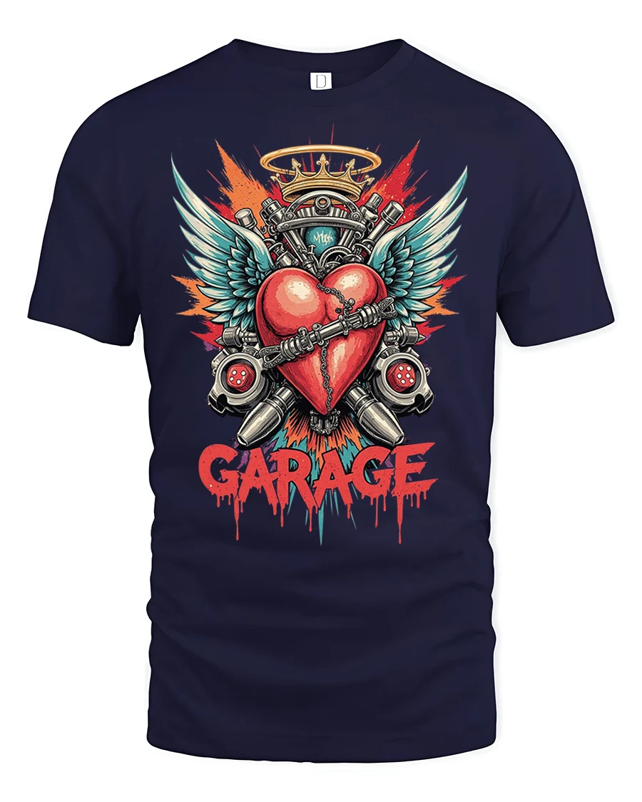 Show your love for the garage life with the Garage Heart Engine Wings Mechanic Art Graphic T-Shirt.
