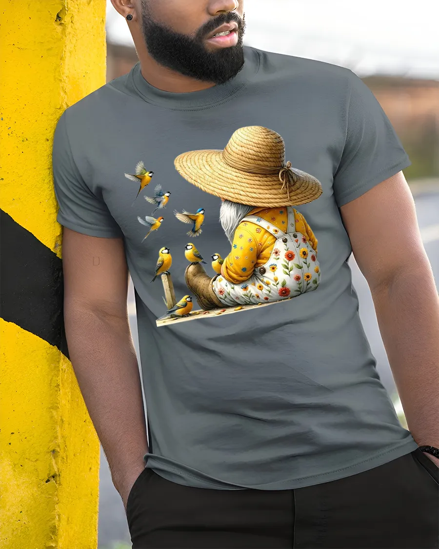 Made from soft, breathable cotton, this Garden Gnome With Birds T-Shirt combines comfort with artful expression.