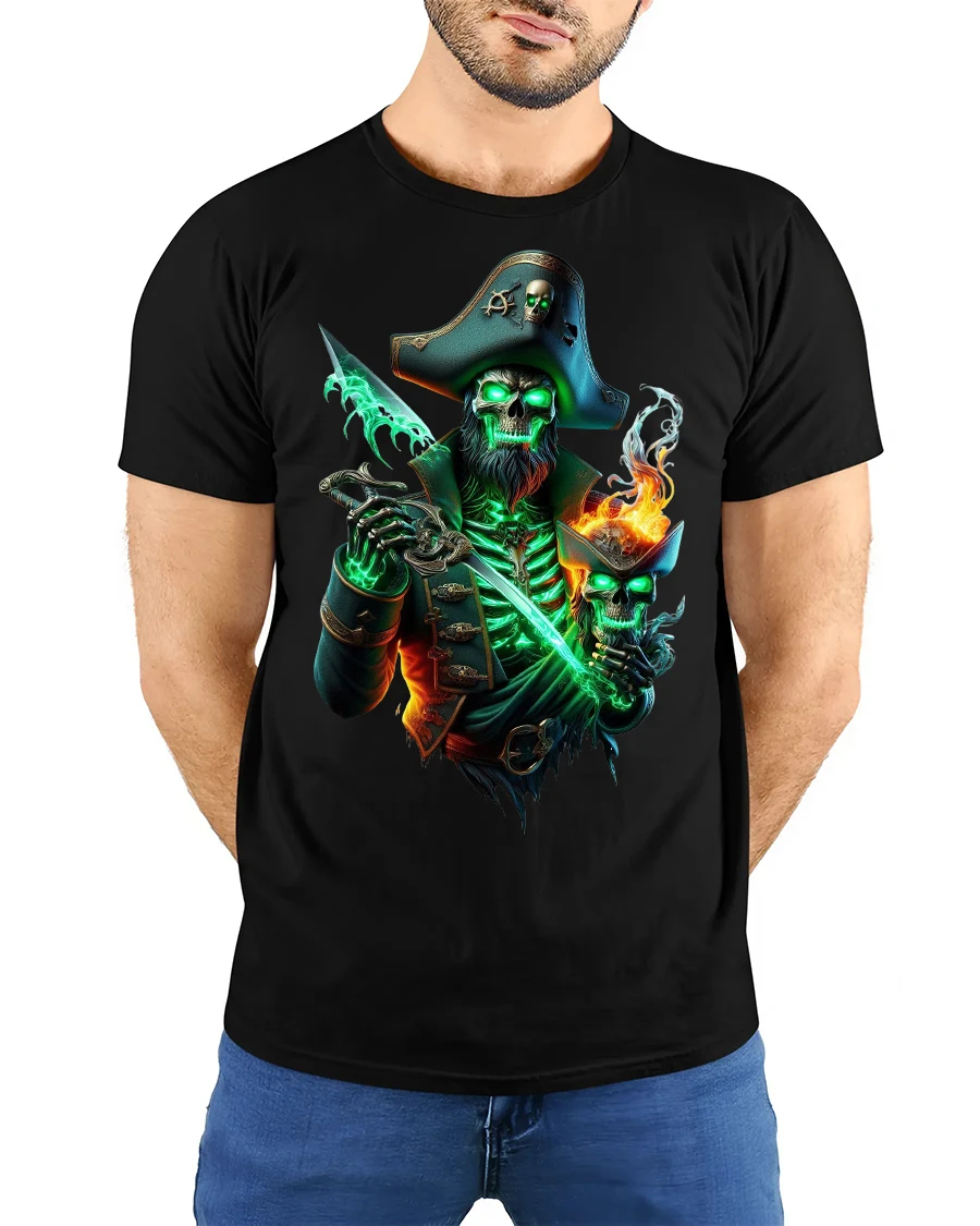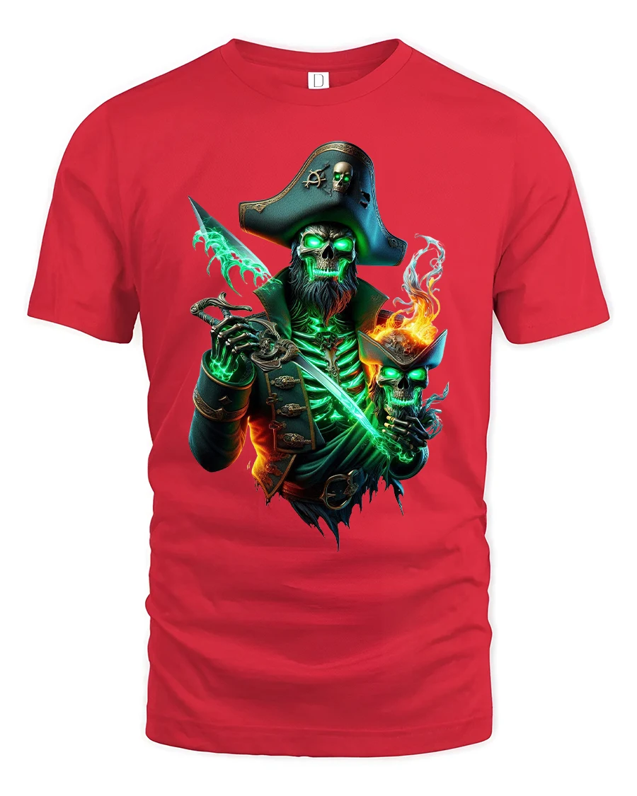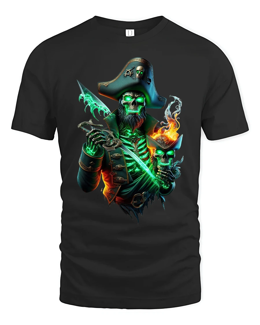 Ghost Pirate Skull Captain Graphic T Shirt brings dark fantasy and high seas adventure together in one electrifying design. Featuring a fierce skeletal pirate captain glowing with eerie green energy and gripping a blazing blade, this artwork captures the spirit of cursed treasure and supernatural legend. The intense details and dramatic lighting create a bold statement that instantly stands out.
