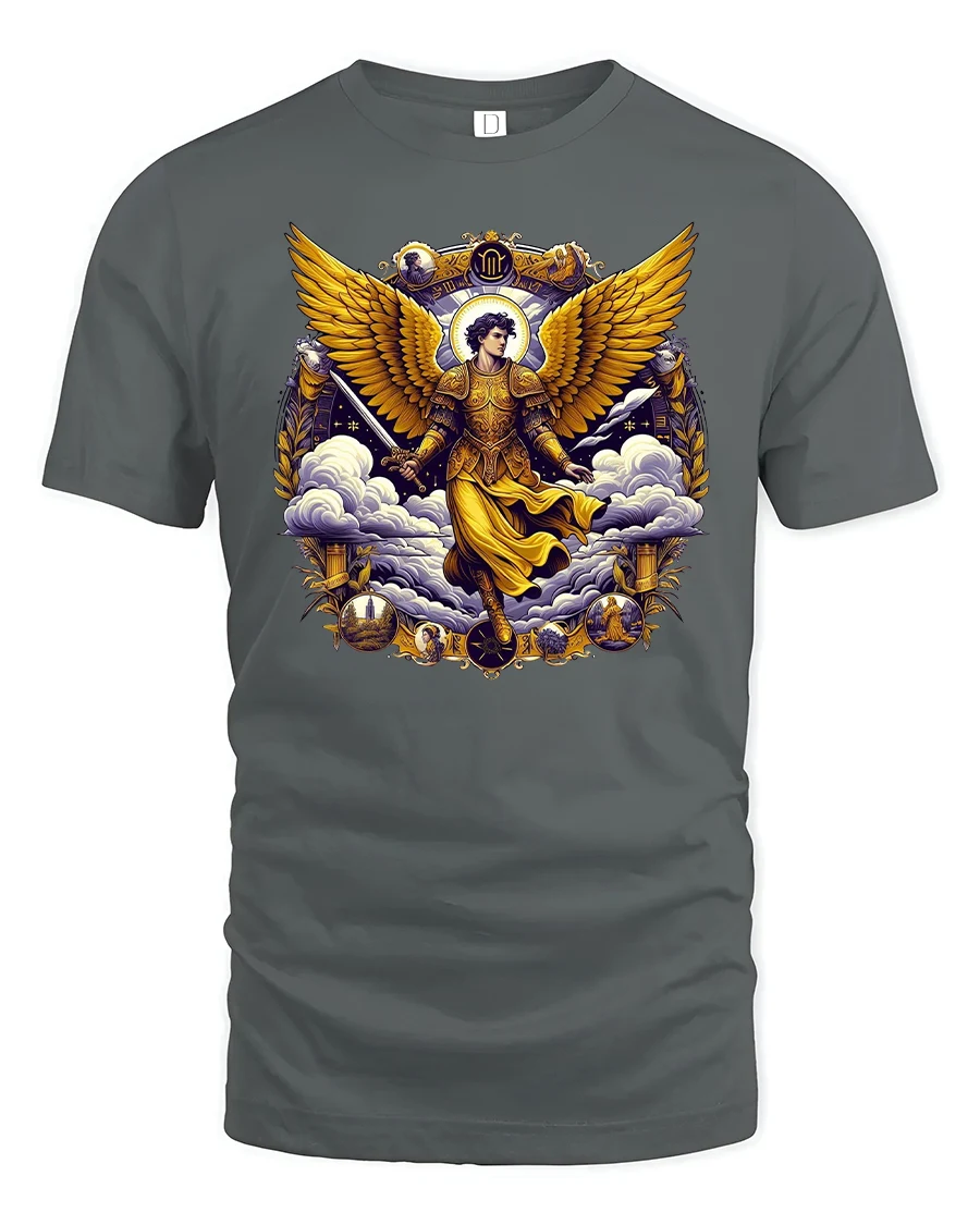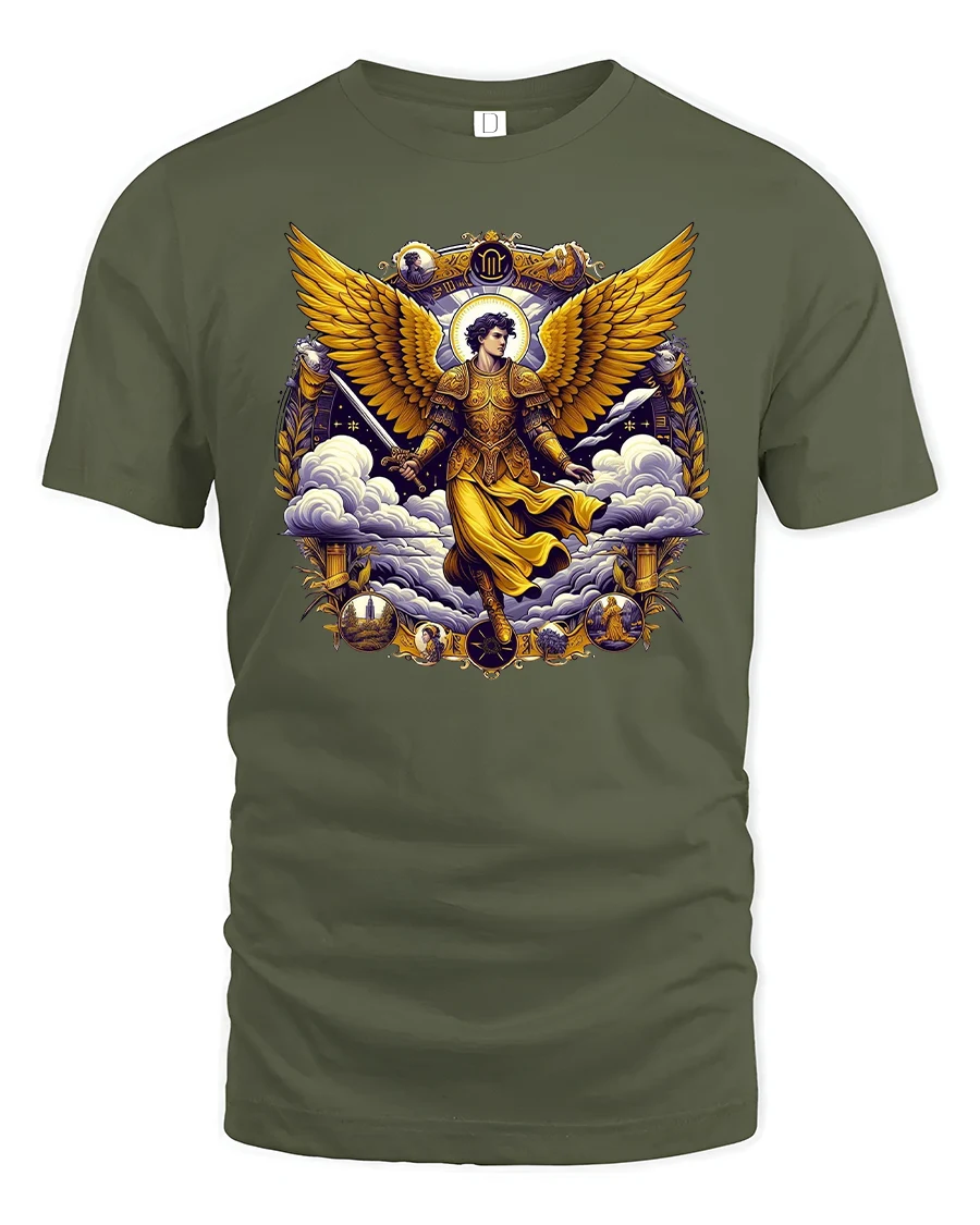 Featuring a majestic angel with golden armor and radiant wings surrounded by clouds and divine symbols, this design represents courage, faith, and light.
