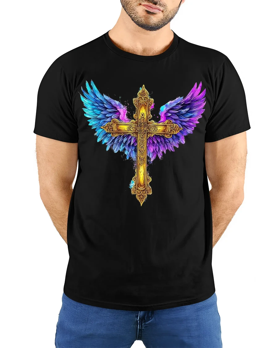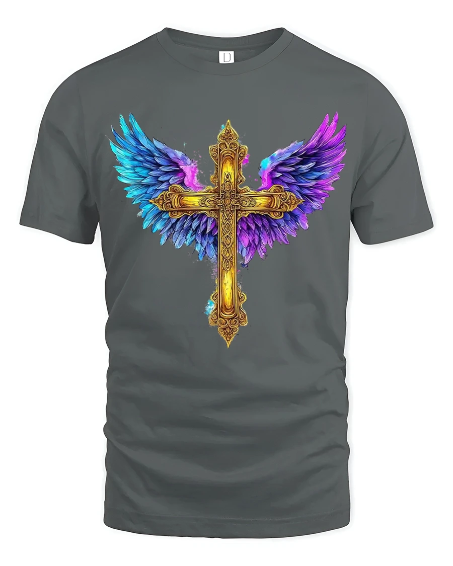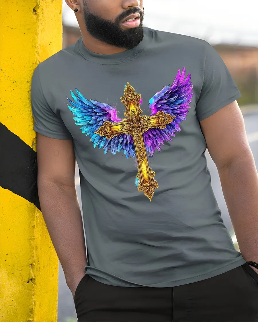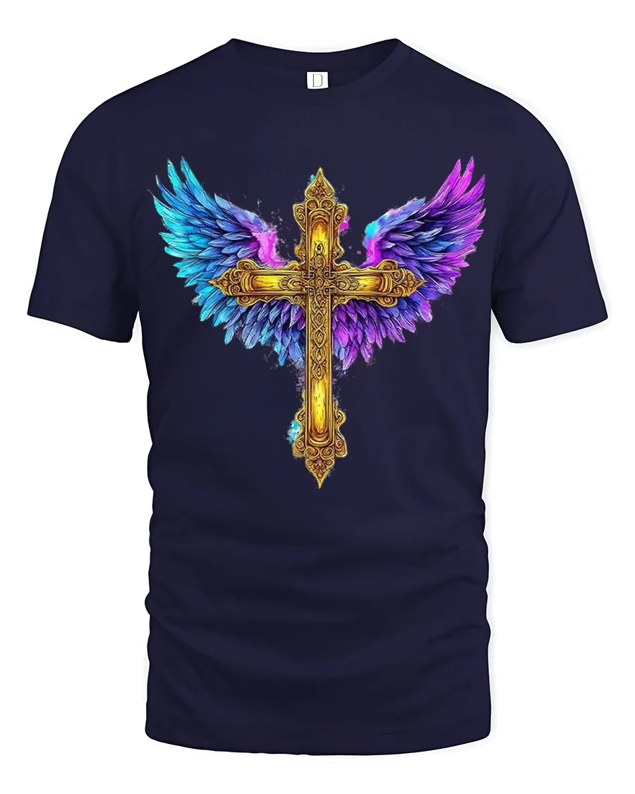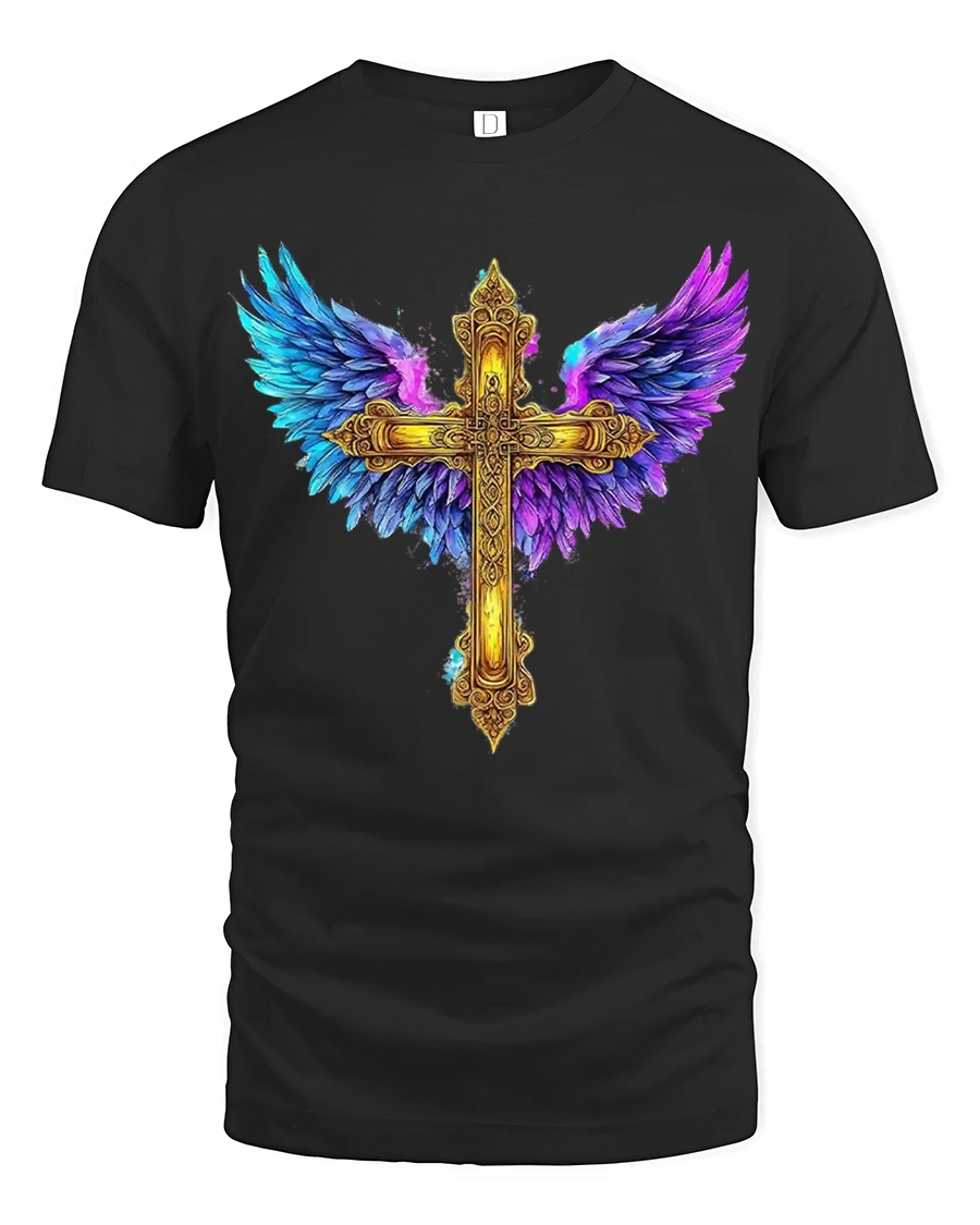 The Golden Angel Wings Cross Faith Art Graphic T Shirt Design combines spiritual symbolism with powerful artistic beauty.