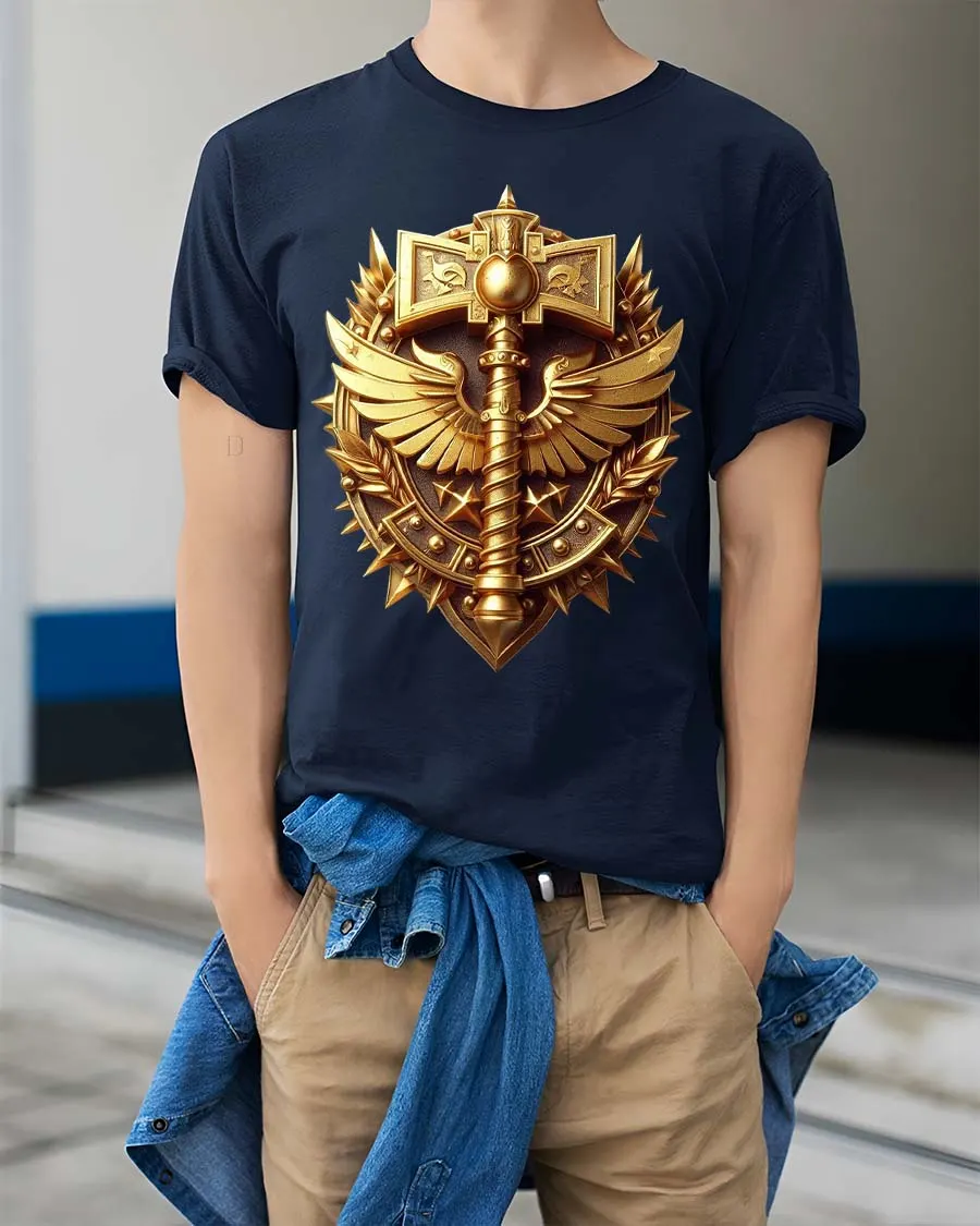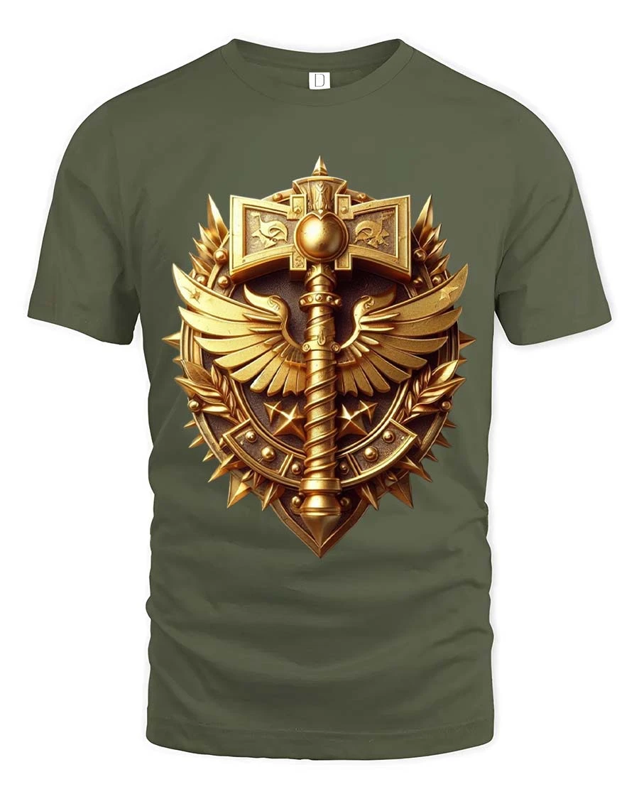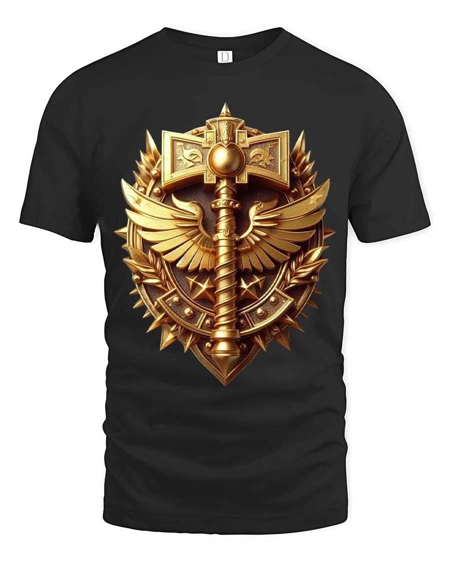 Golden Warrior Emblem Shield Sword Fantasy T Shirt showcases a bold and majestic design inspired by strength and honor.