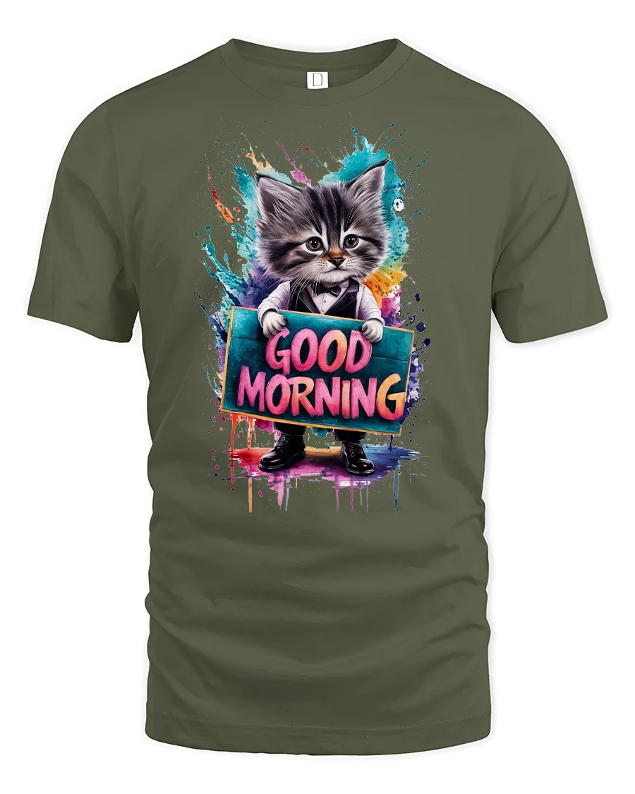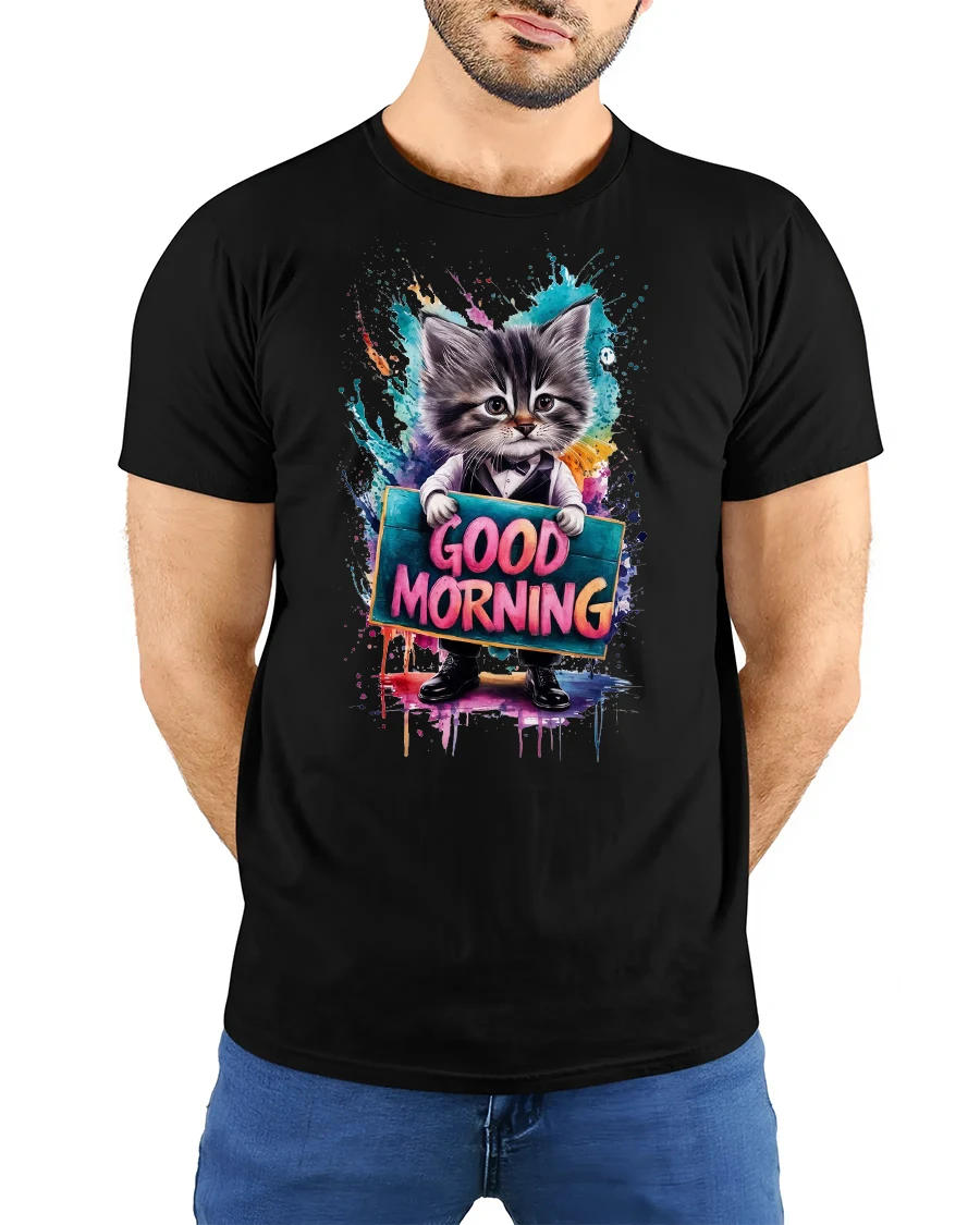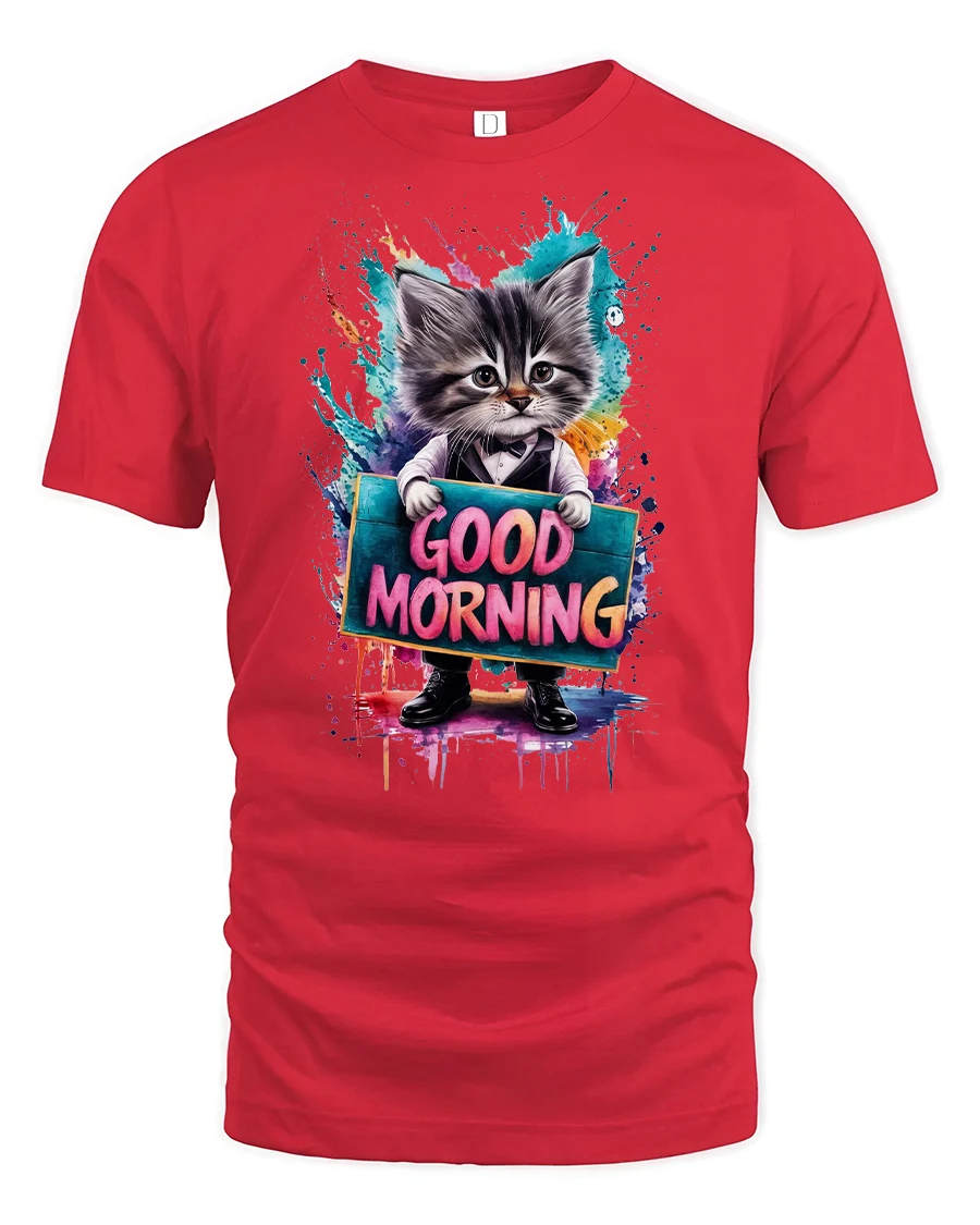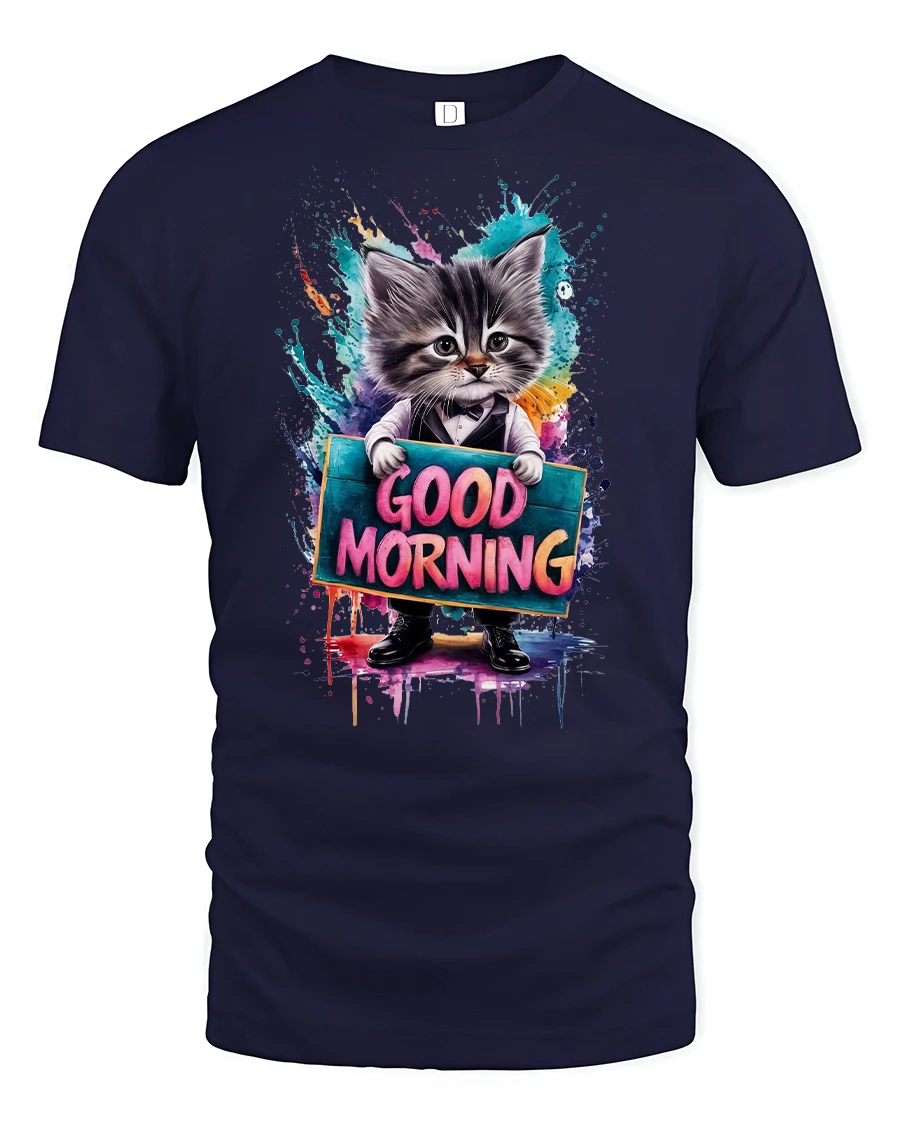 Start your day with a smile wearing the Good Morning Cat Graphic Tee Funny Kitten T-Shirt. Featuring an adorable kitten dressed in a suit and holding a vibrant “Good Morning” sign, this tee is perfect for anyone who loves cats and a little humor in their daily routine. It’s an instant mood booster and a fun conversation starter.