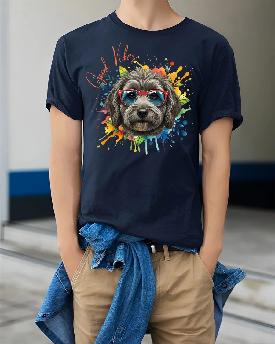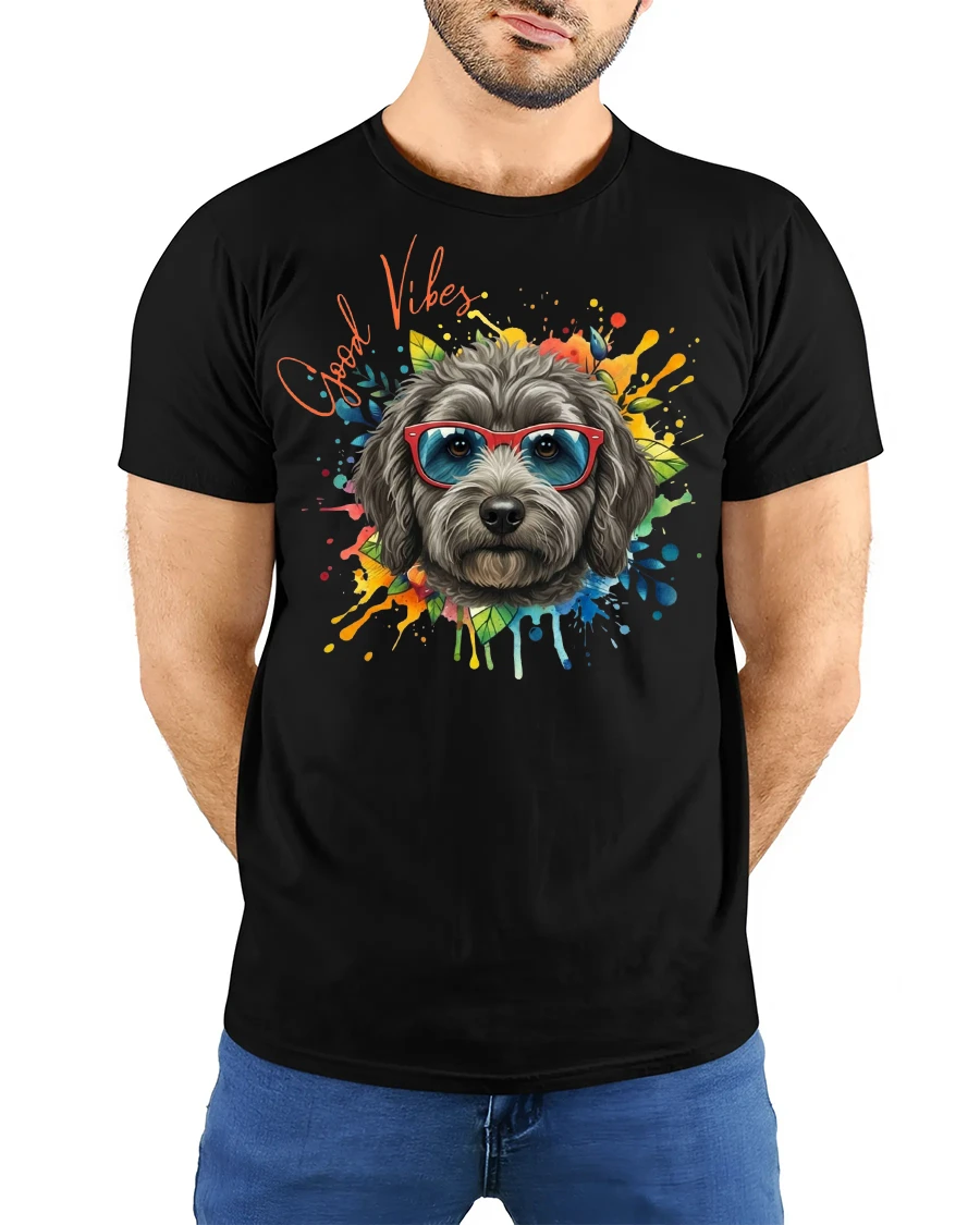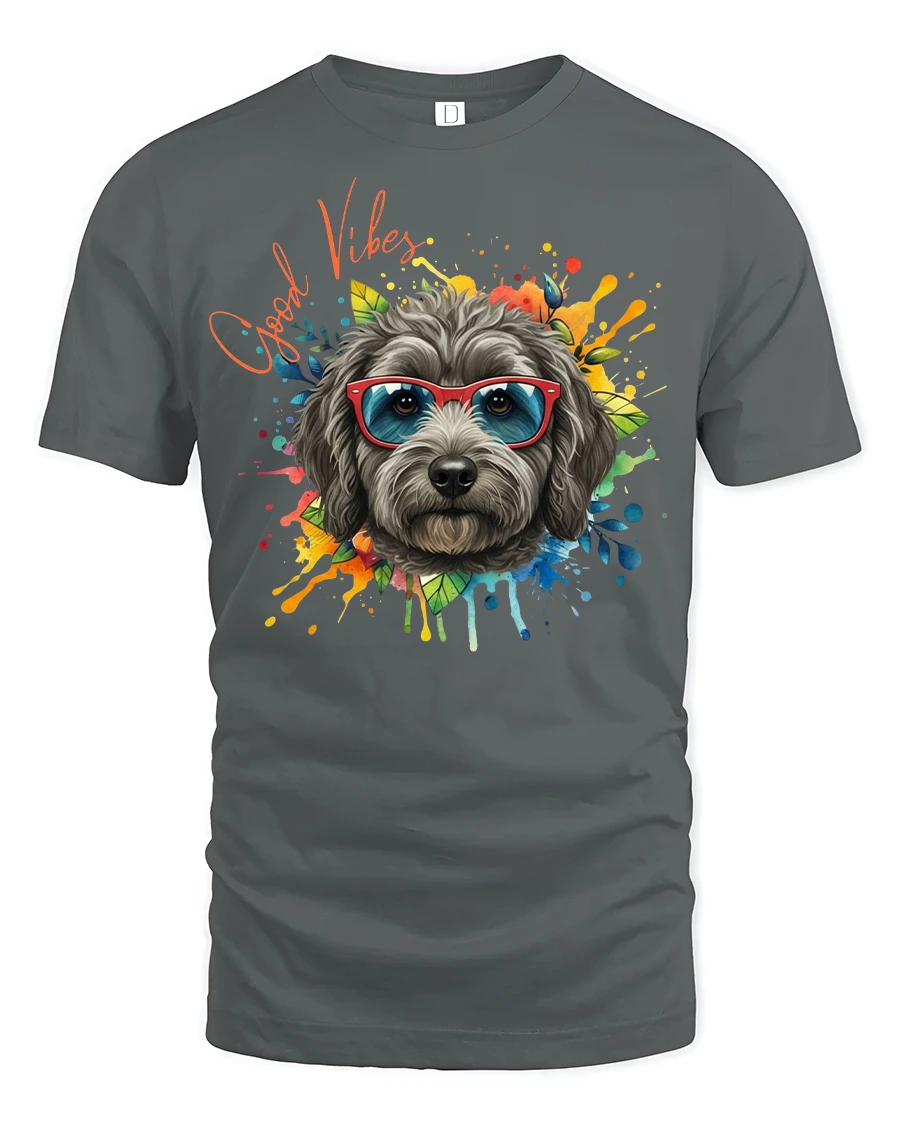 The Good Vibes Color Splash Dog With Glasses Graphic Tee Shirt brings personality, creativity, and positive energy together in one standout design.