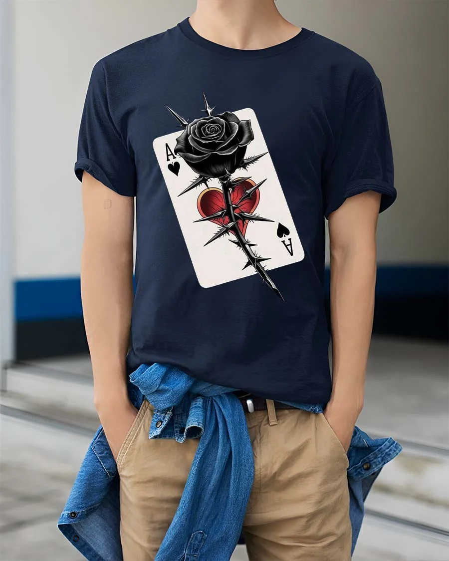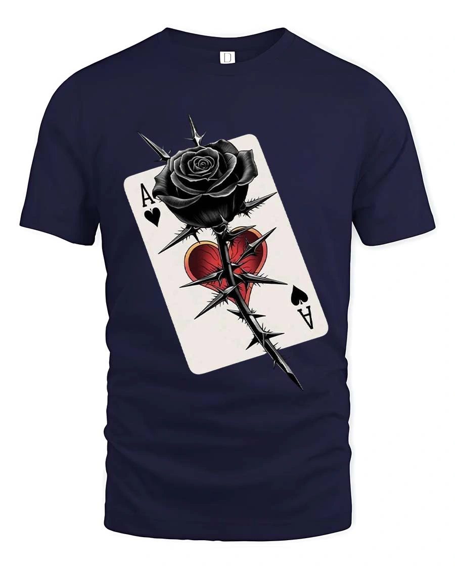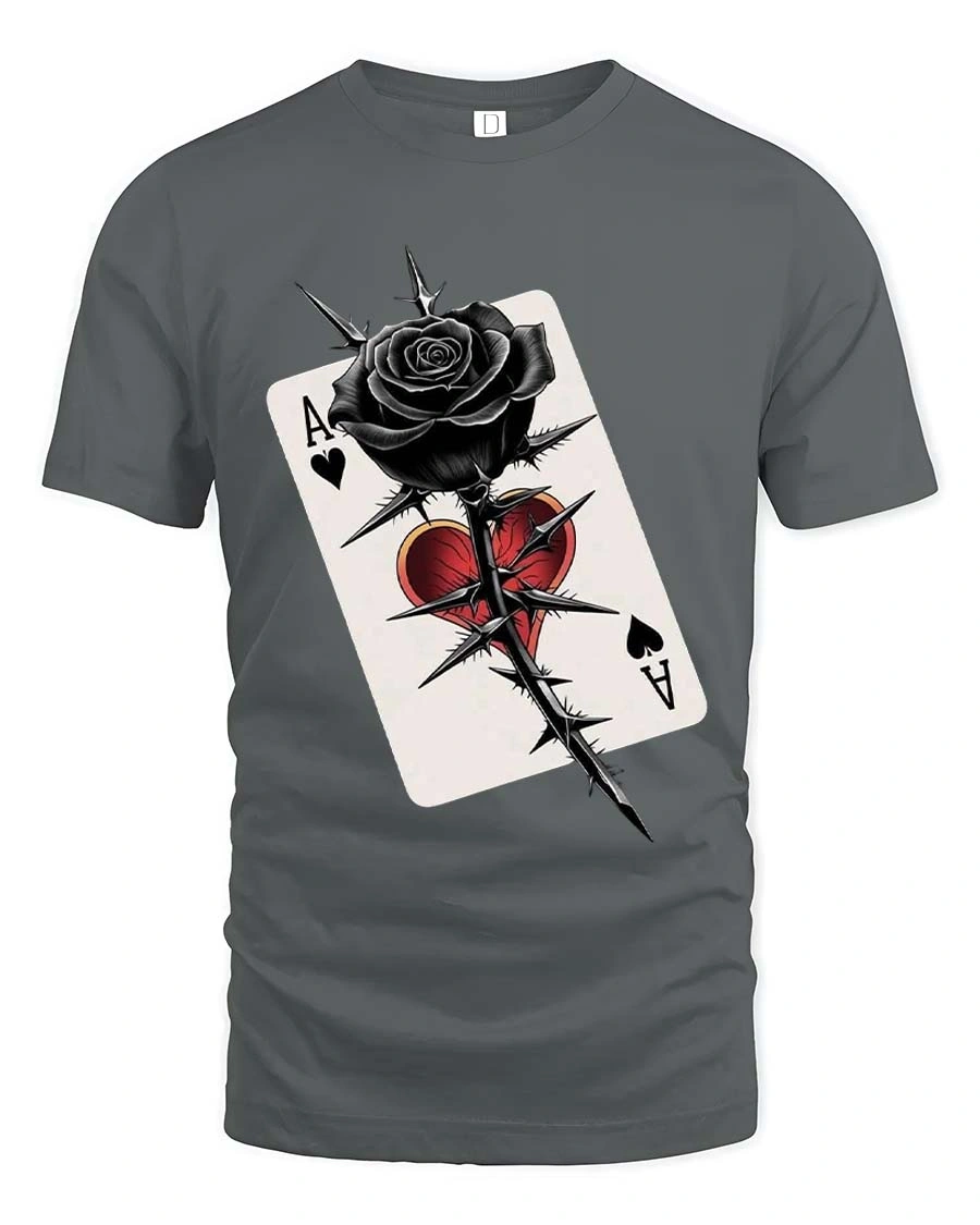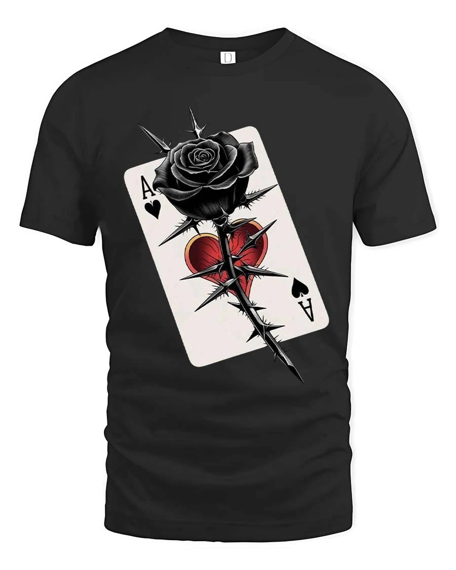 Featuring a black rose wrapped in thorns layered over a classic ace card with a heart detail, this graphic creates a powerful visual that represents love with an edgy twist.