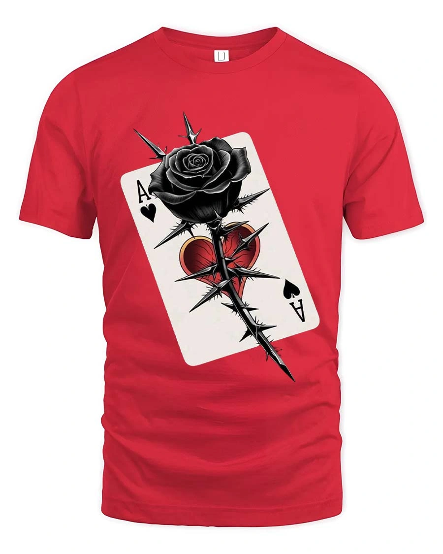 Gothic Black Rose Ace Card T Shirt Dark Love Graphic Tee blends dark romance with bold artistic symbolism in a striking design.
