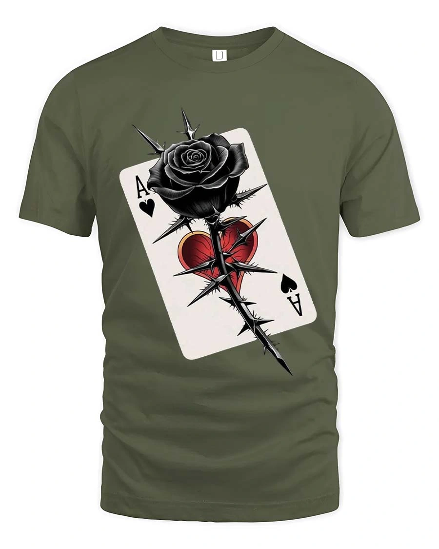 Gothic Black Rose Ace Card T Shirt Dark Love Graphic Tee - military green t-shirt on white background