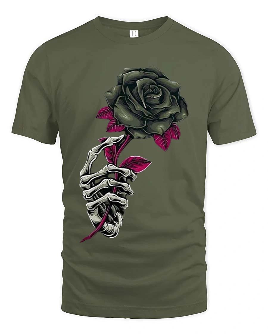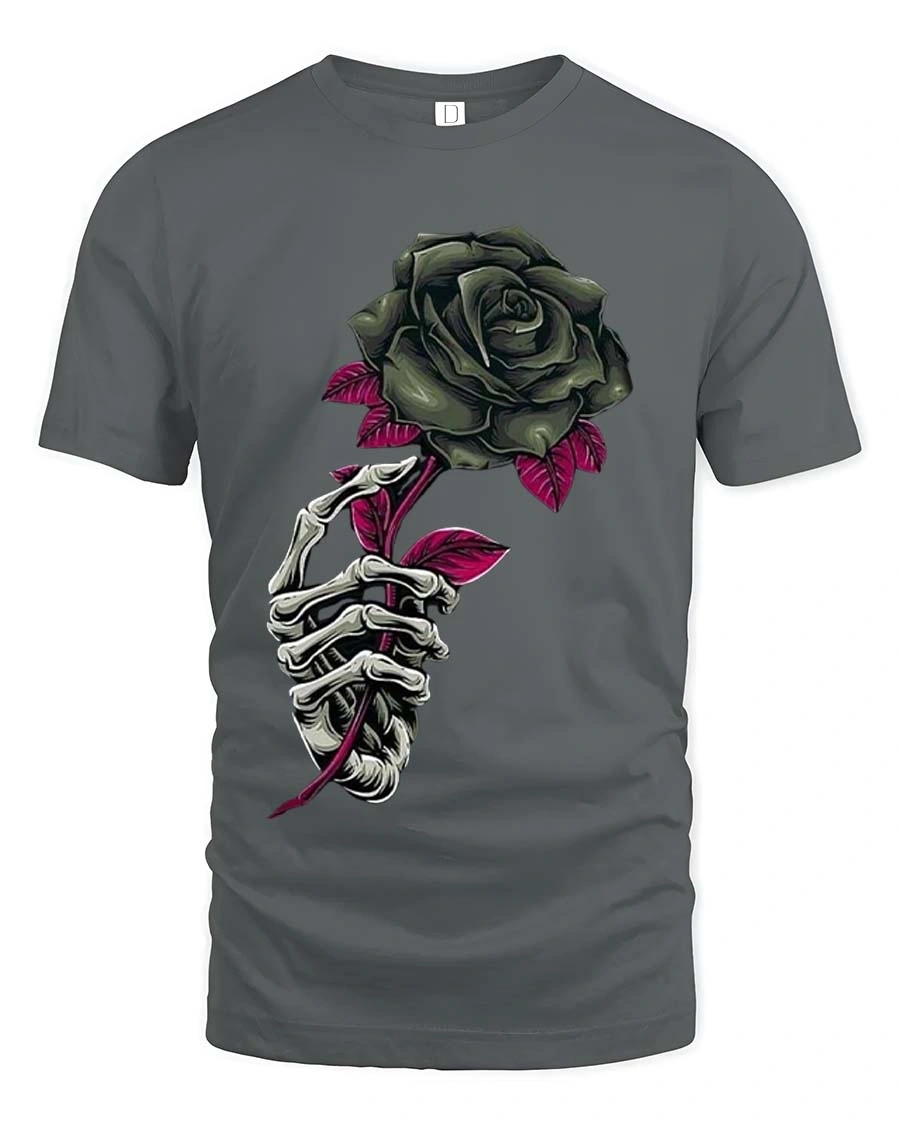 Gothic Skeleton Hand Rose T Shirt Dark Floral Art Tee combines dark elegance with artistic expression in a striking design.