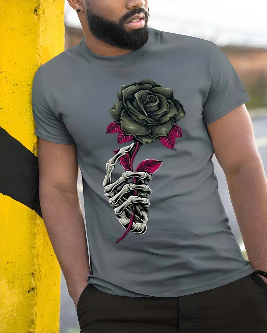 Featuring a detailed skeleton hand holding a bold rose, this graphic creates a unique blend of gothic beauty and edgy symbolism.