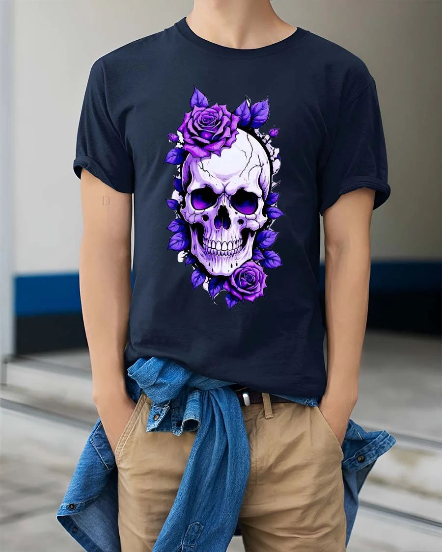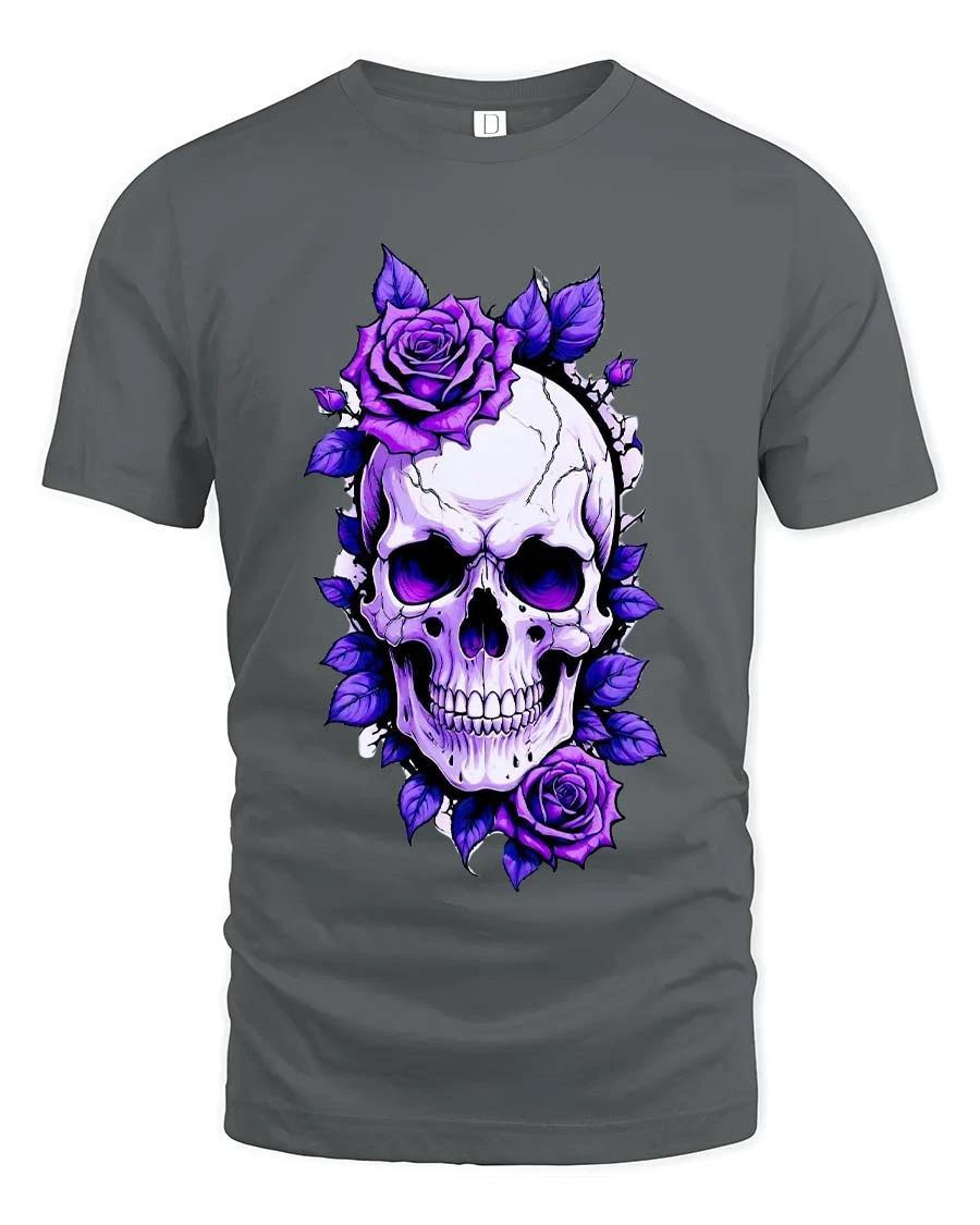 Gothic Skull Purple Roses Dark Floral Art Graphic Tshirt blends dark beauty with bold artistic expression.