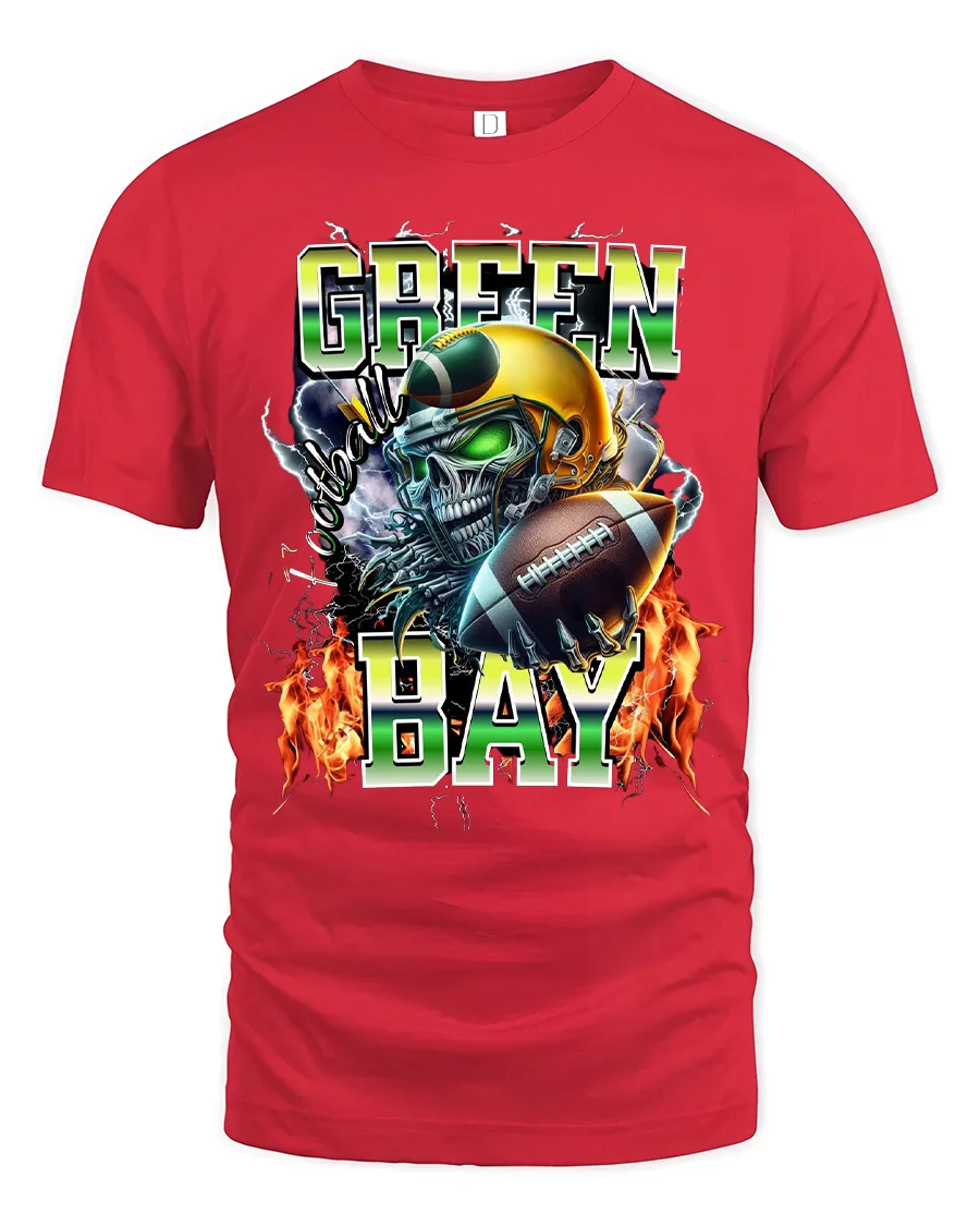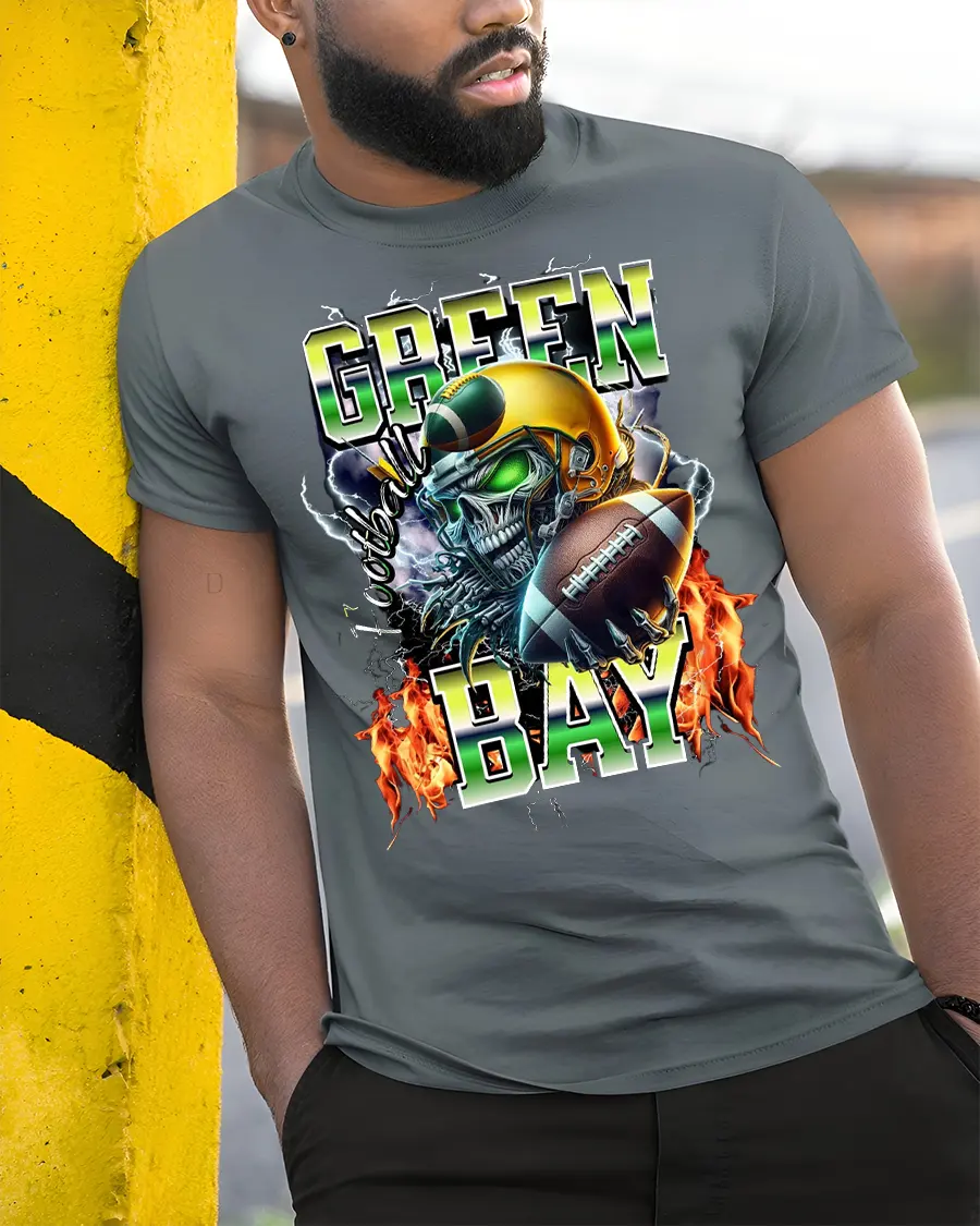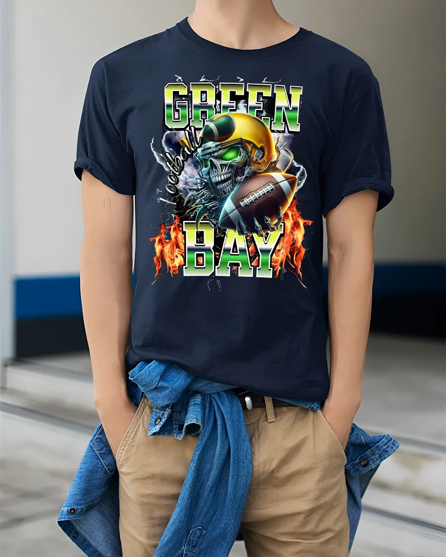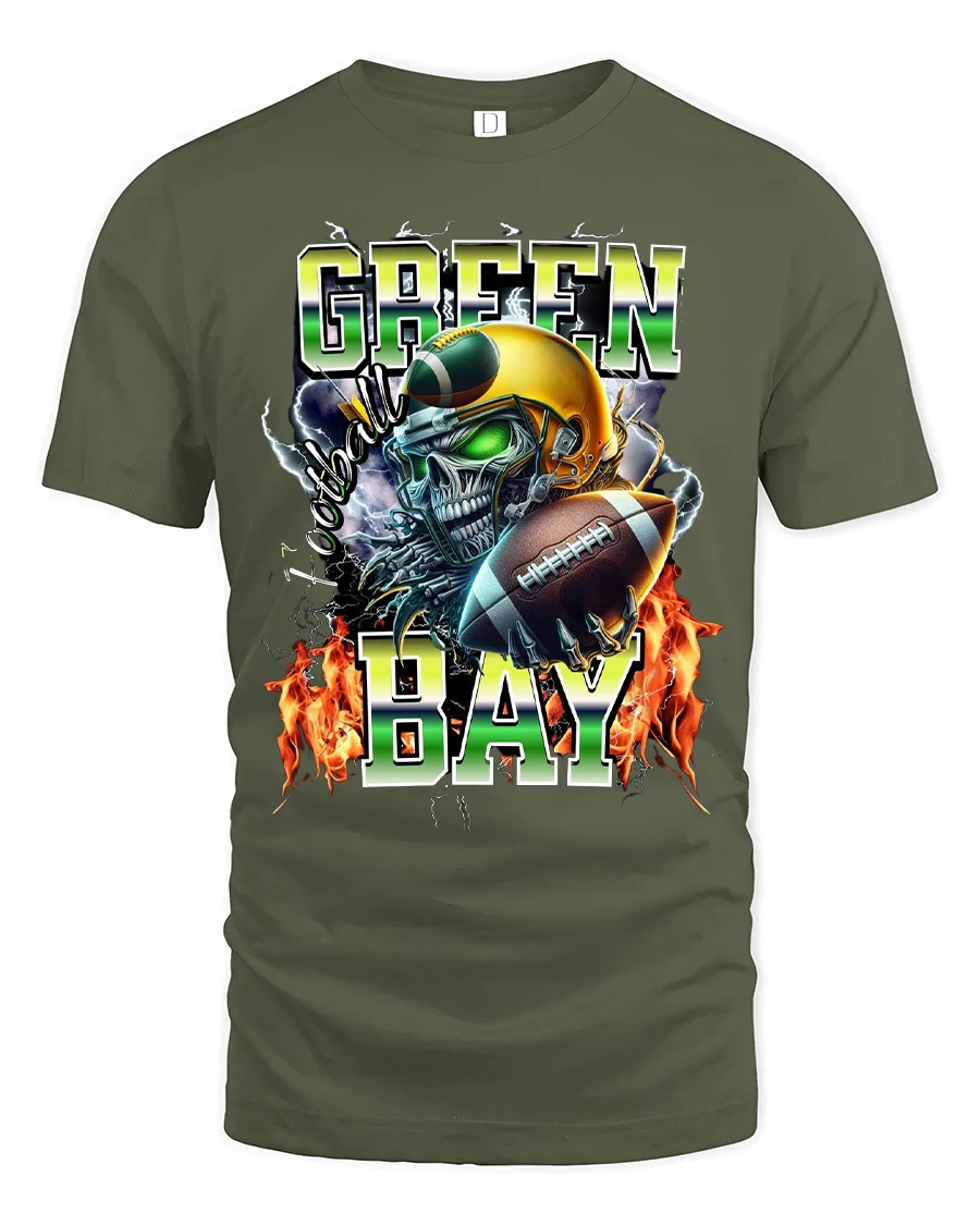Green Bay Football Skull Graphic Tee With Fierce Game Day Energy delivers an intense visual that captures the raw power of football culture.