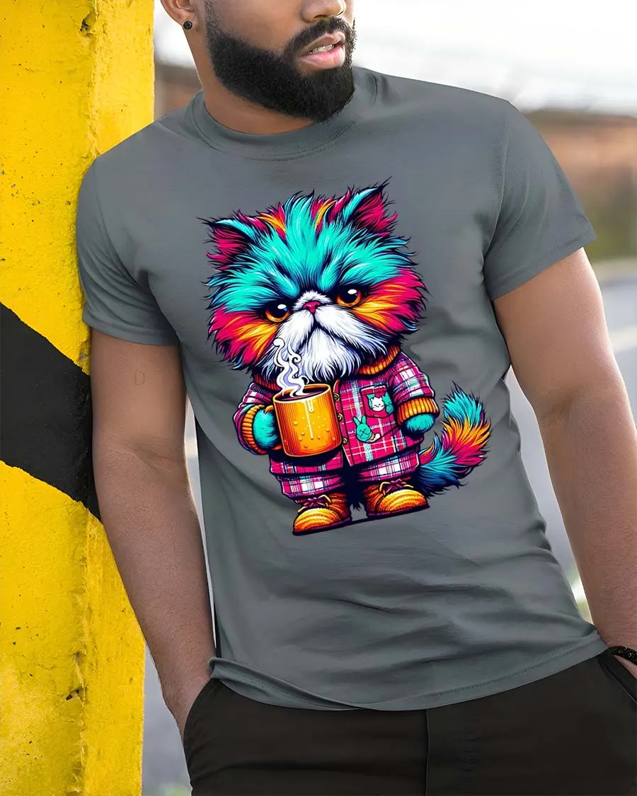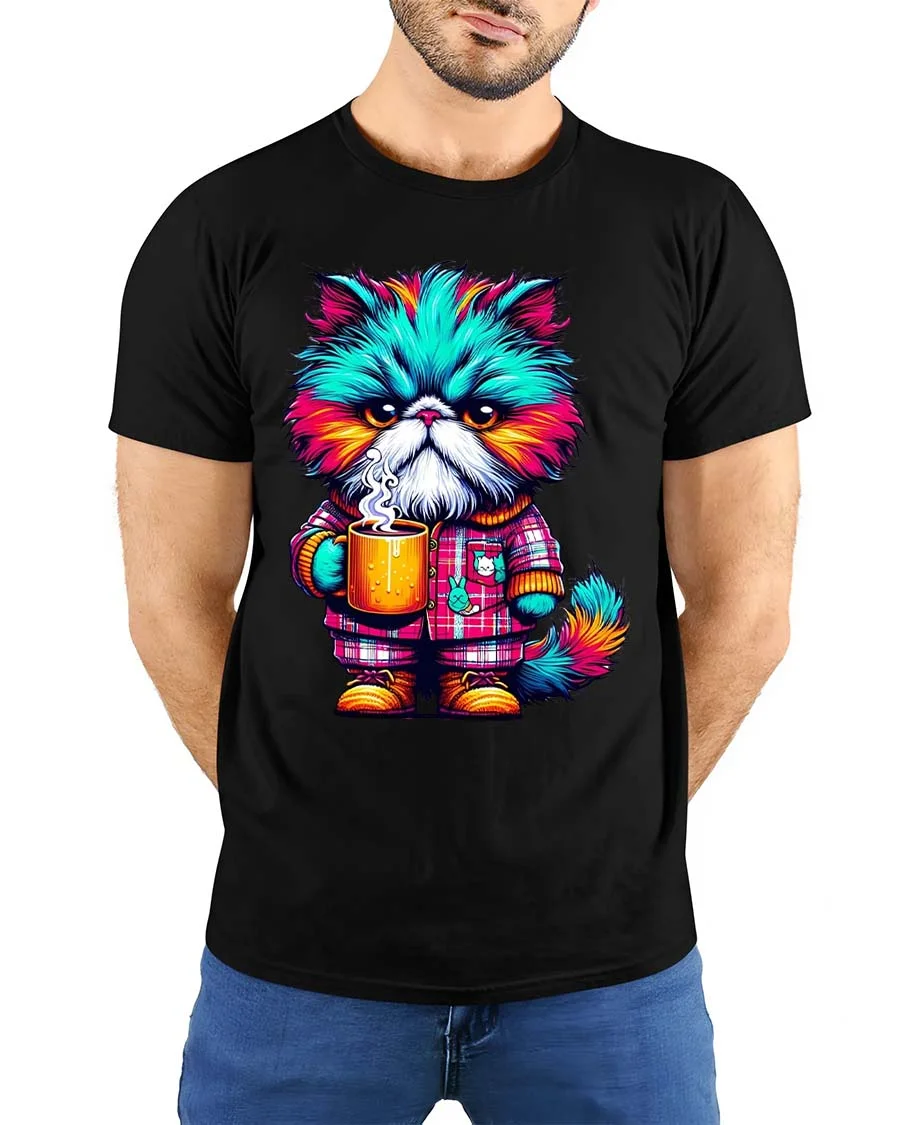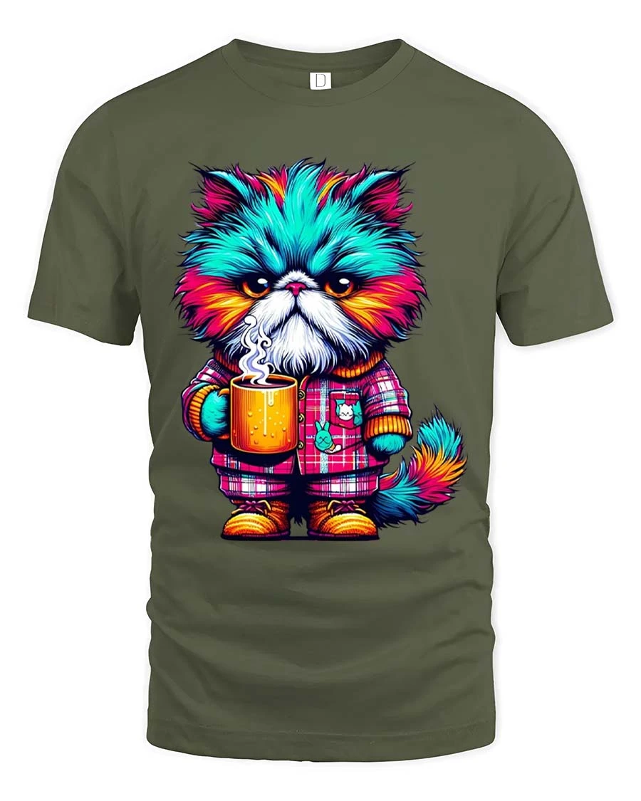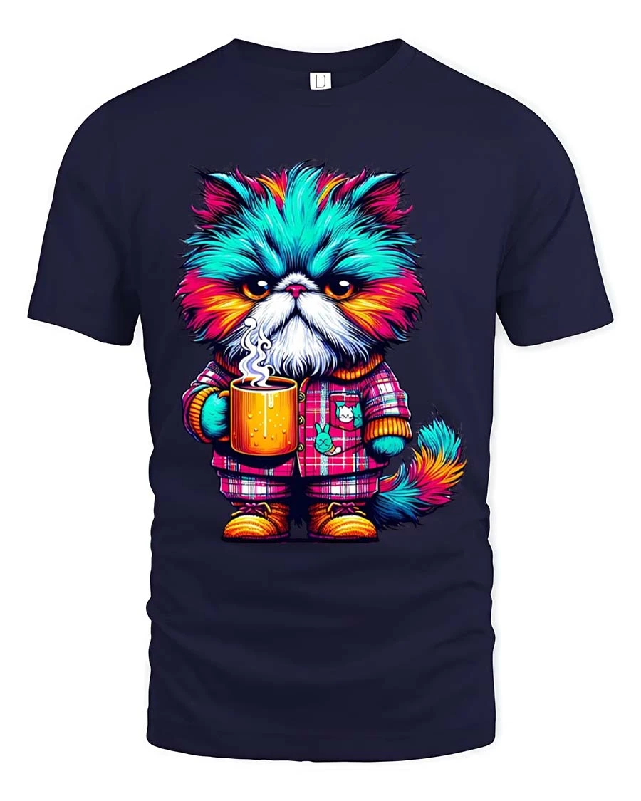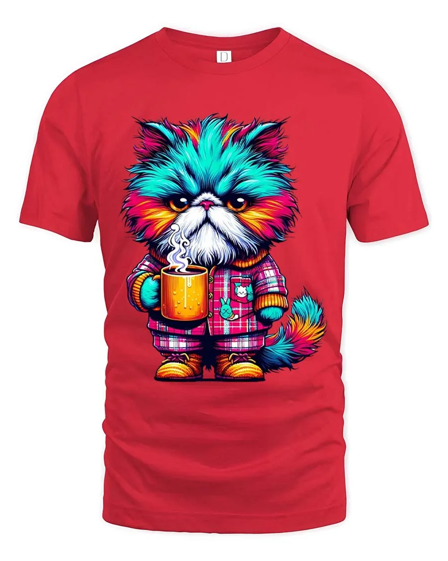 Grumpy Colorful Cat Drinking Coffee Funny T Shirt captures the perfect mix of attitude and humor in a bold eye catching design.