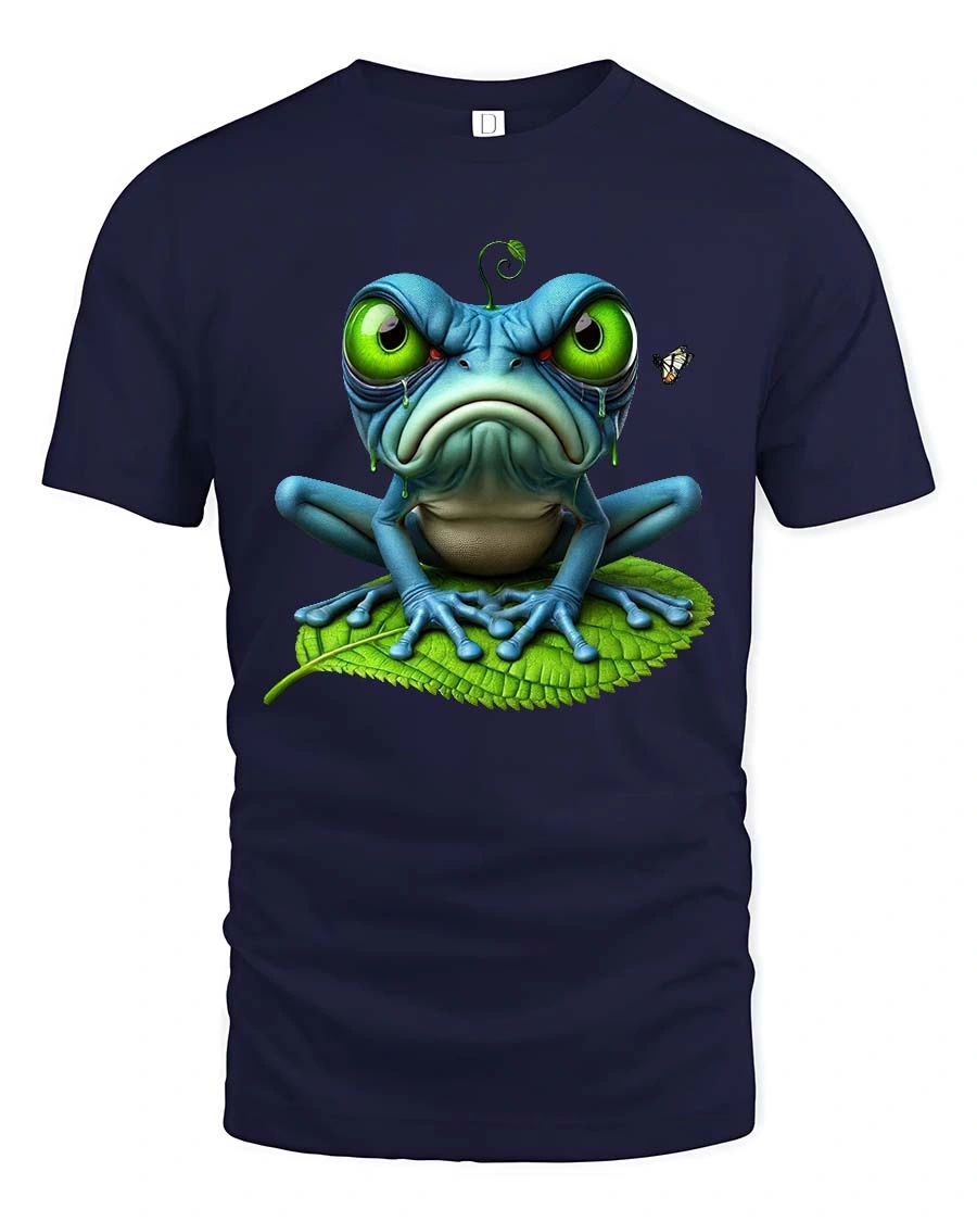 The design features a big eyed frog with a moody expression, creating a playful contrast between cute and grumpy vibes.