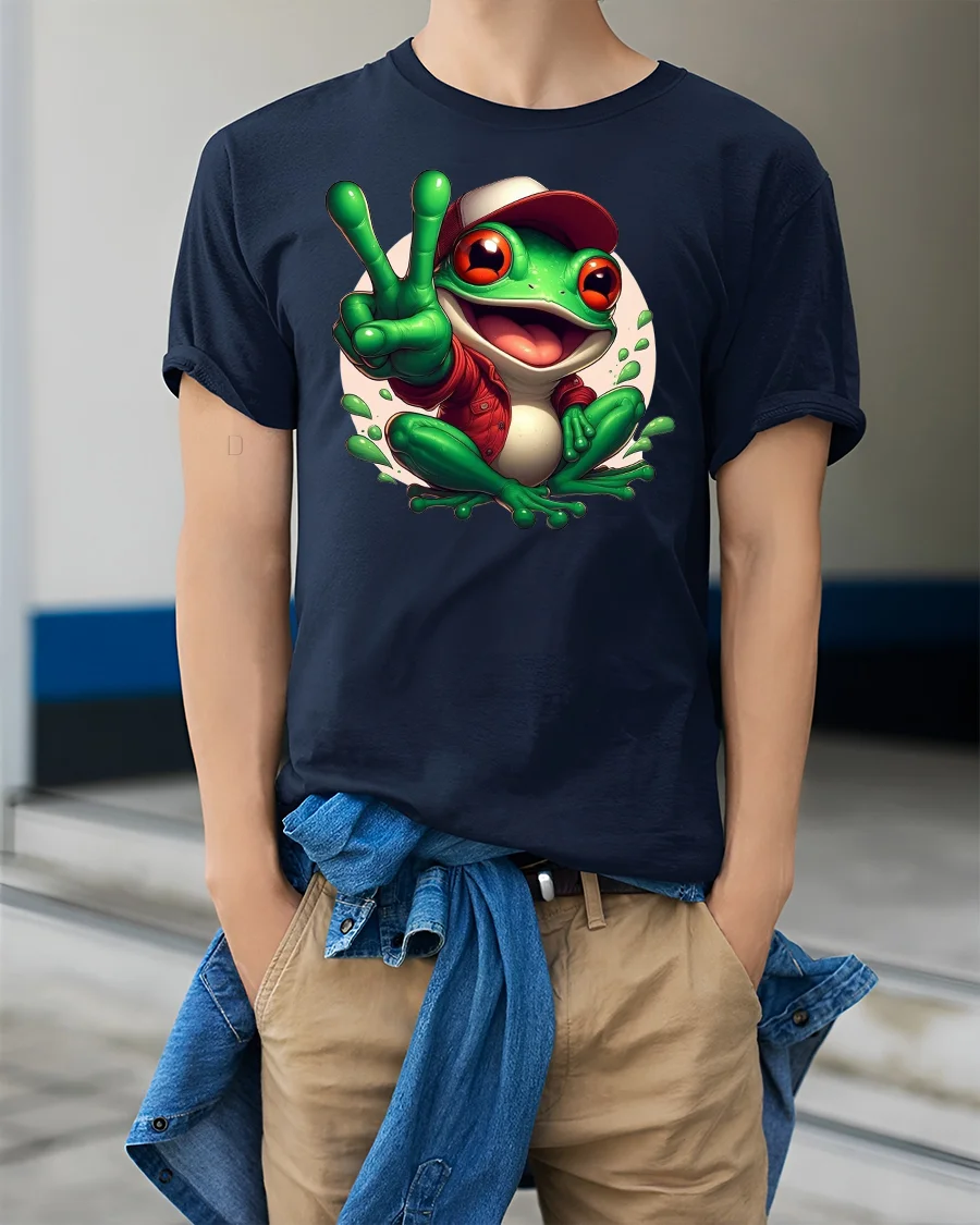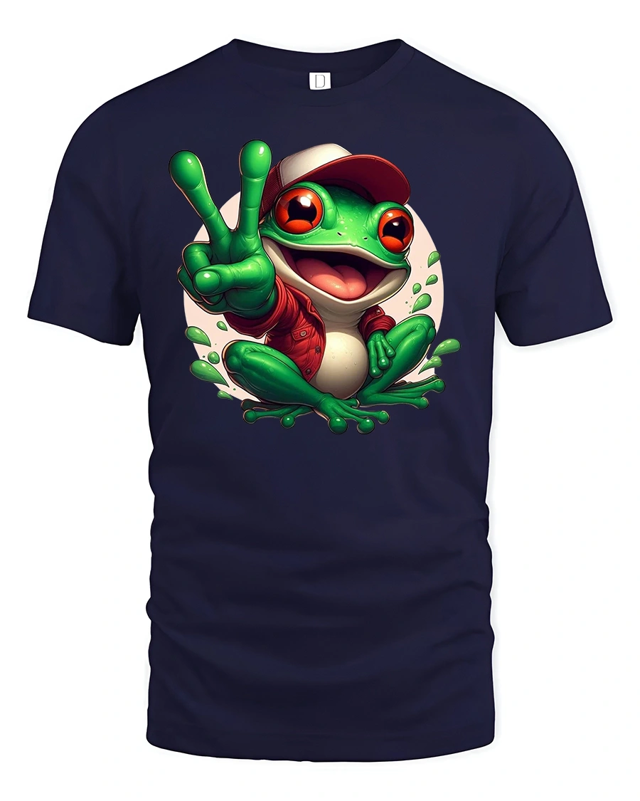 Featuring a cheerful green frog flashing a peace sign and rocking a cool cap, this design spreads smiles wherever you go.