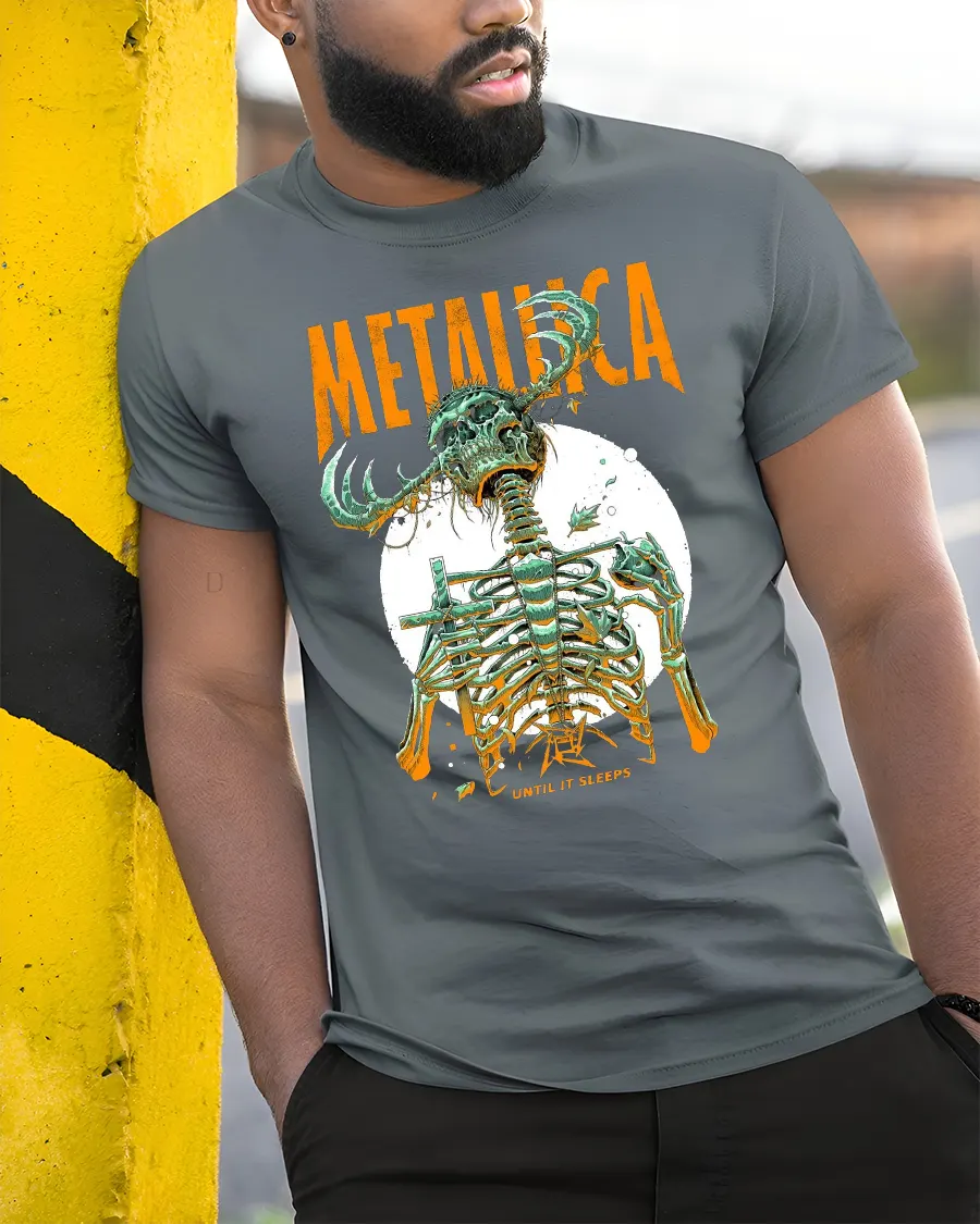 Featuring a powerful skeleton fused with antlers and dramatic details, this graphic tee captures the spirit of heavy music and bold artistic expression.