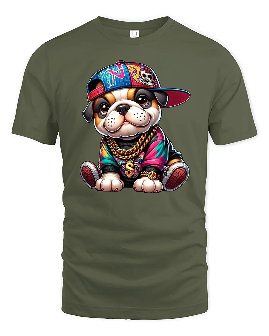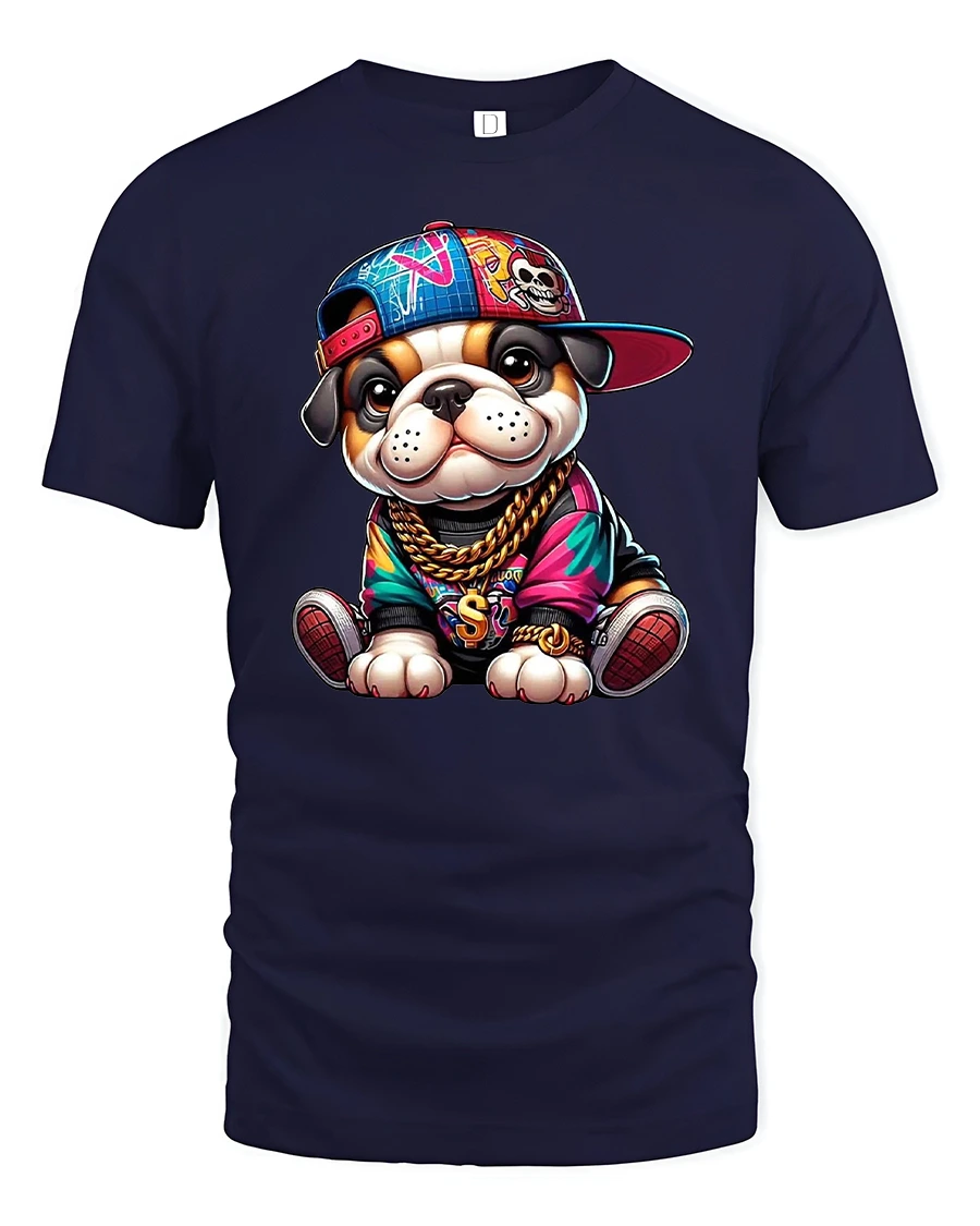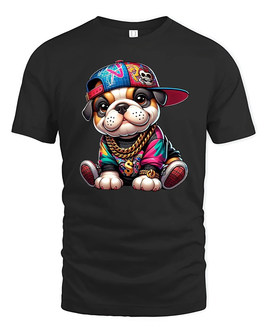 Featuring a cute bulldog dressed like a hip hop star — complete with gold chains, sneakers, and a sideways cap — this shirt is perfect for anyone who loves fun, trendy, and expressive streetwear.