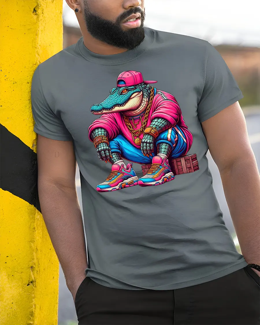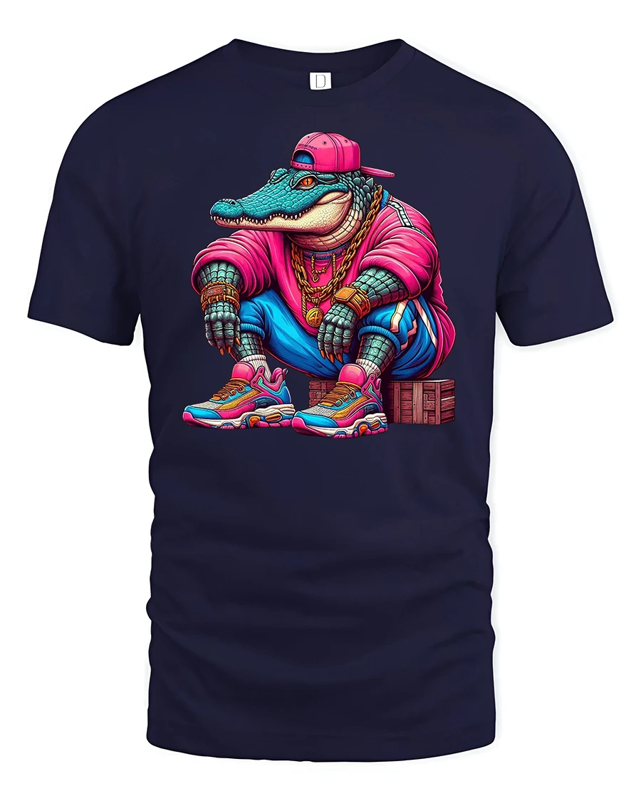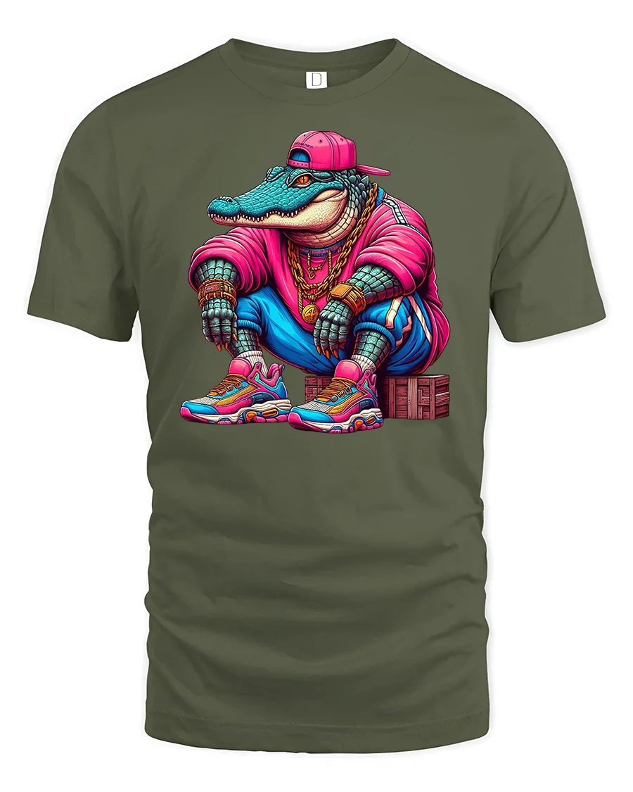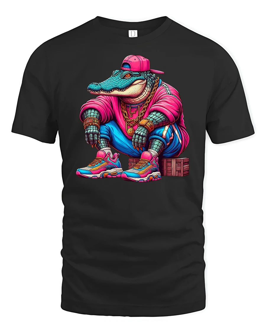 Featuring a cool crocodile dressed like a rapper in a pink hoodie, sneakers, and gold chains, this tee combines humor, attitude, and vibrant urban energy.