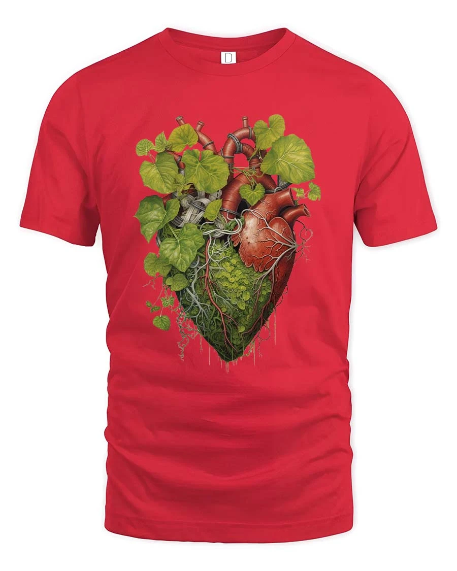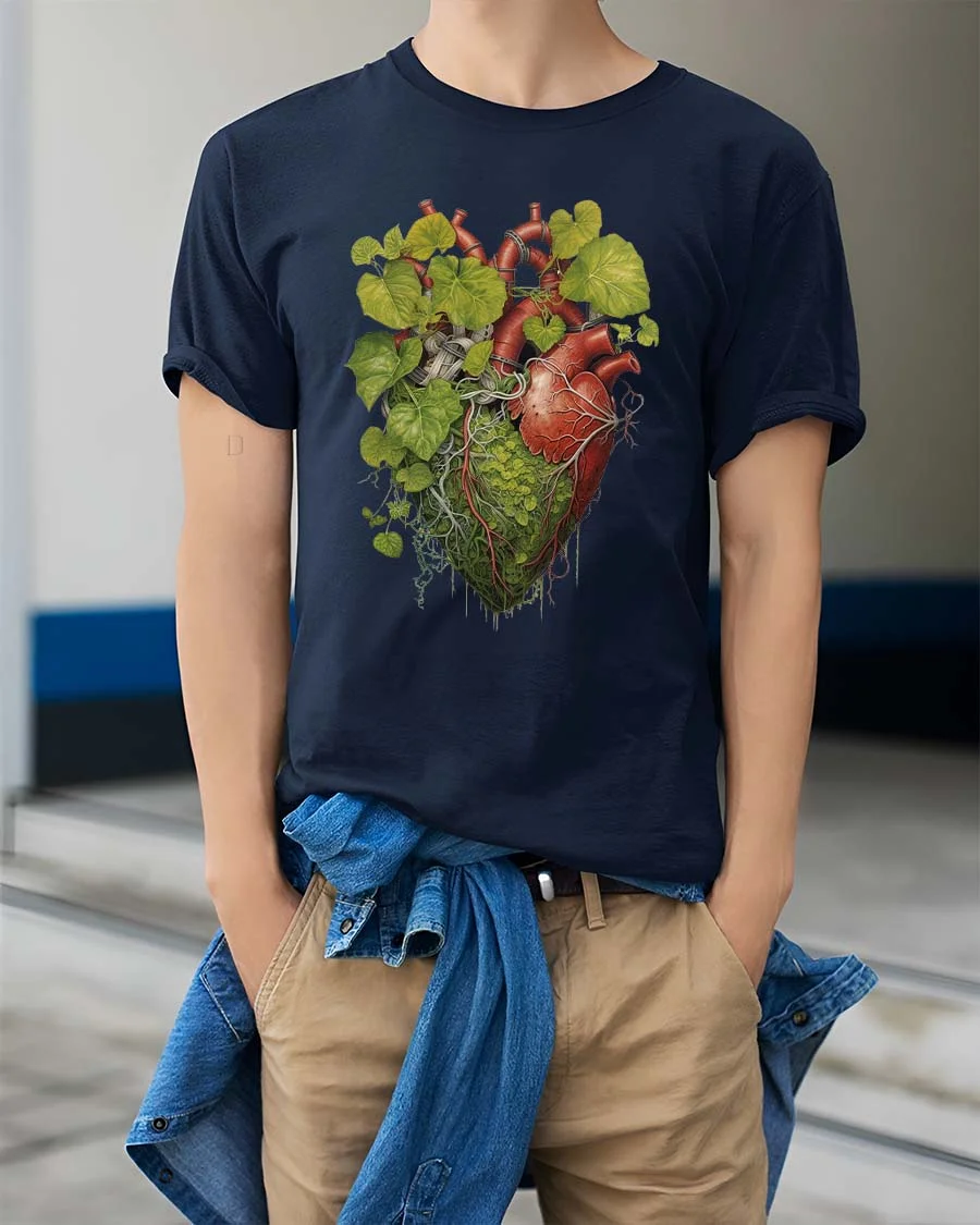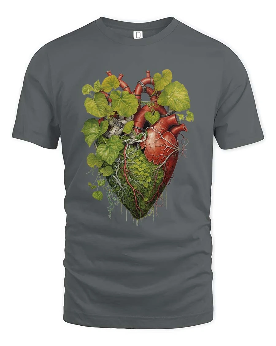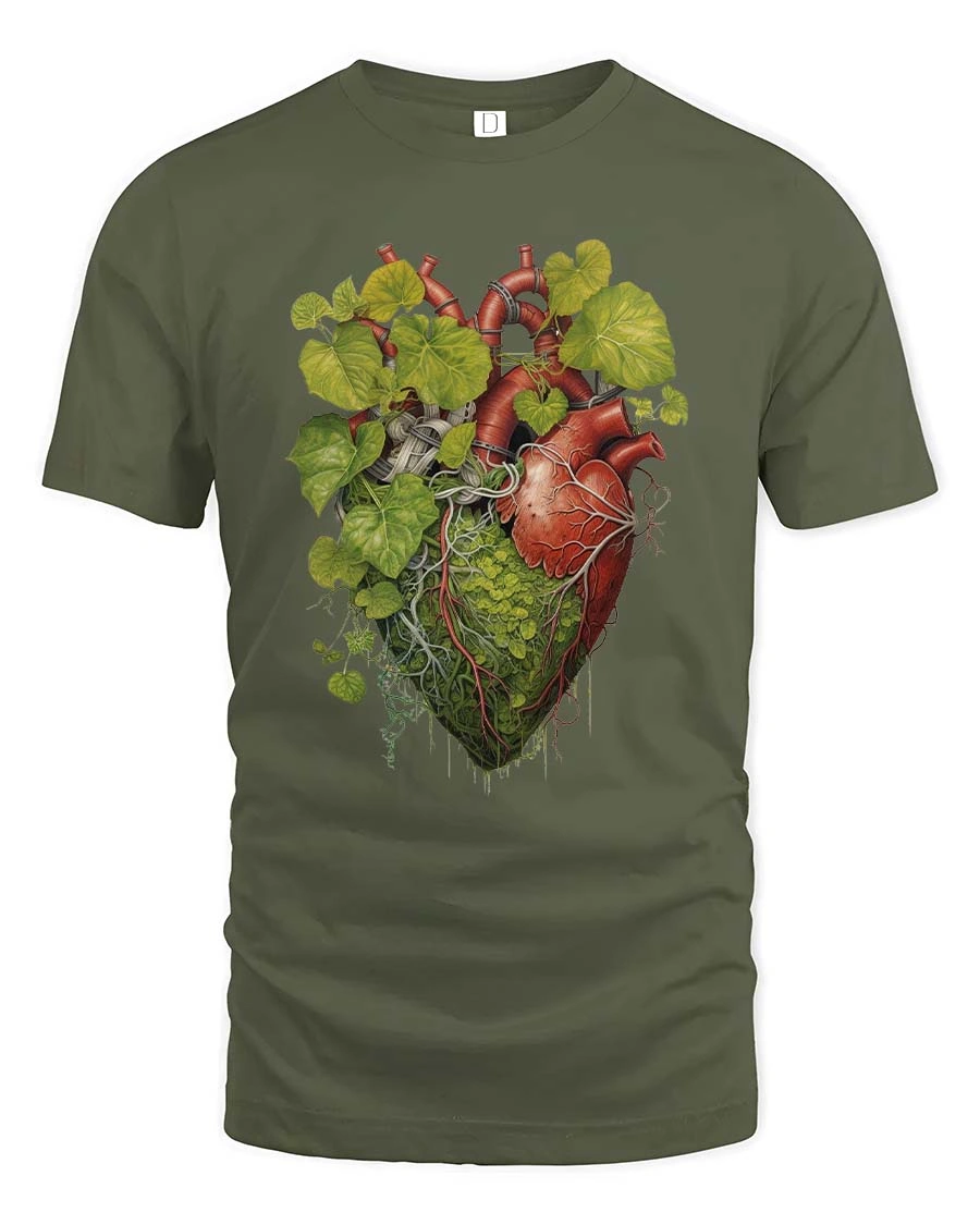 Featuring a detailed anatomical heart intertwined with lush green leaves and organic roots, this graphic tee symbolizes the connection between life, growth, and the natural world.