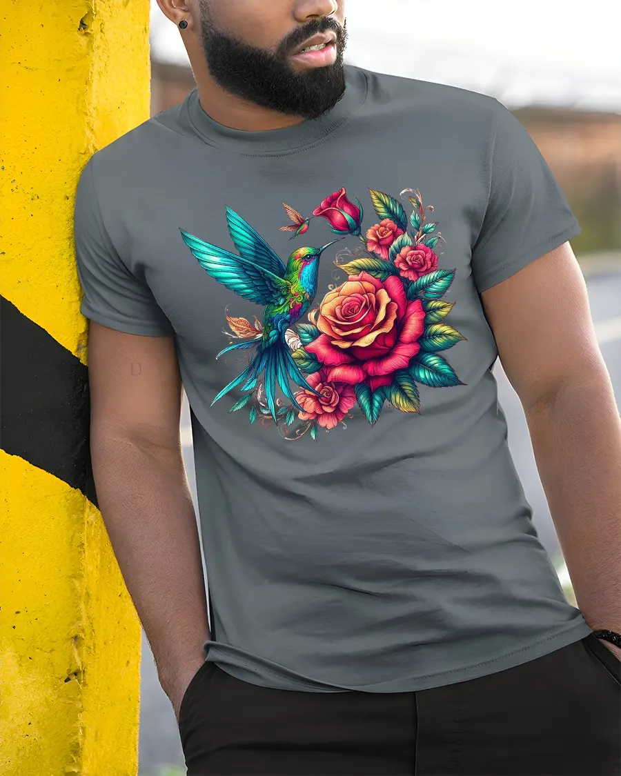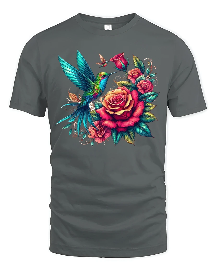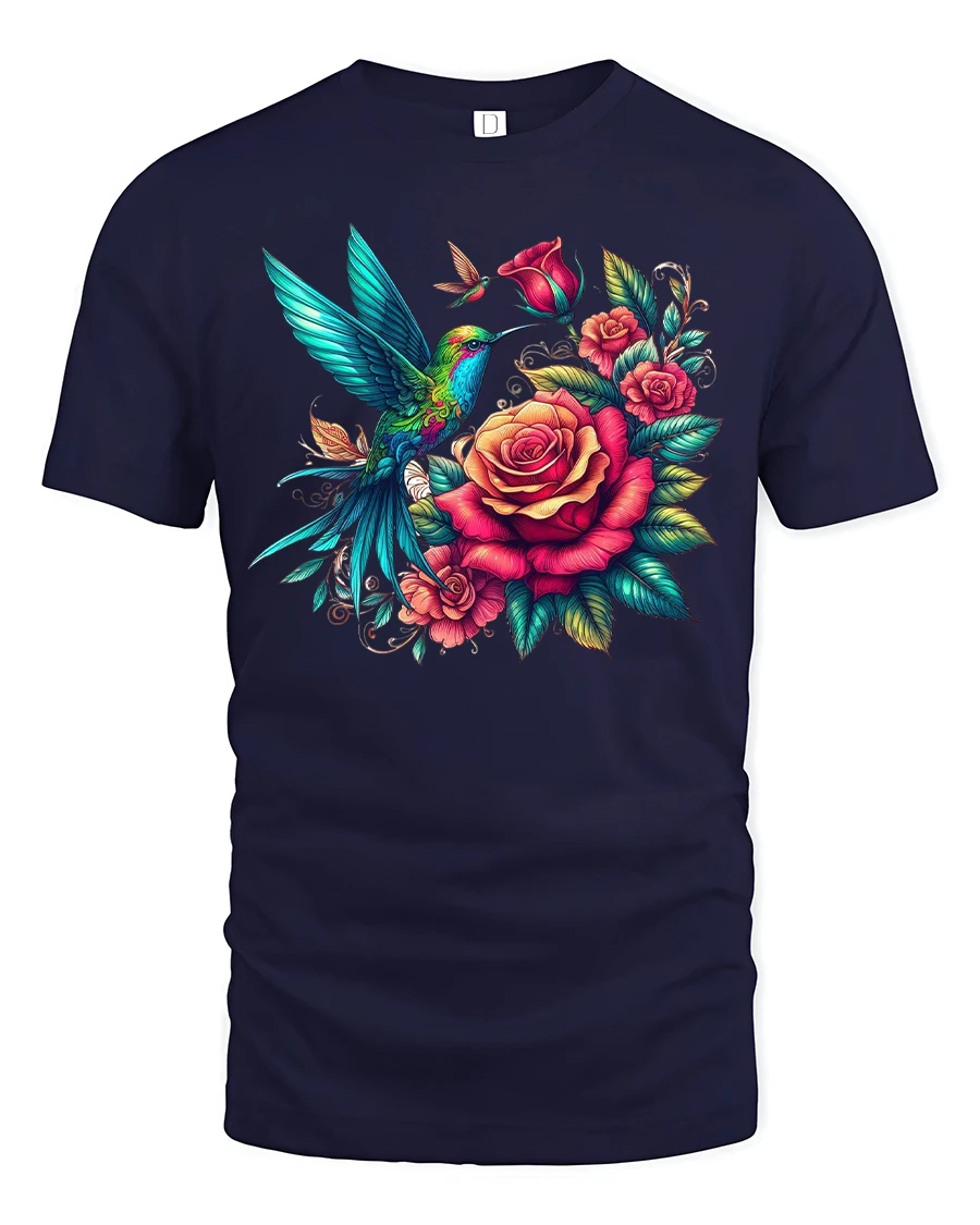 Celebrate the beauty of the outdoors and the magic of hummingbirds with a tee that captures both color and serenity in one artistic design.