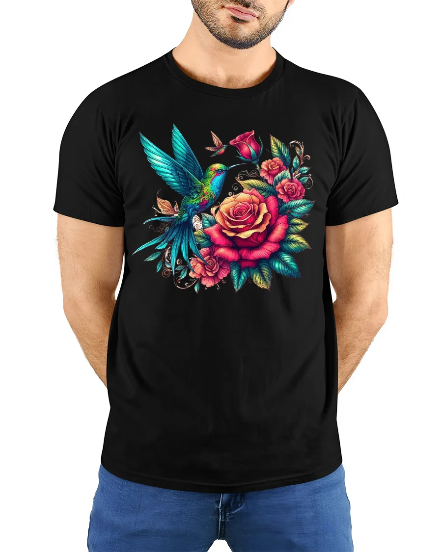 This Hummingbird Rose Garden Tee – Vibrant Floral Nature Art Tshirt brings a burst of color, elegance, and natural beauty to your everyday wardrobe. Featuring a stunning hummingbird hovering gracefully among a bouquet of detailed roses and floral elements, this design blends vivid colors with artistic charm.