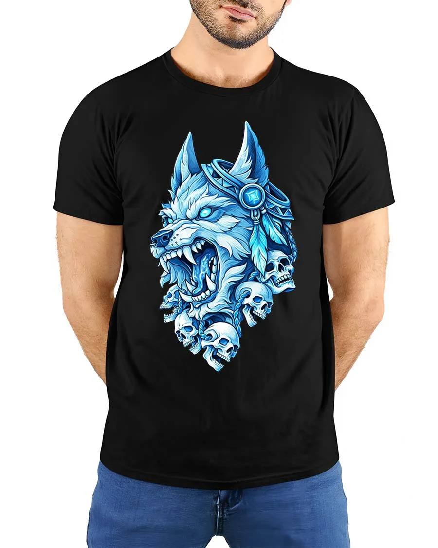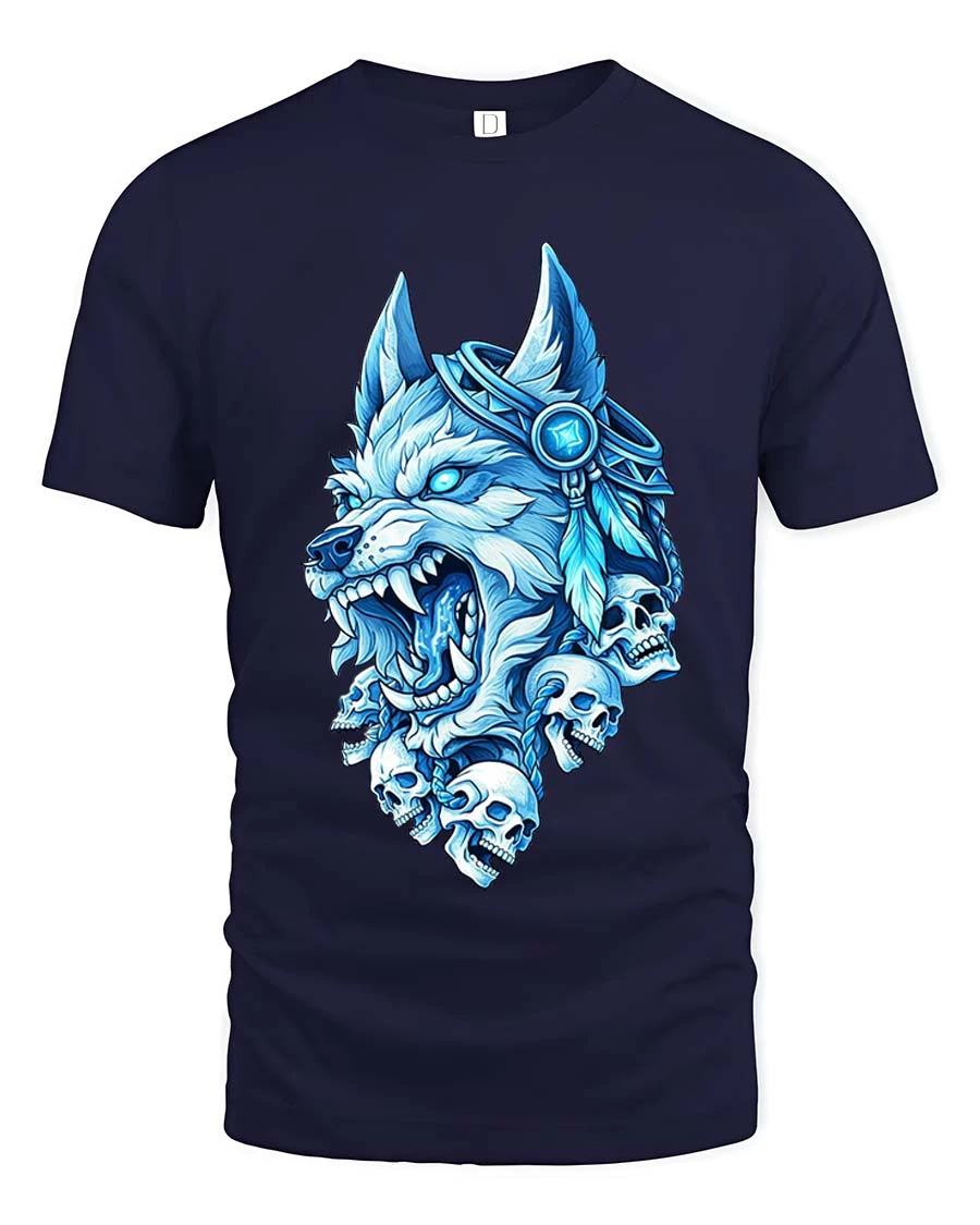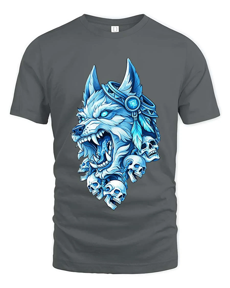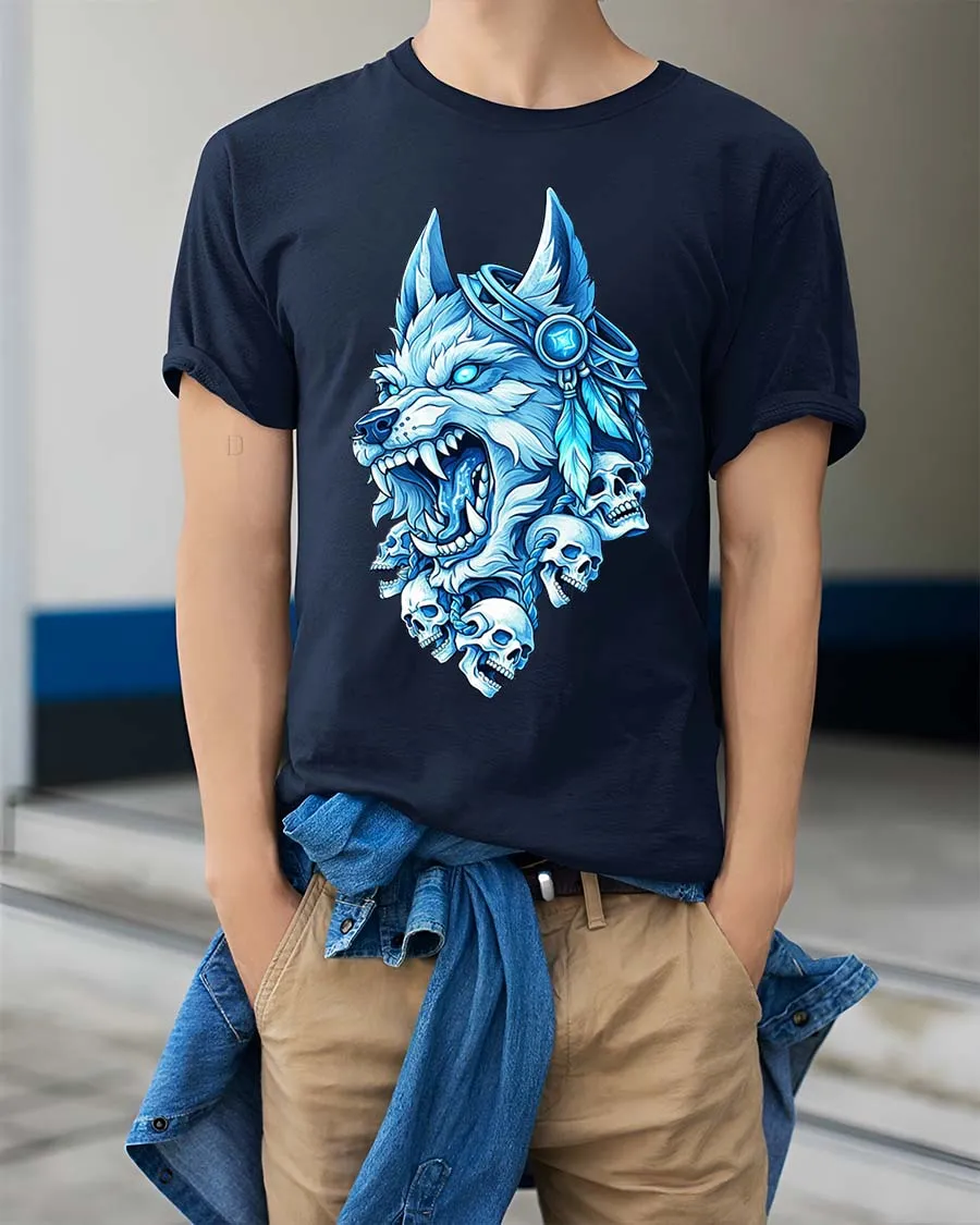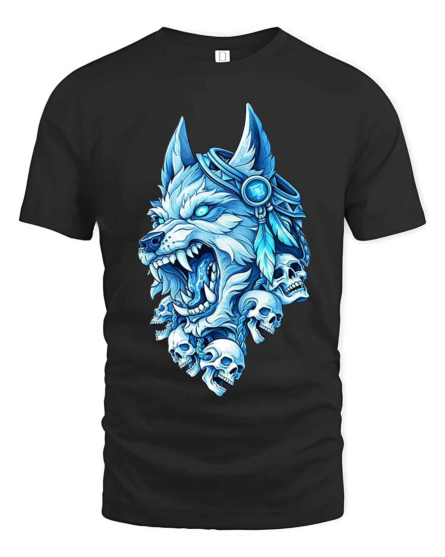 Ice Wolf Skull Graphic T Shirt Fierce Mythical Animal Tee showcases a striking design that blends the power of a roaring wolf with haunting skull elements.