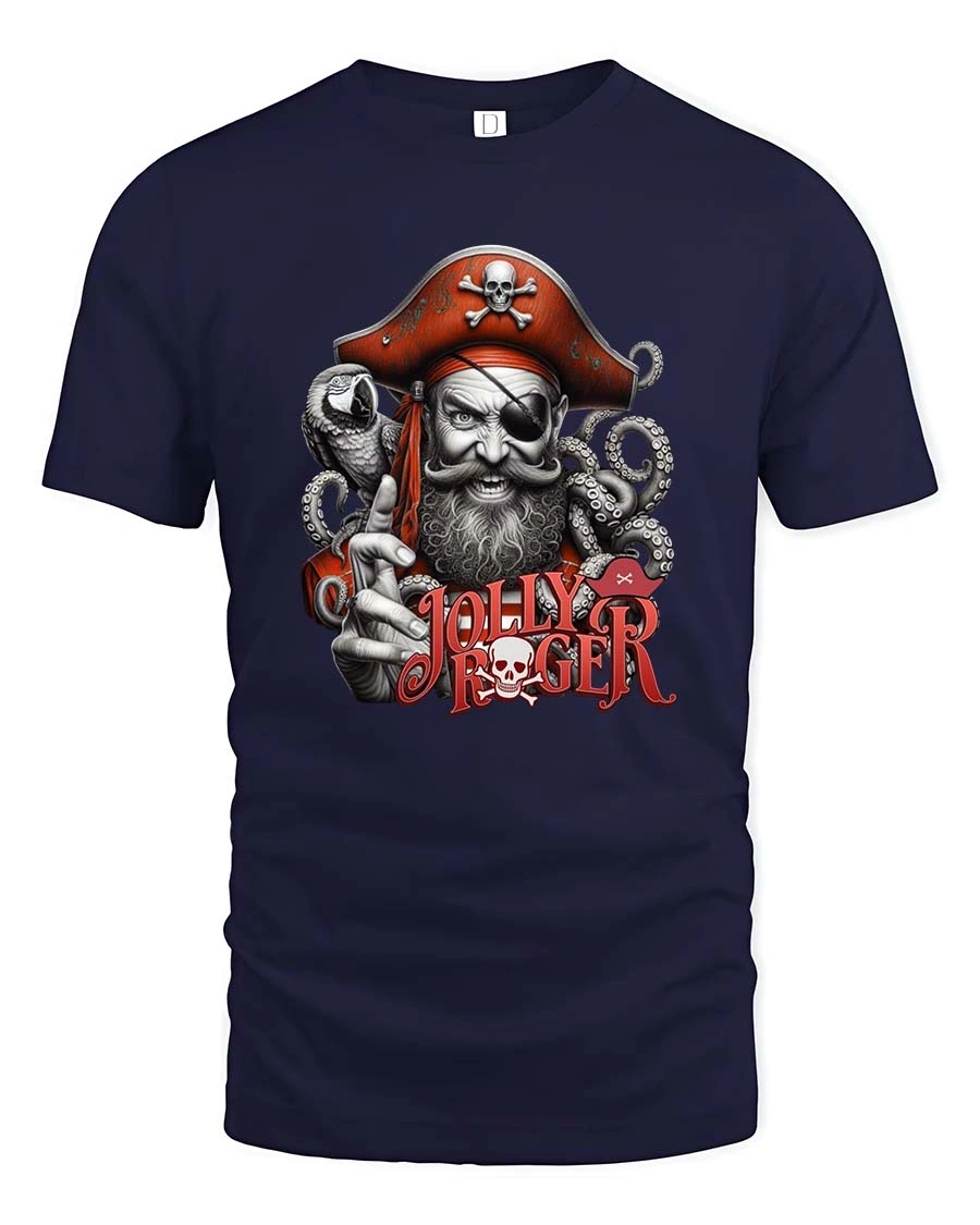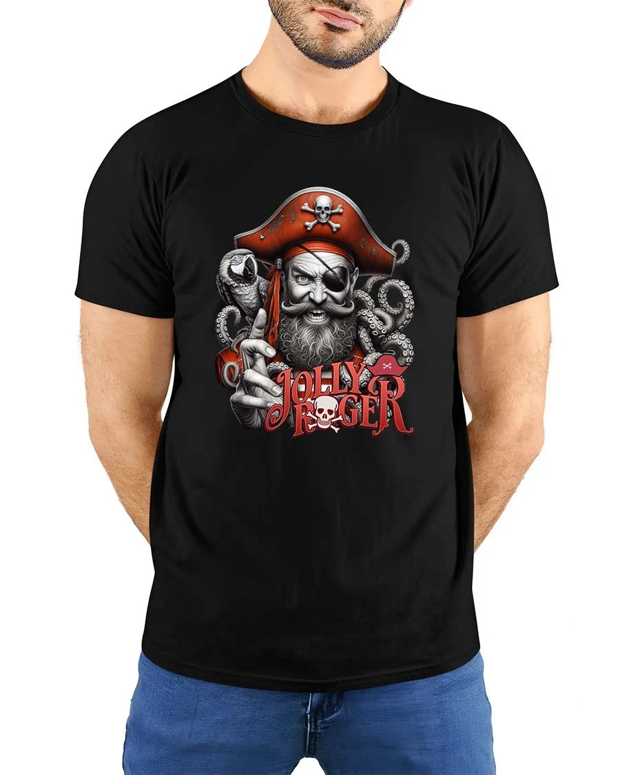 The Jolly Roger Pirate Captain Skull Graphic T Shirt stands out with its highly detailed illustration and strong nautical character.