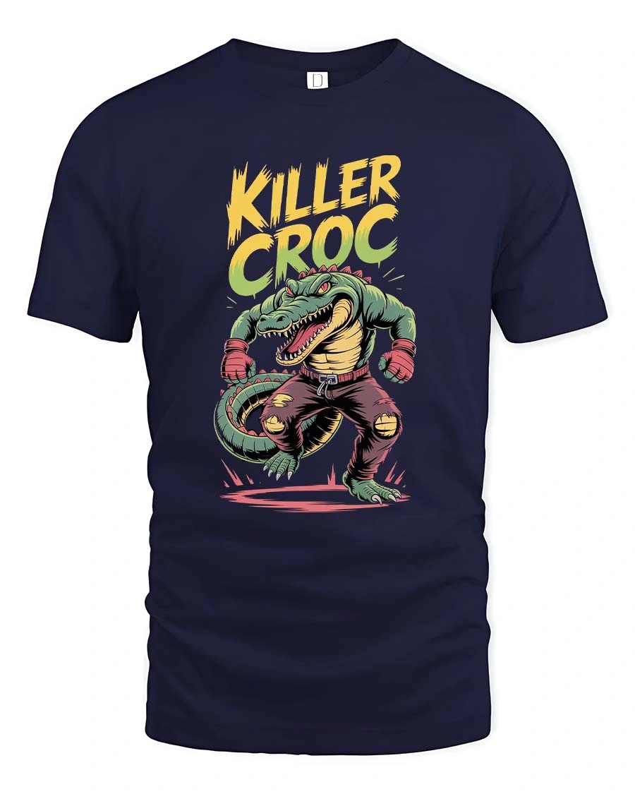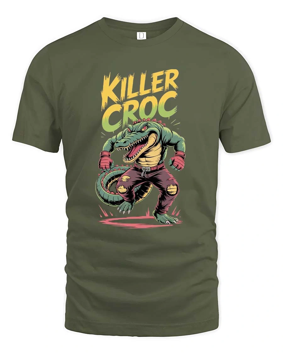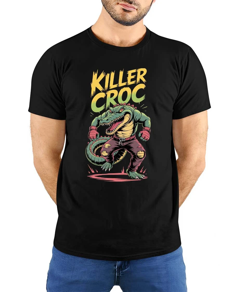 The dynamic artwork features strong comic-style lines, vibrant colors, and a gritty urban vibe that makes the design stand out on any tee. The “Killer Croc” lettering above the character adds an edgy streetwear feel, perfect for fans of monster art, fighters, and bold graphic designs.