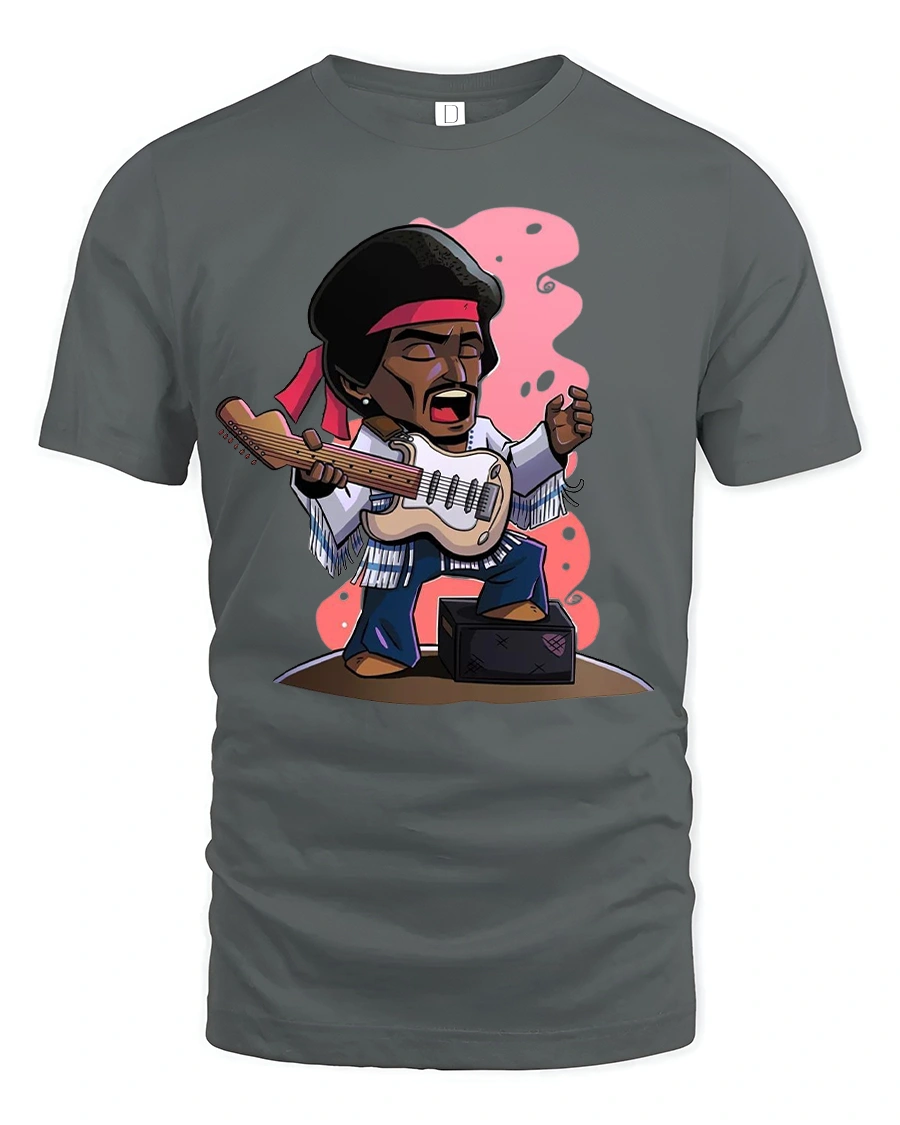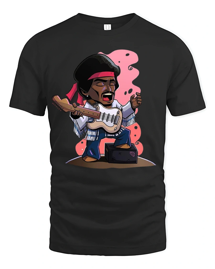 Featuring a bold cartoon guitarist mid performance this design brings powerful stage presence and expressive style into a playful illustrated form.