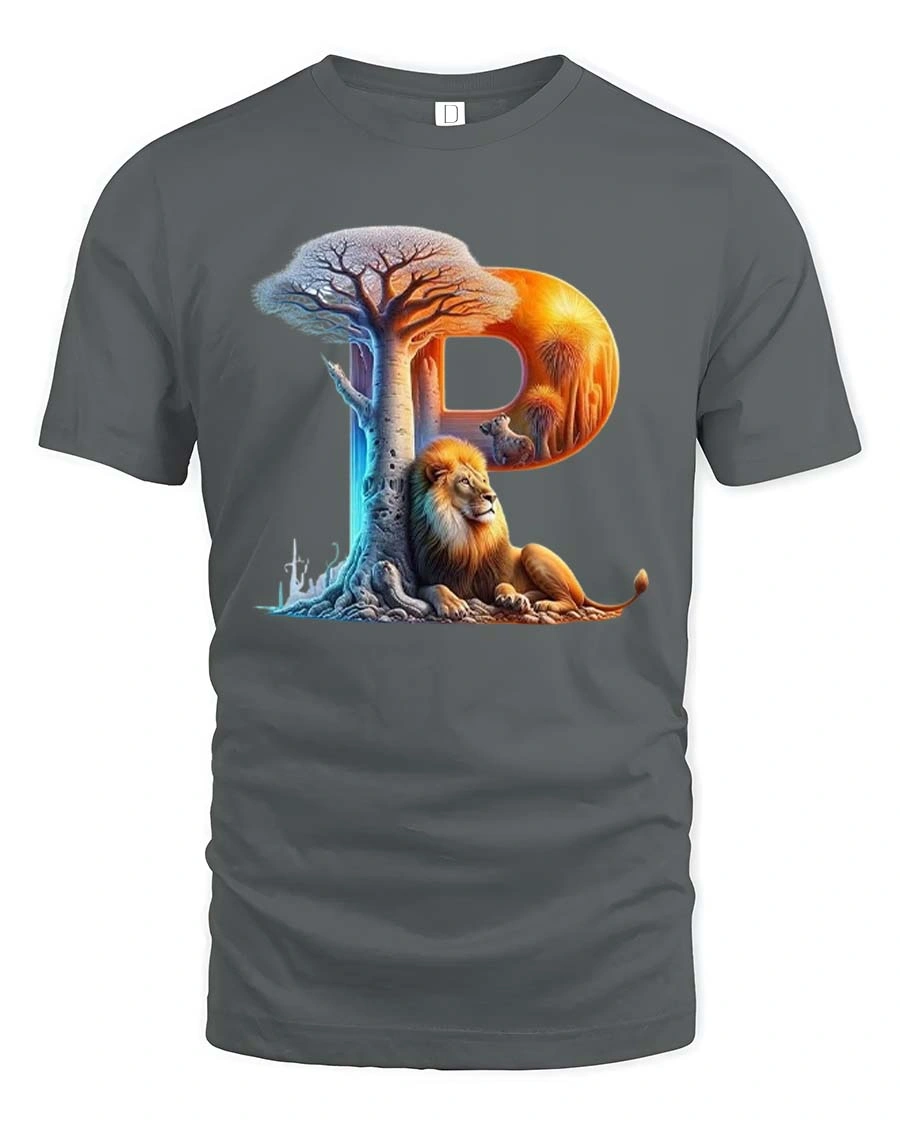 Featuring a beautifully illustrated lion resting beneath a tree integrated into the letter P, this graphic tee blends nature, creativity, and symbolism into one striking visual.