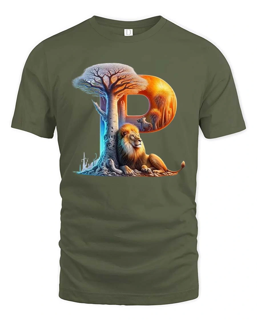 Letter P Lion Tree Nature Scene Graphic T Shirt Artistic Style - military green t-shirt on white background