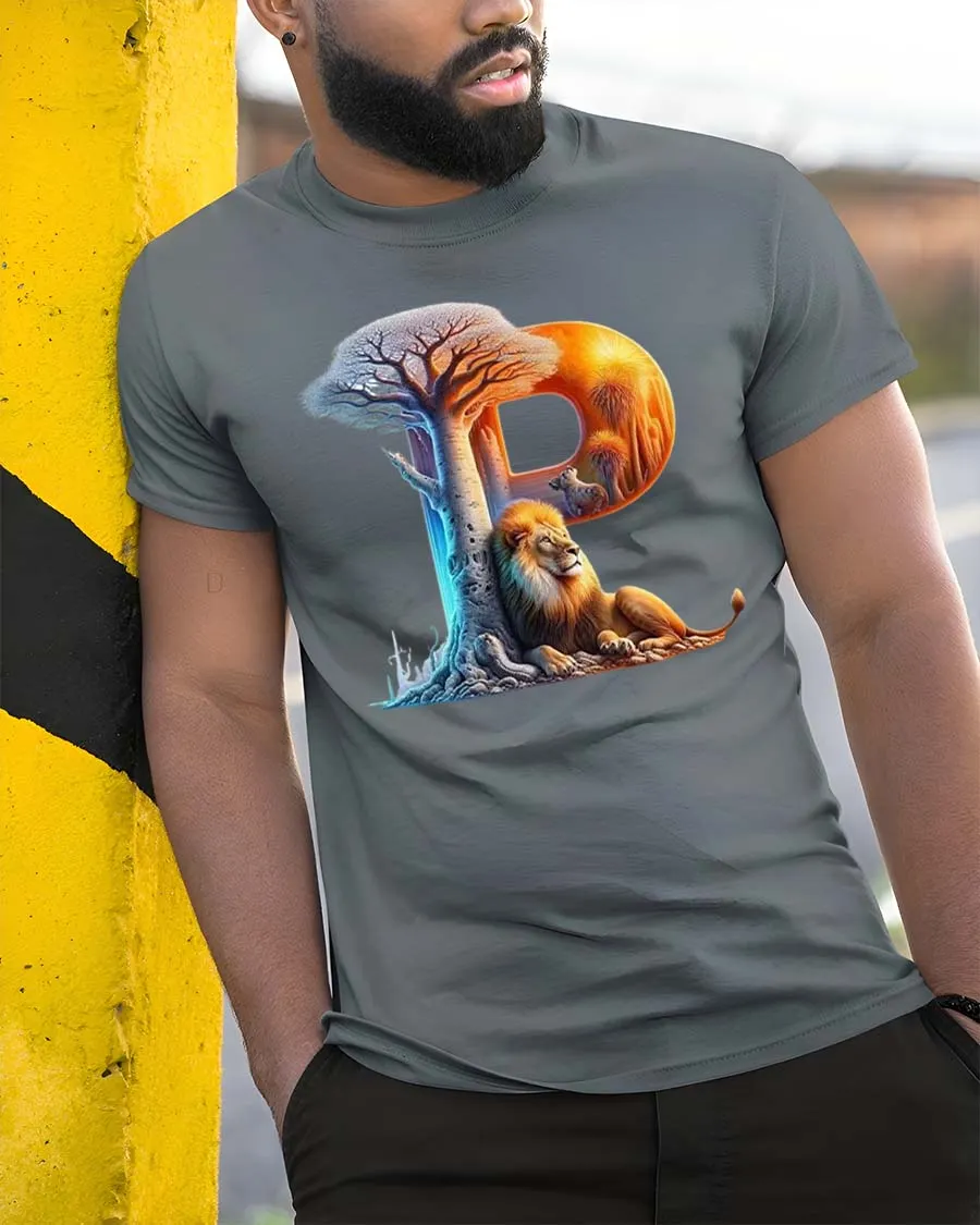 Letter P Lion Tree Nature Scene Graphic T Shirt Artistic Style - model wearing grey tee, leaning on column