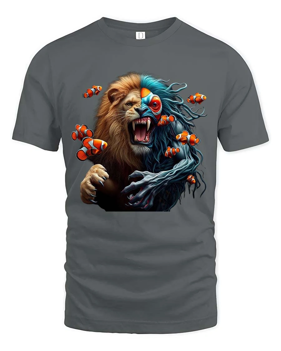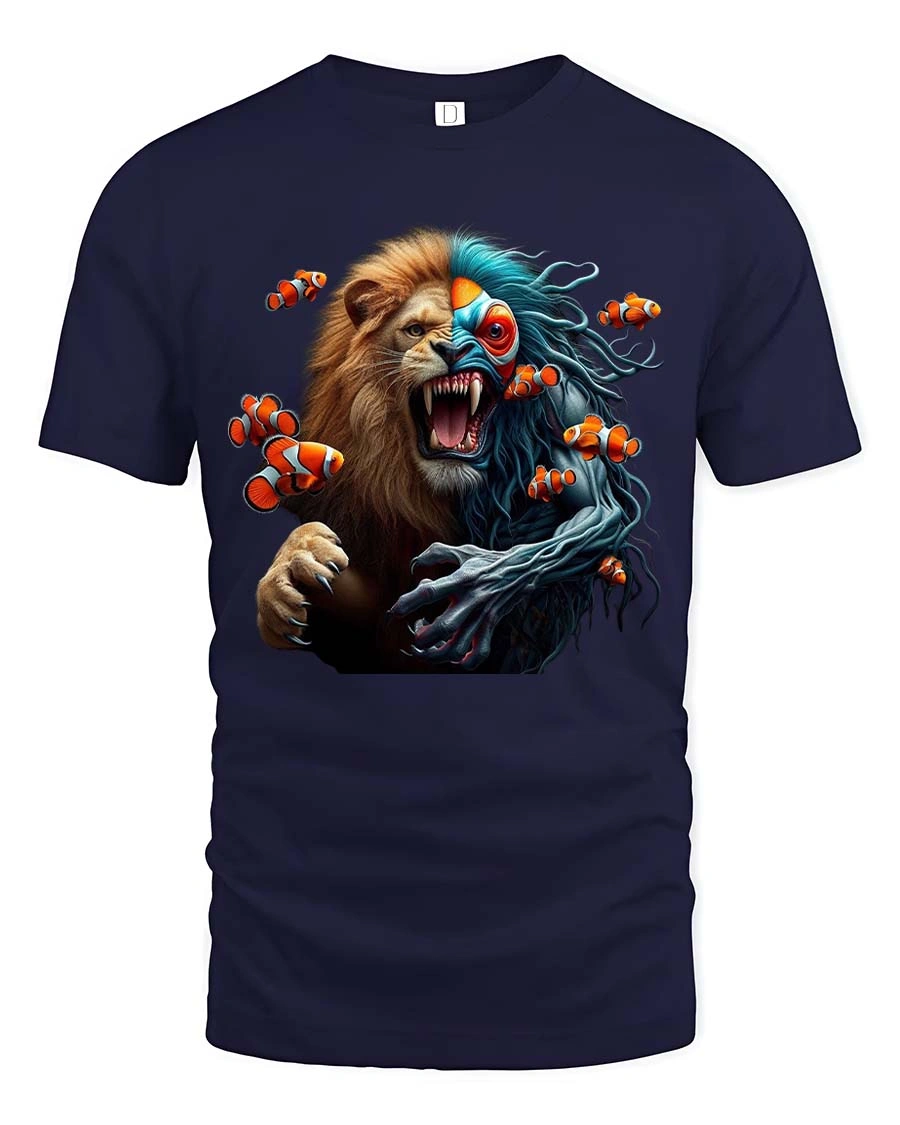 This design combines the fierce energy of a roaring lion with the vibrant colors of ocean life creating a surreal and eye catching visual.