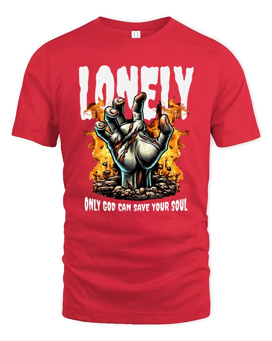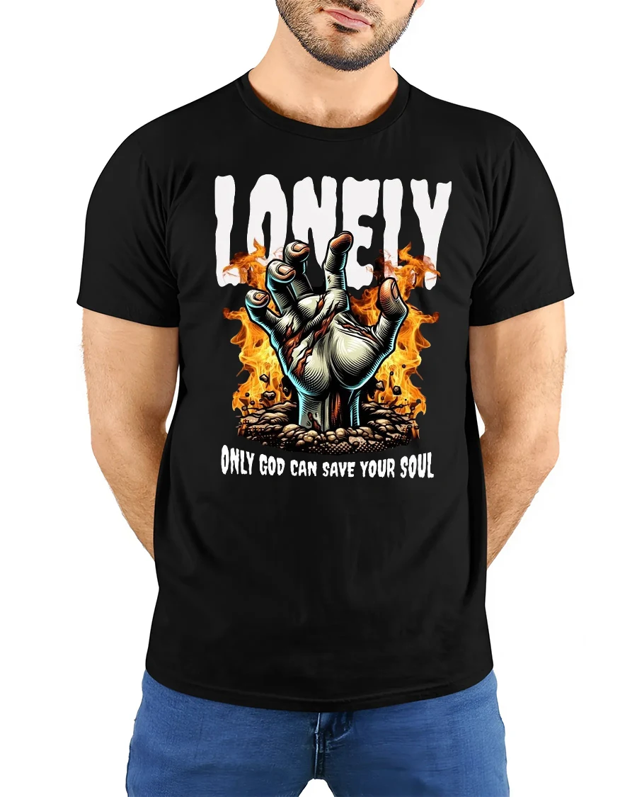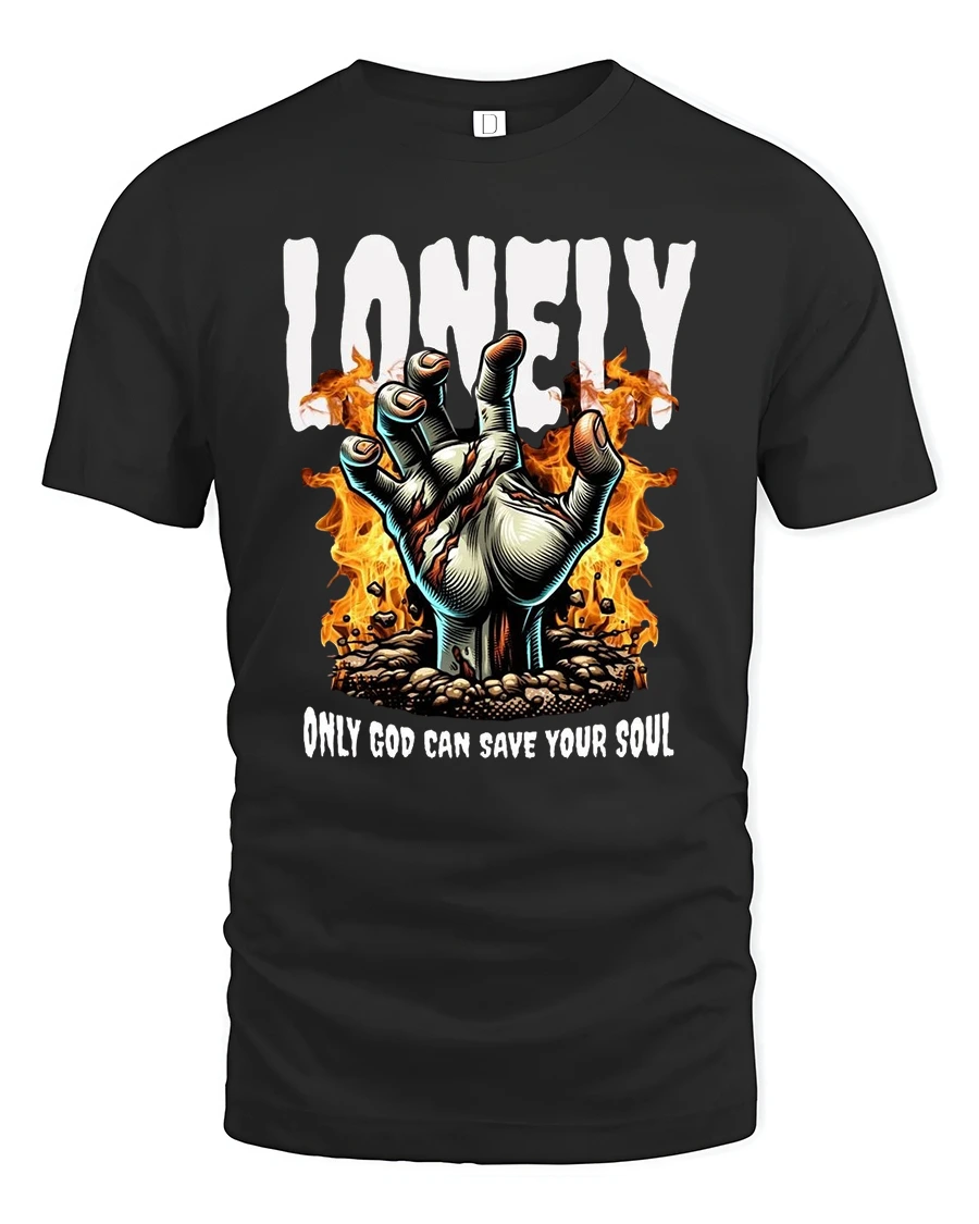 Embrace a bold and edgy statement with the Lonely Hand of Fire Graphic Tee Spiritual Streetwear. Featuring a dramatic flaming hand reaching upward with the words “Lonely – Only God Can Save Your Soul,” this design combines gothic inspiration with deep spiritual undertones. It’s a striking look that blends faith, art, and rebellion in one unique piece.