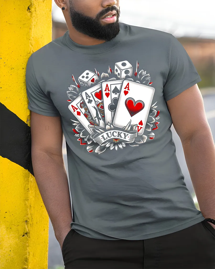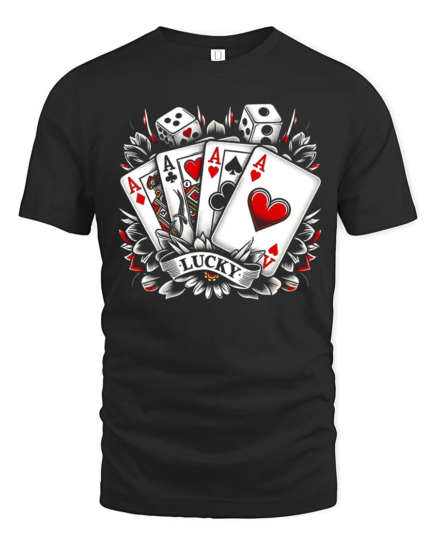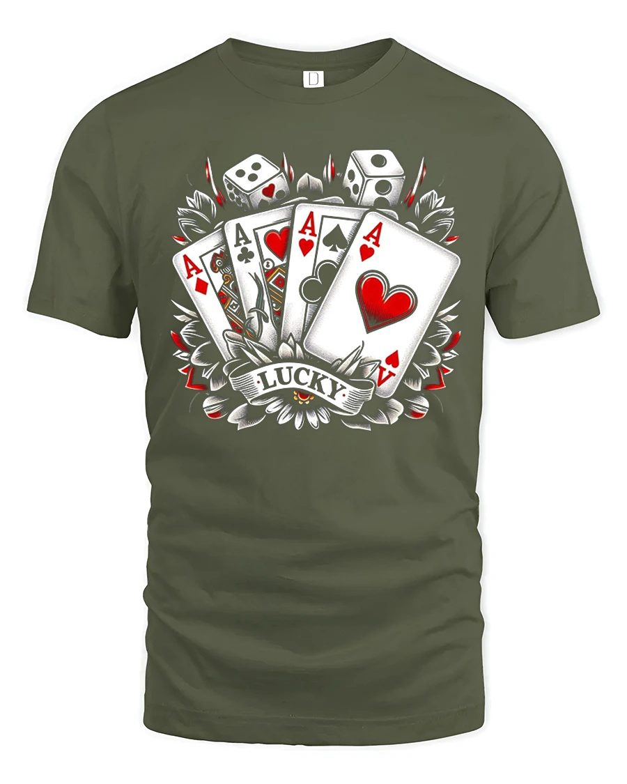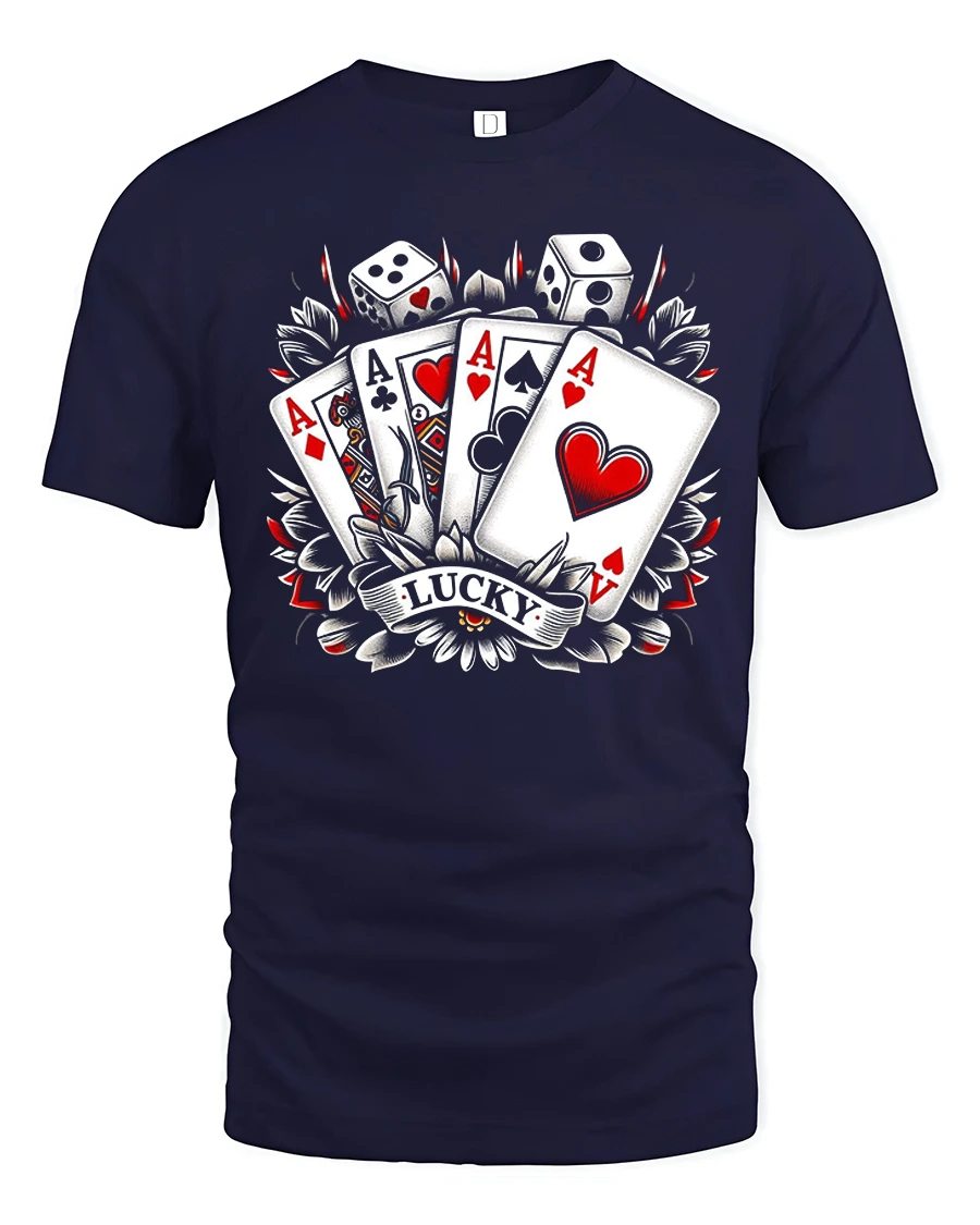 This poker themed tee blends vintage gambling aesthetics with modern comfort.