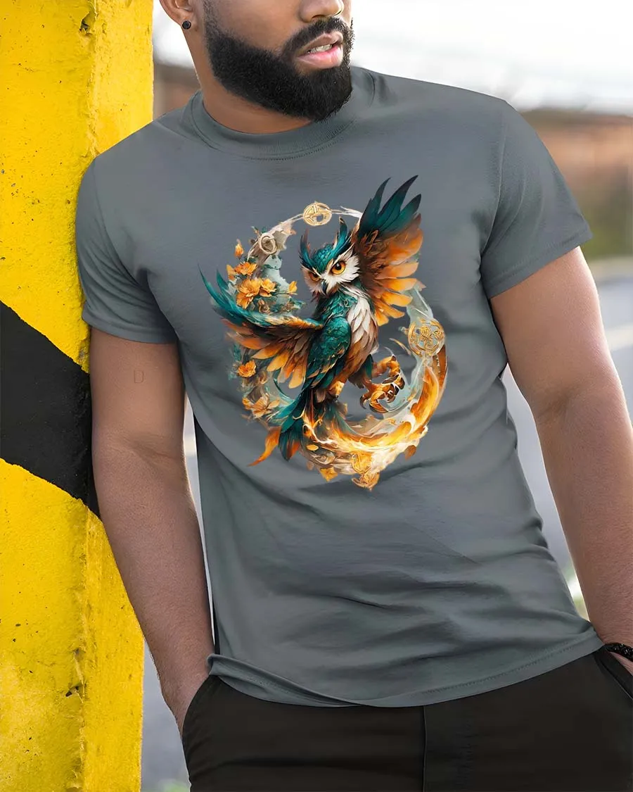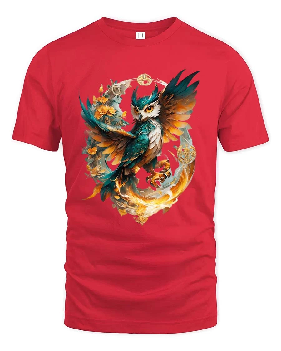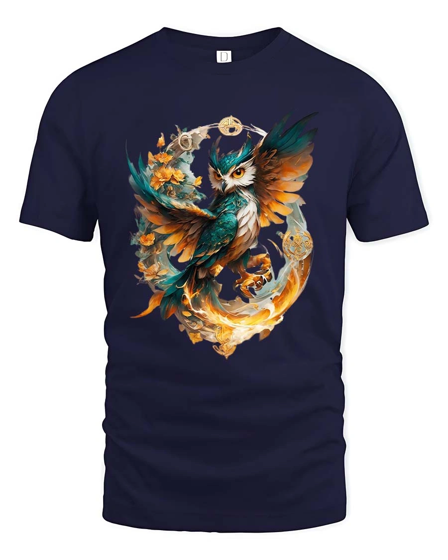Magical Owl Flame Circle Tshirt Artistic Fantasy Bird Design blends elegance and fantasy into a captivating visual design.