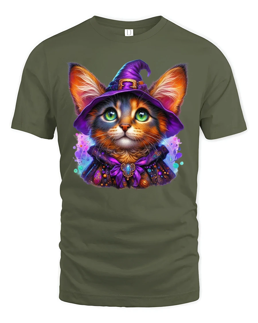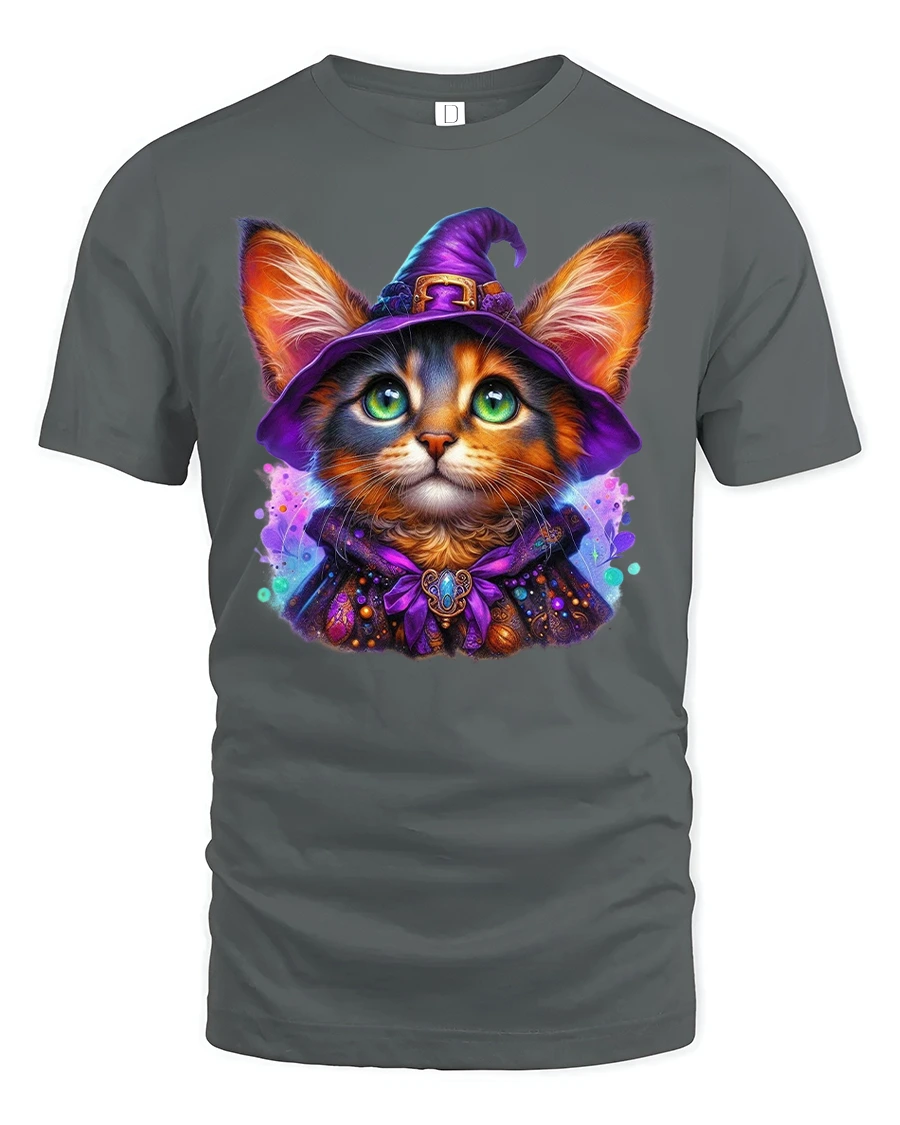 Featuring a glowing-eyed cat dressed as a witch with a purple hat and cloak, this tee brings out your love for Halloween, cats, and all things magical.